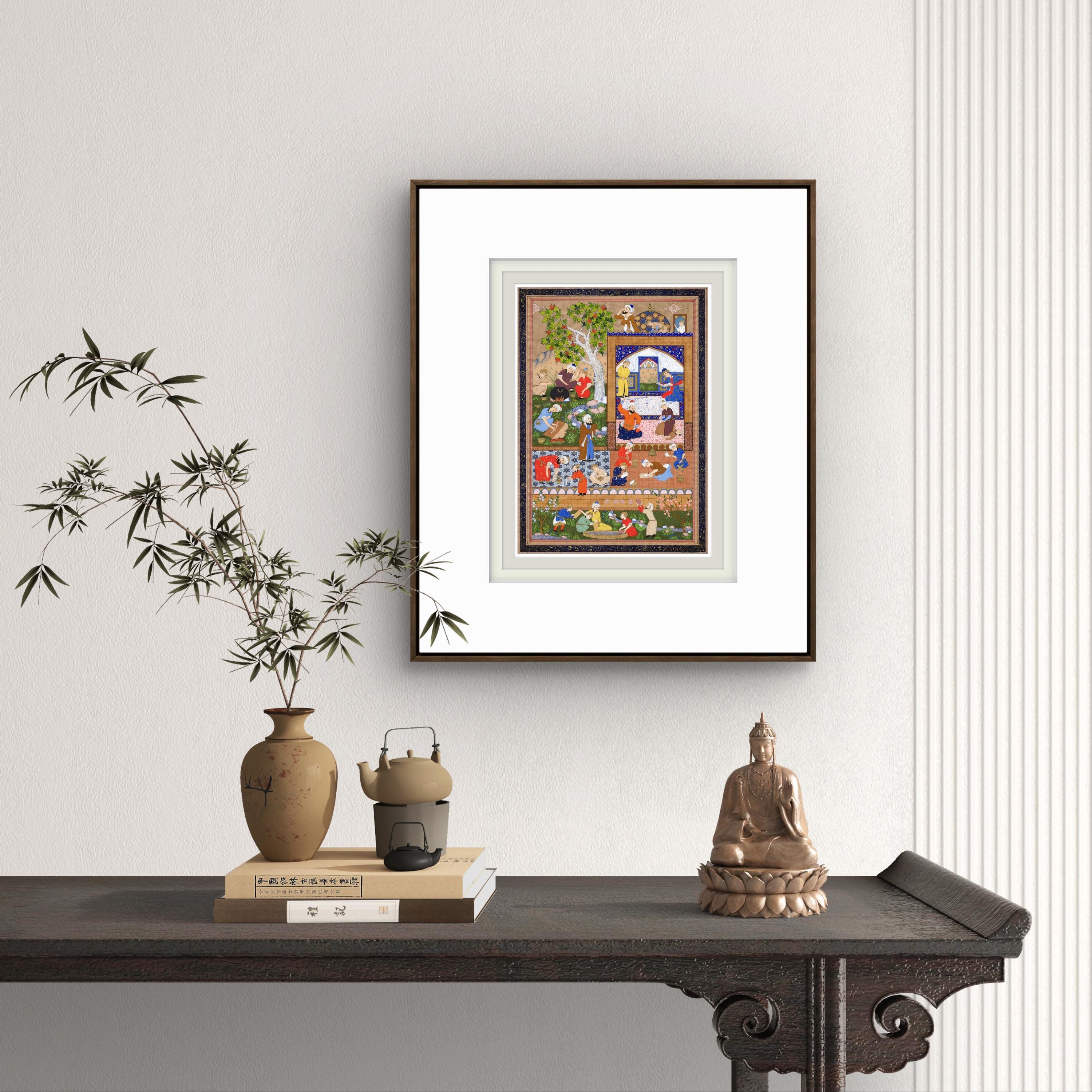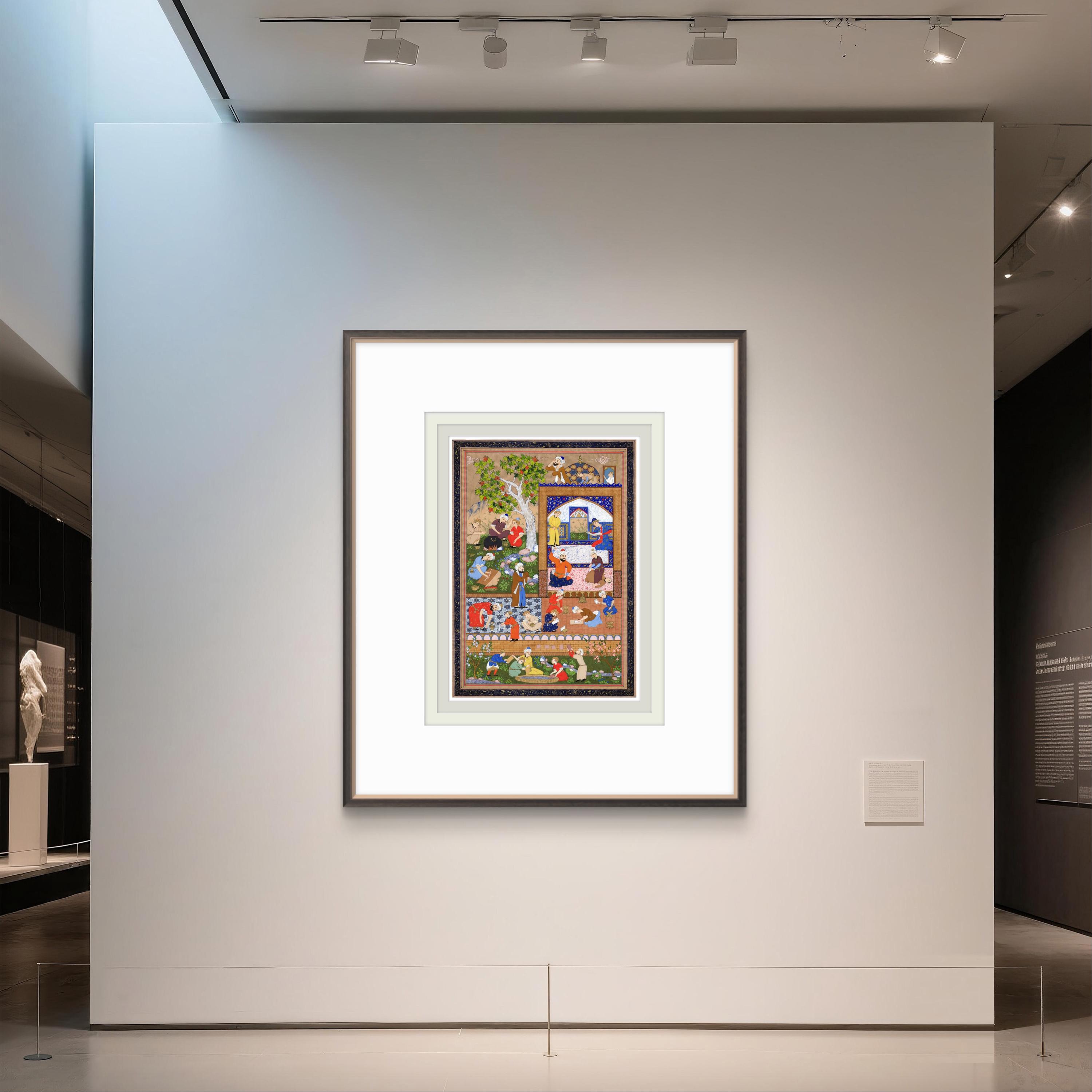 An inscription on the rug imparts timeless wisdom: “Rely not upon the place of great men; unless you have prepared the quality of greatness in yourself” (from the Divan of Hafiz), highlighting the philosophical depth woven into the visual story. Every detail—from shoes carefully placed in the niches to colored paper drying in the foreground—demonstrates the precision and artistry characteristic of Safavid manuscript painting.