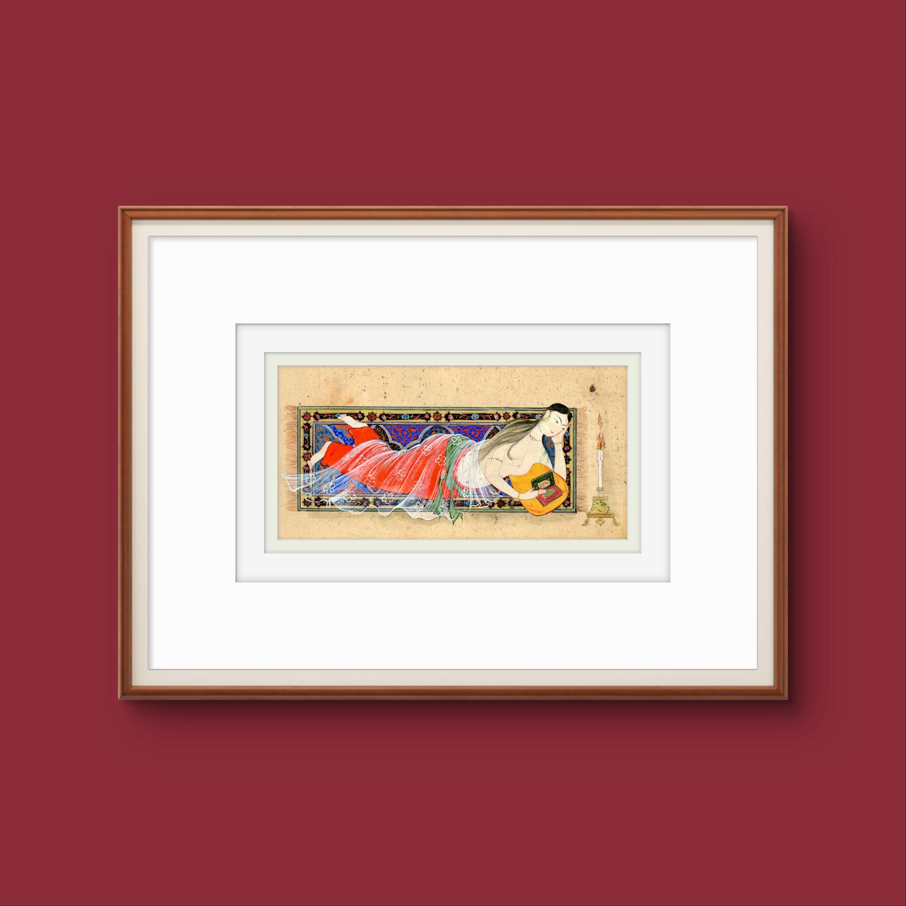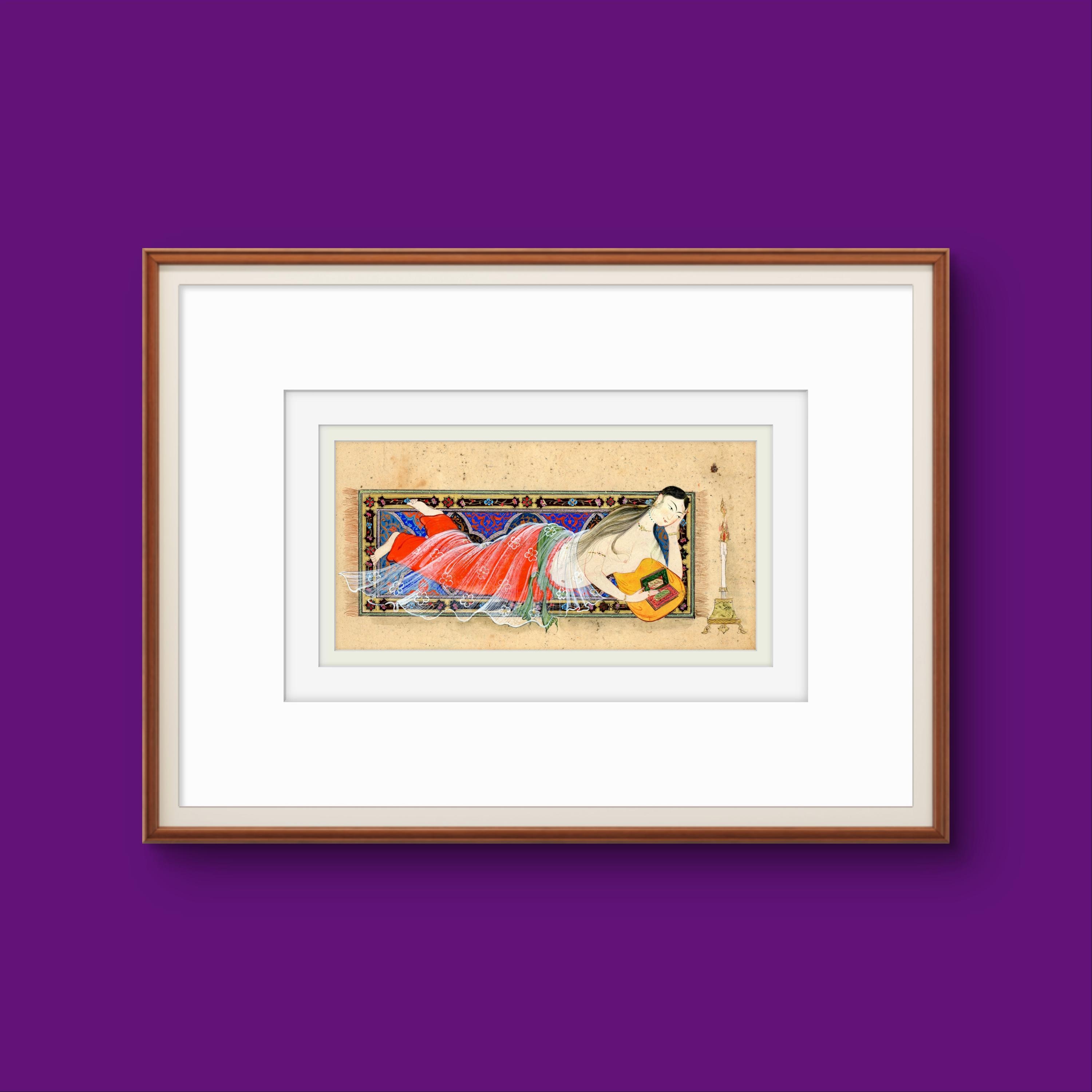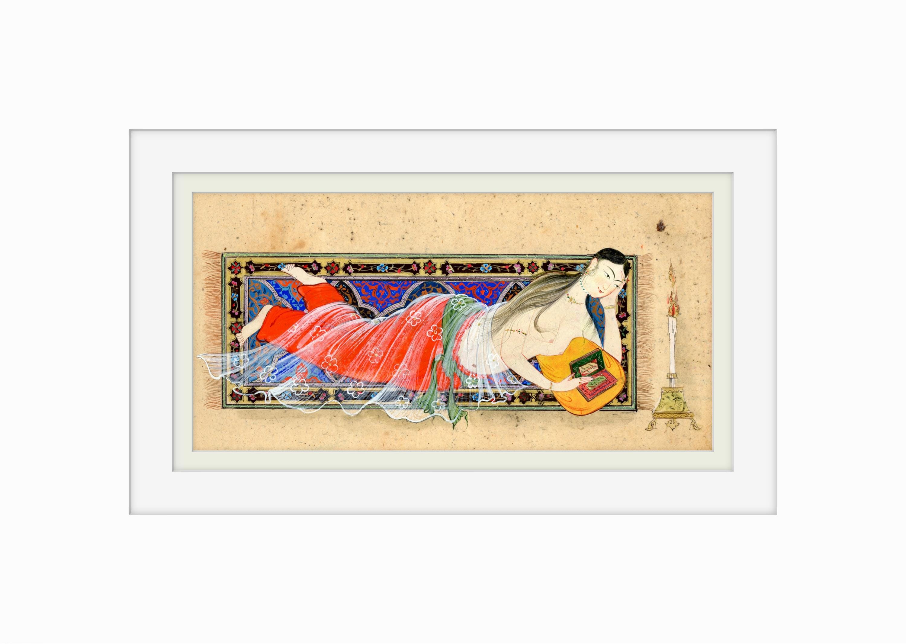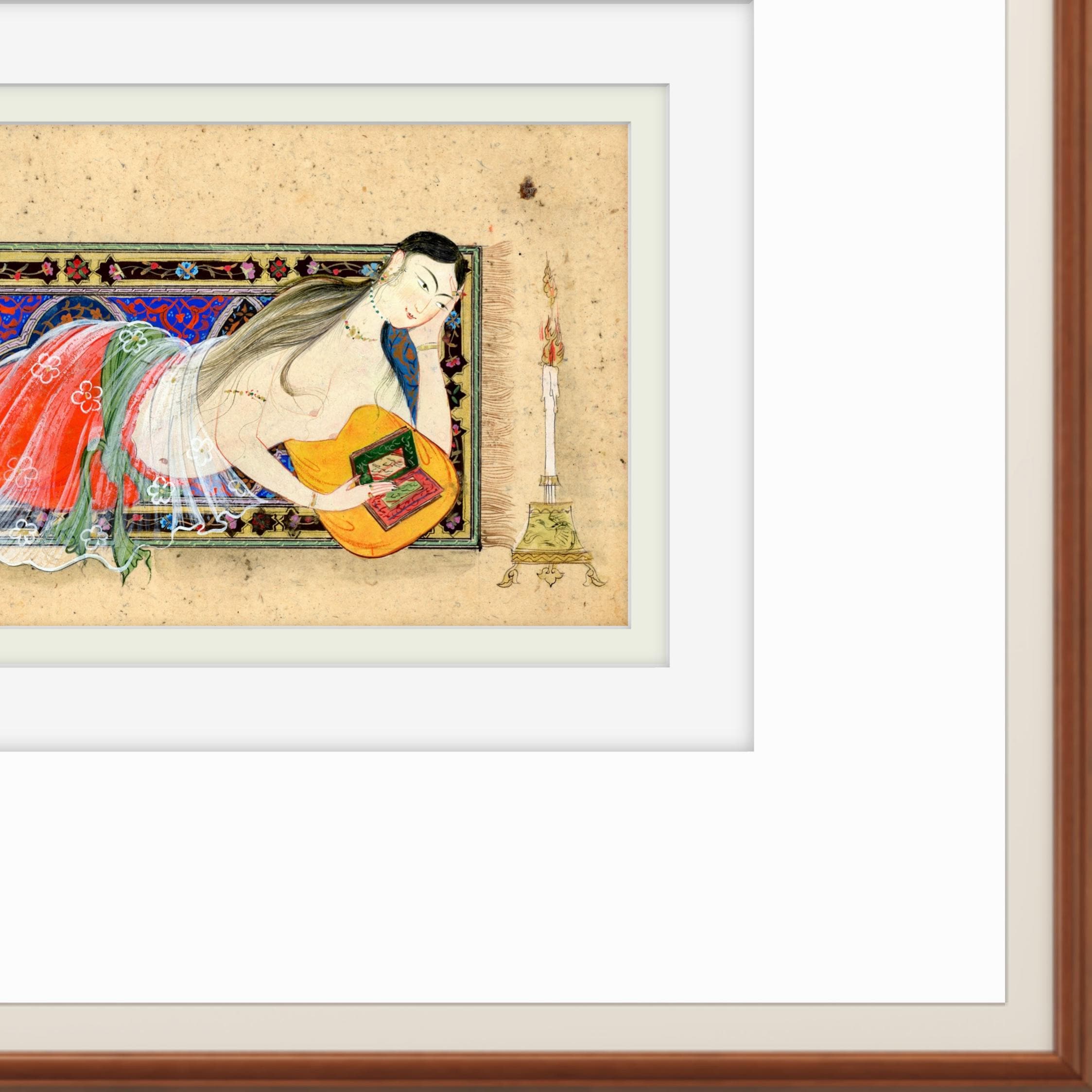 Whispers Beneath the Candlelight - Young Lady Reclining After Bath, Persian Miniature Inspired by Nizami’s Khamsa & Scenes of Timeless Grace