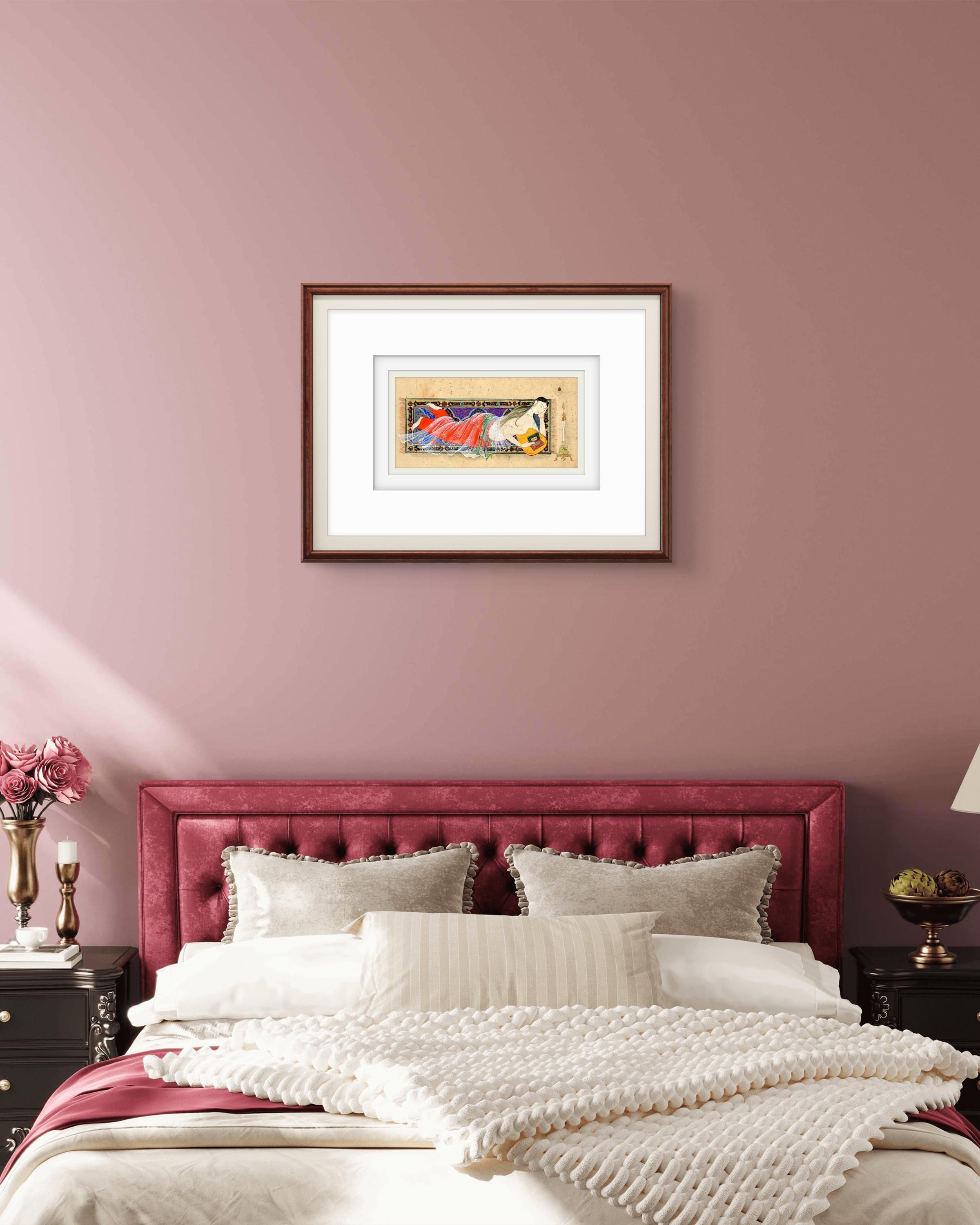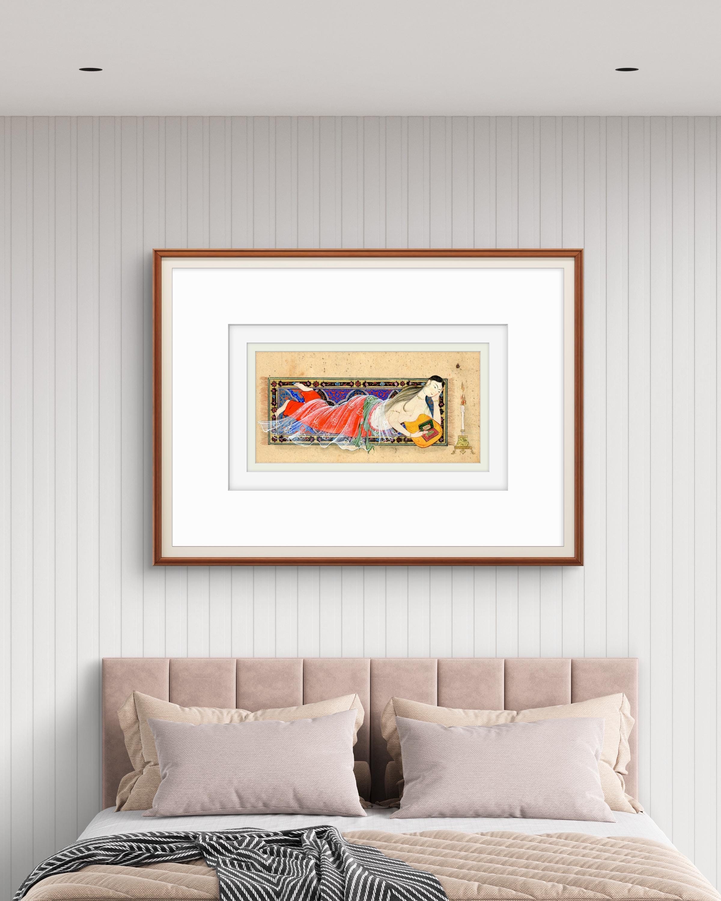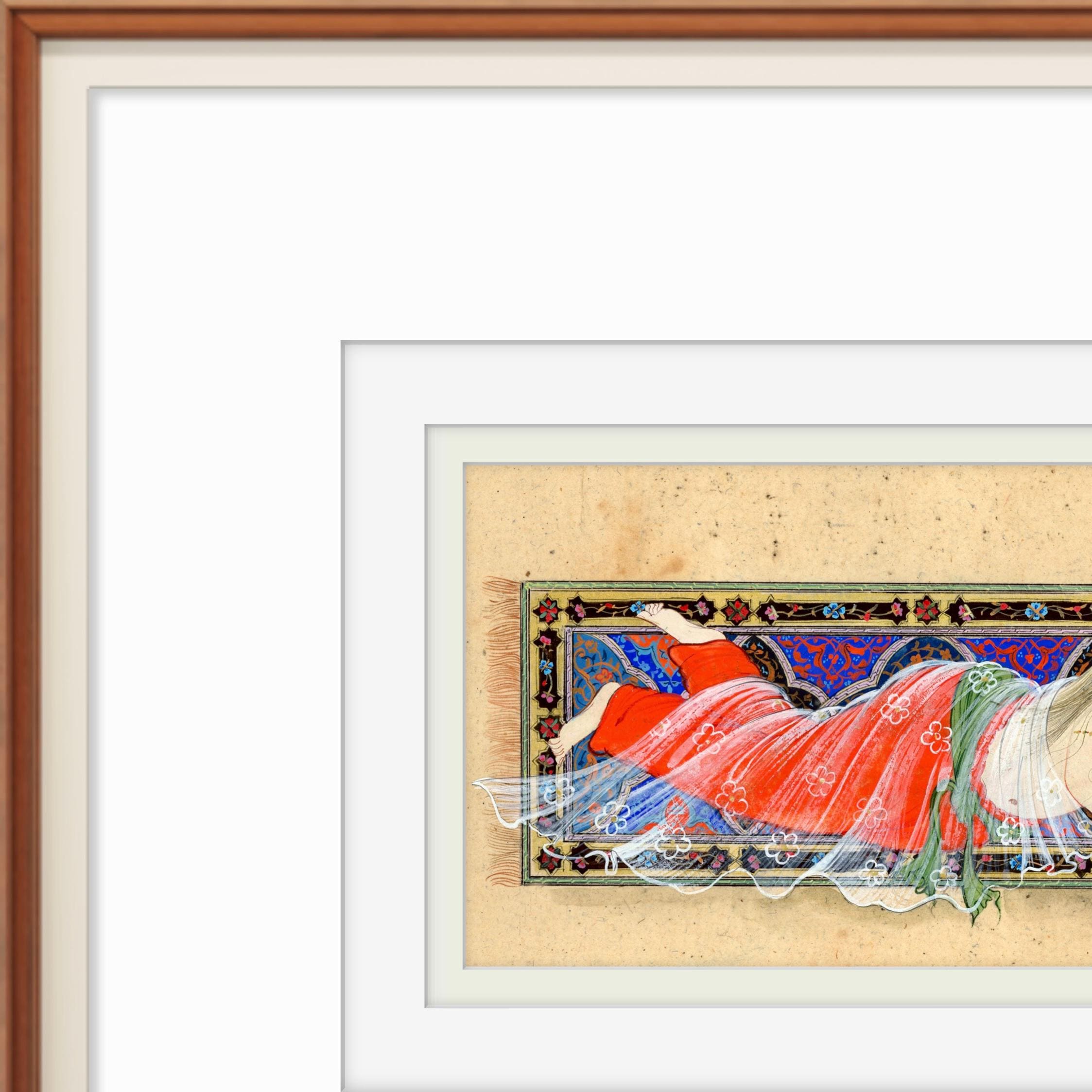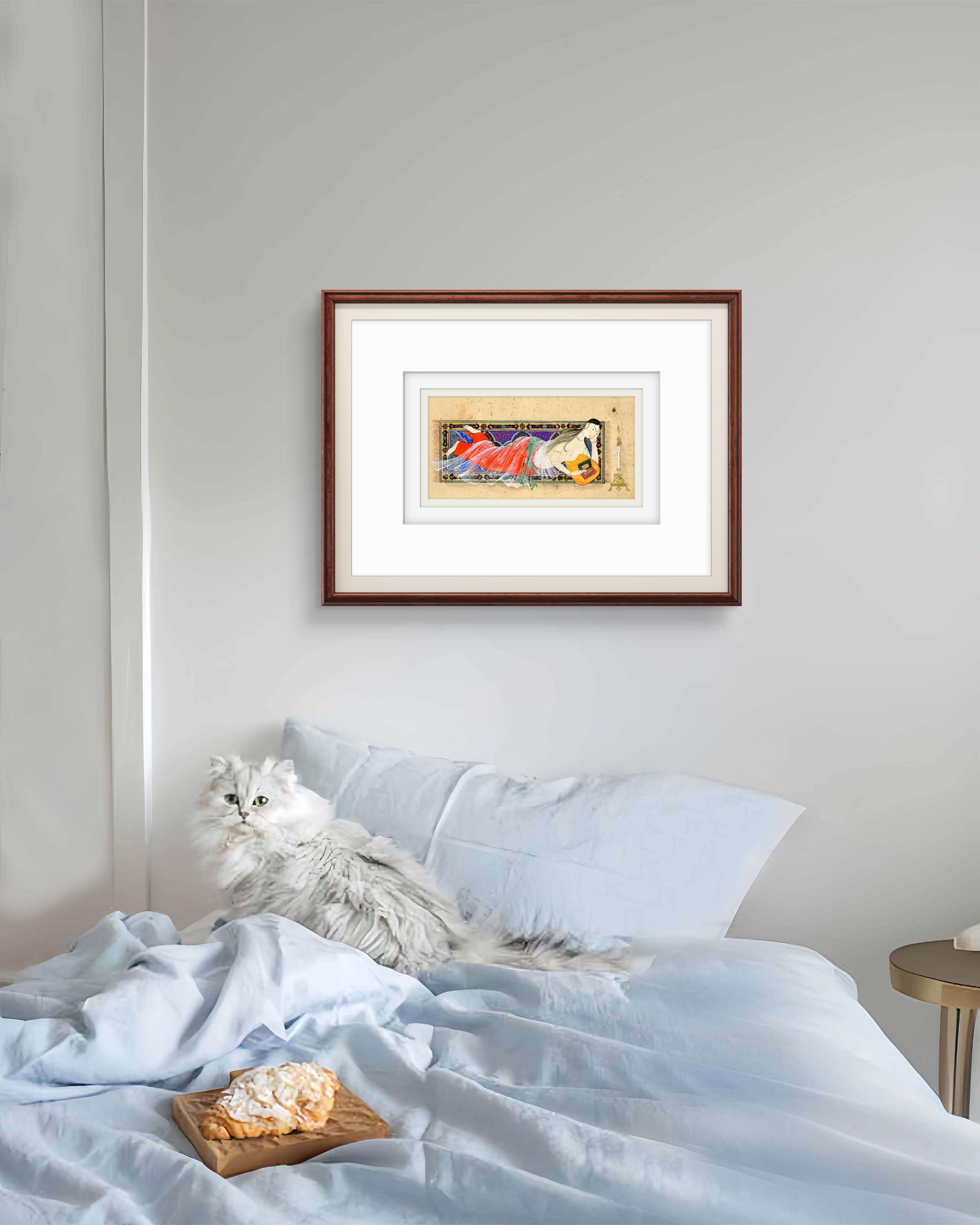Whispers Beneath the Candlelight - Young Lady Reclining After Bath, Persian Miniature Inspired by Nizami’s Khamsa & Scenes of Timeless Grace