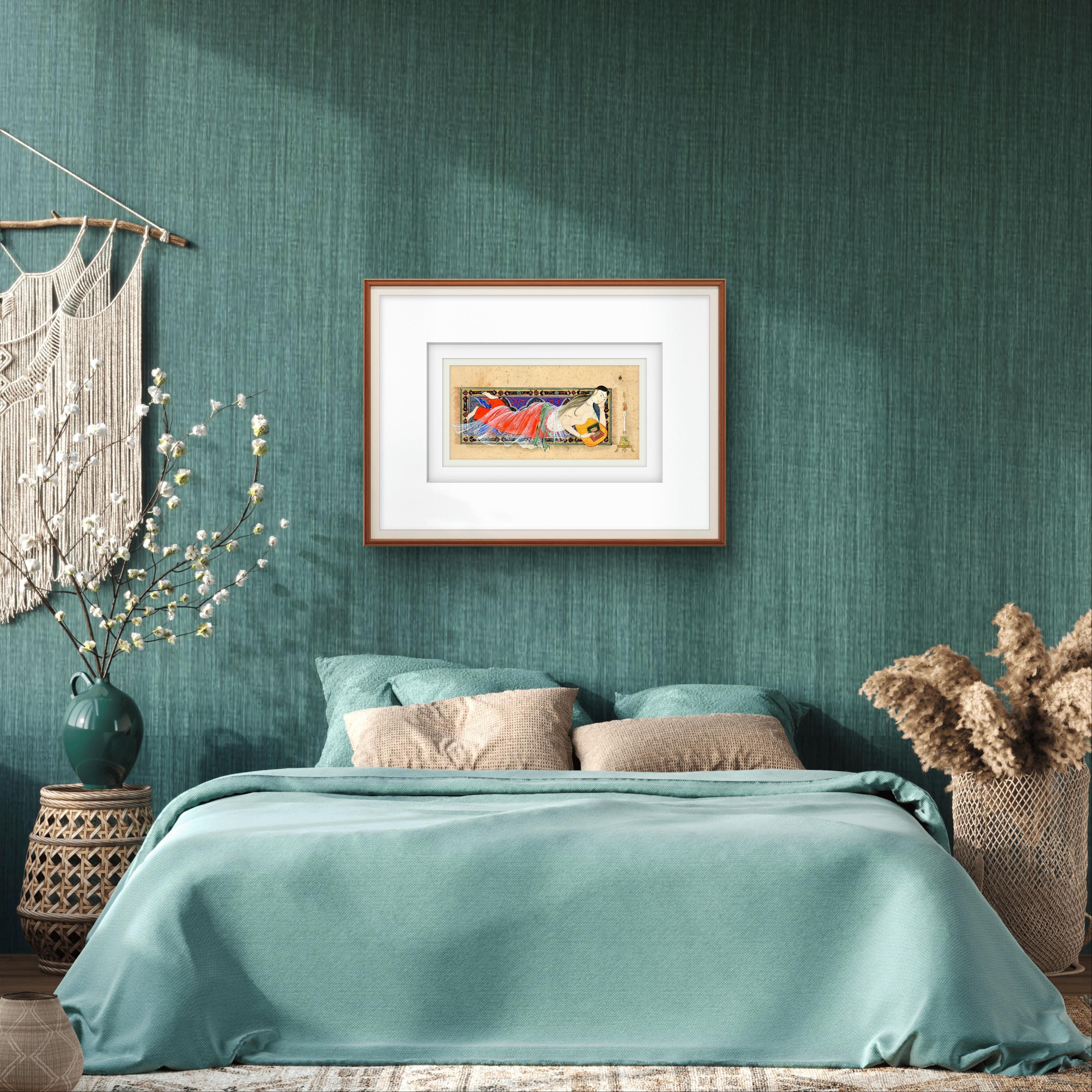 This hand-painted artwork is a refined reproduction inspired by classical Persian miniatures that celebrate beauty, contemplation, and poetic stillness.