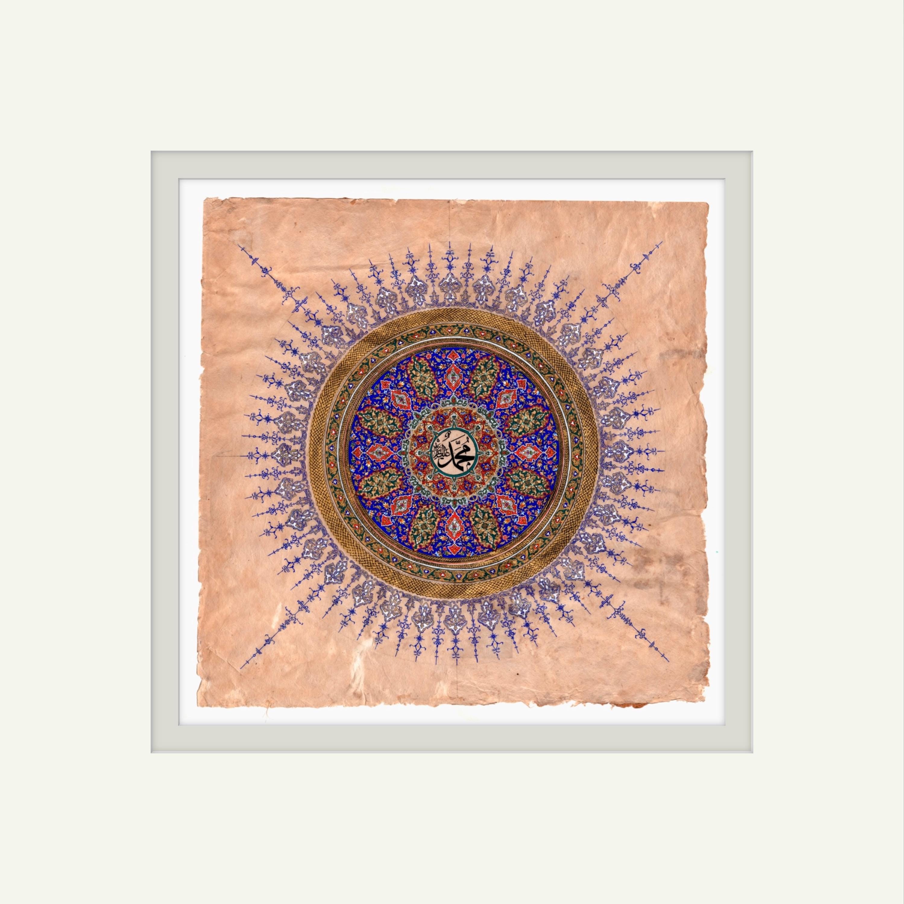 Celebrate the sacred beauty of Prophet Muhammad’s (ﷺ) name with this hand-painted Islamic calligraphy artwork, richly detailed with ornamental Persian-style illumination. The central calligraphy of Muhammad Mustafa ﷺ is surrounded by intricate floral and geometric designs, symbolizing unity, devotion, and divine harmony.