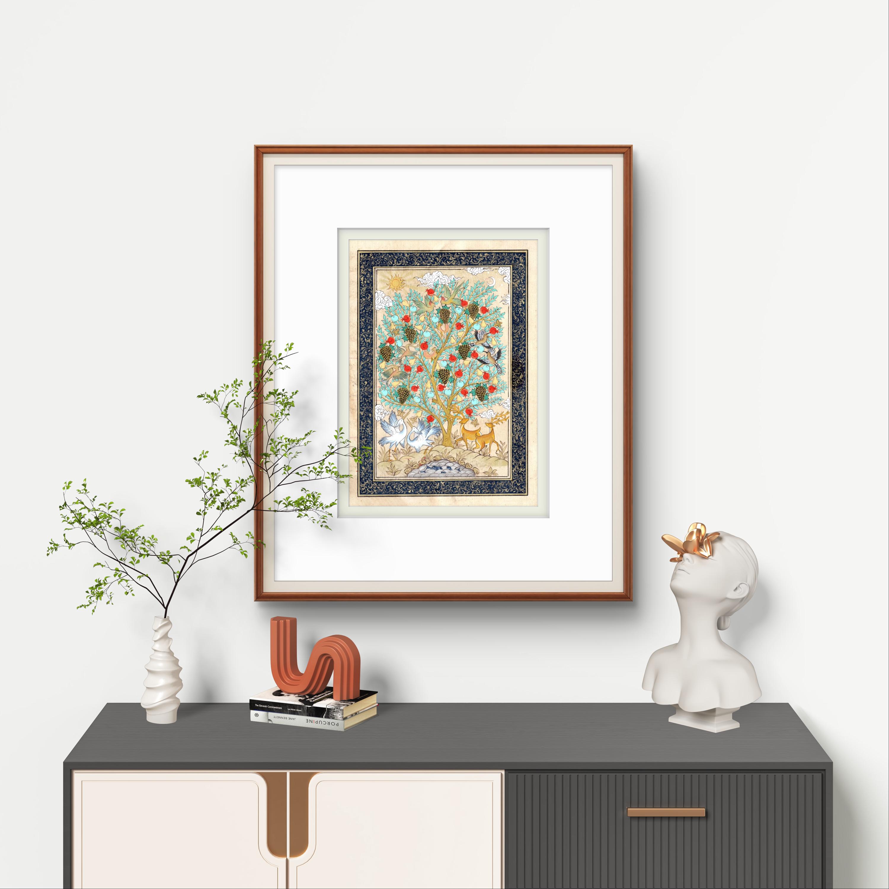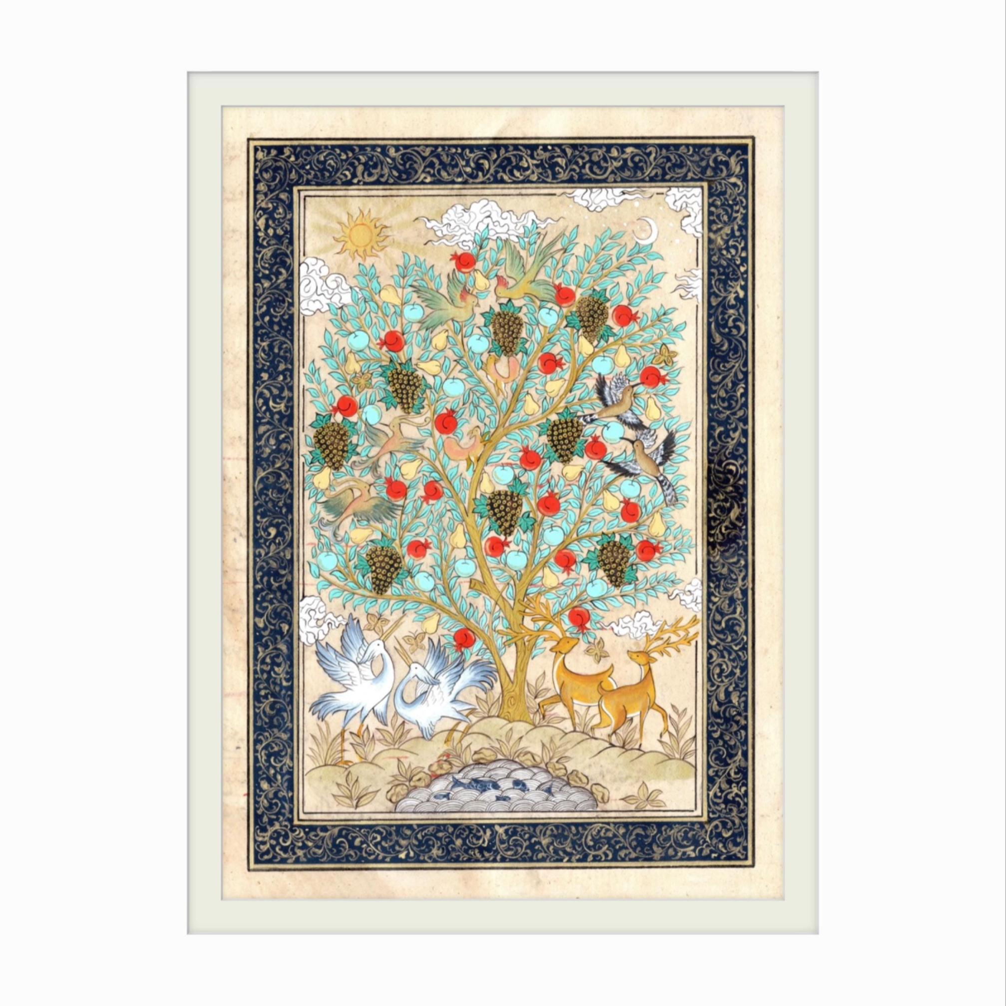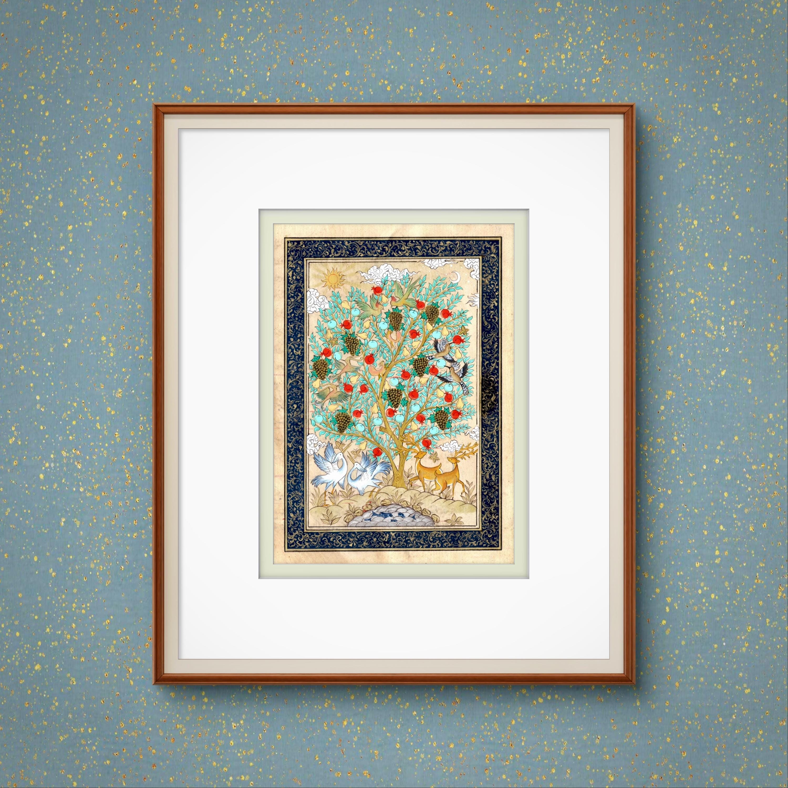 This exquisite miniature painting on silk paper depicts the Tree of Paradise, its branches elegantly adorned with ripe pomegranates, symbolizing fertility, prosperity, and the eternal cycle of life. The intricate details of the tree are brought to life through meticulous brushwork, showcasing its lush foliage and the radiant, textured fruits that provide a striking visual contrast to the soft background.
