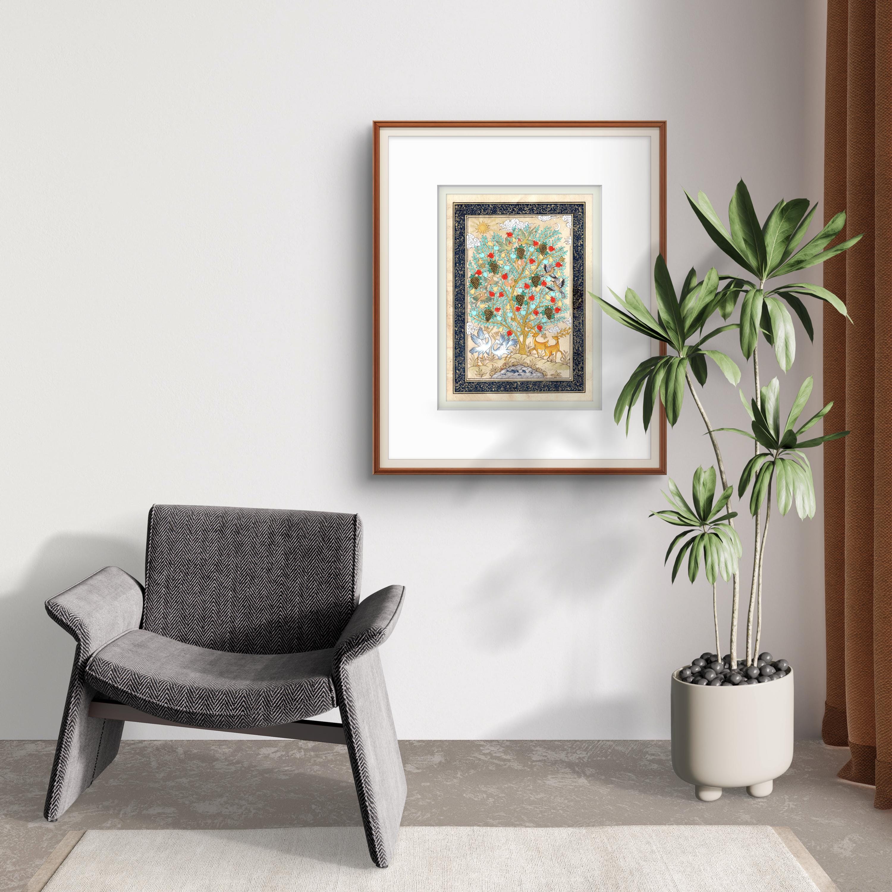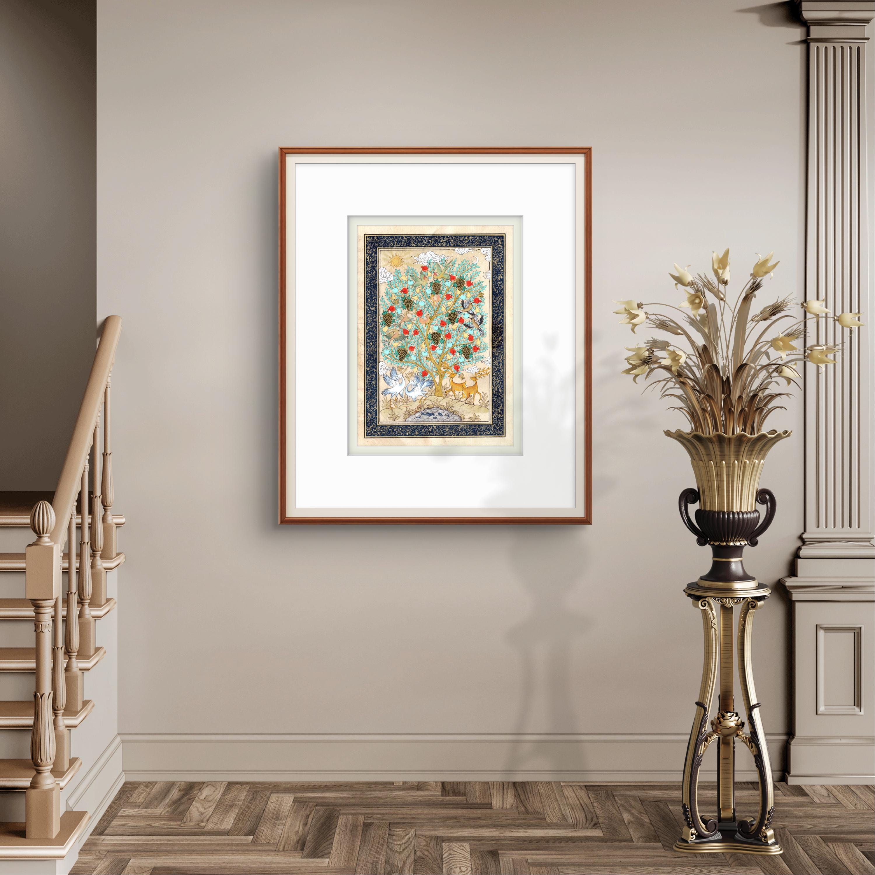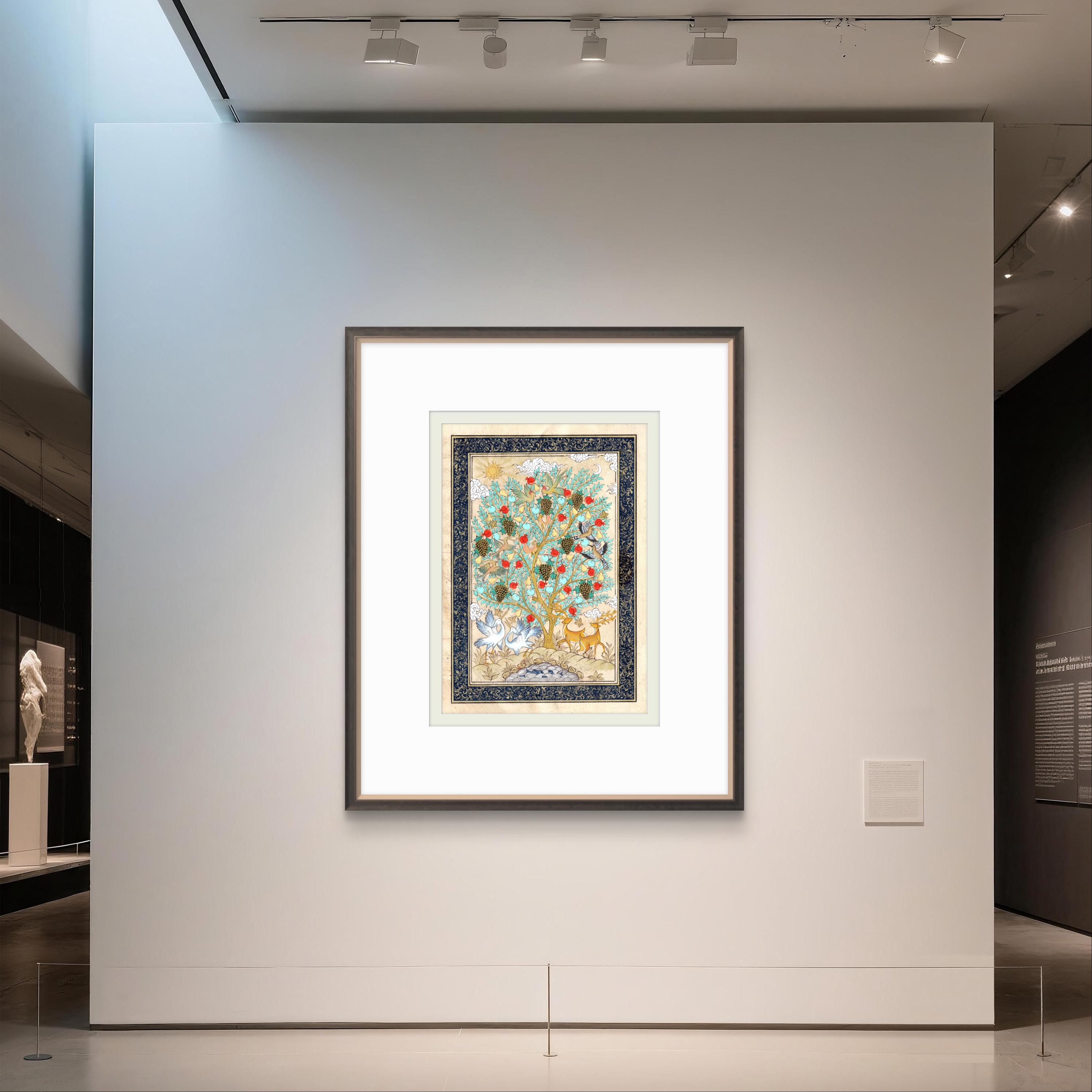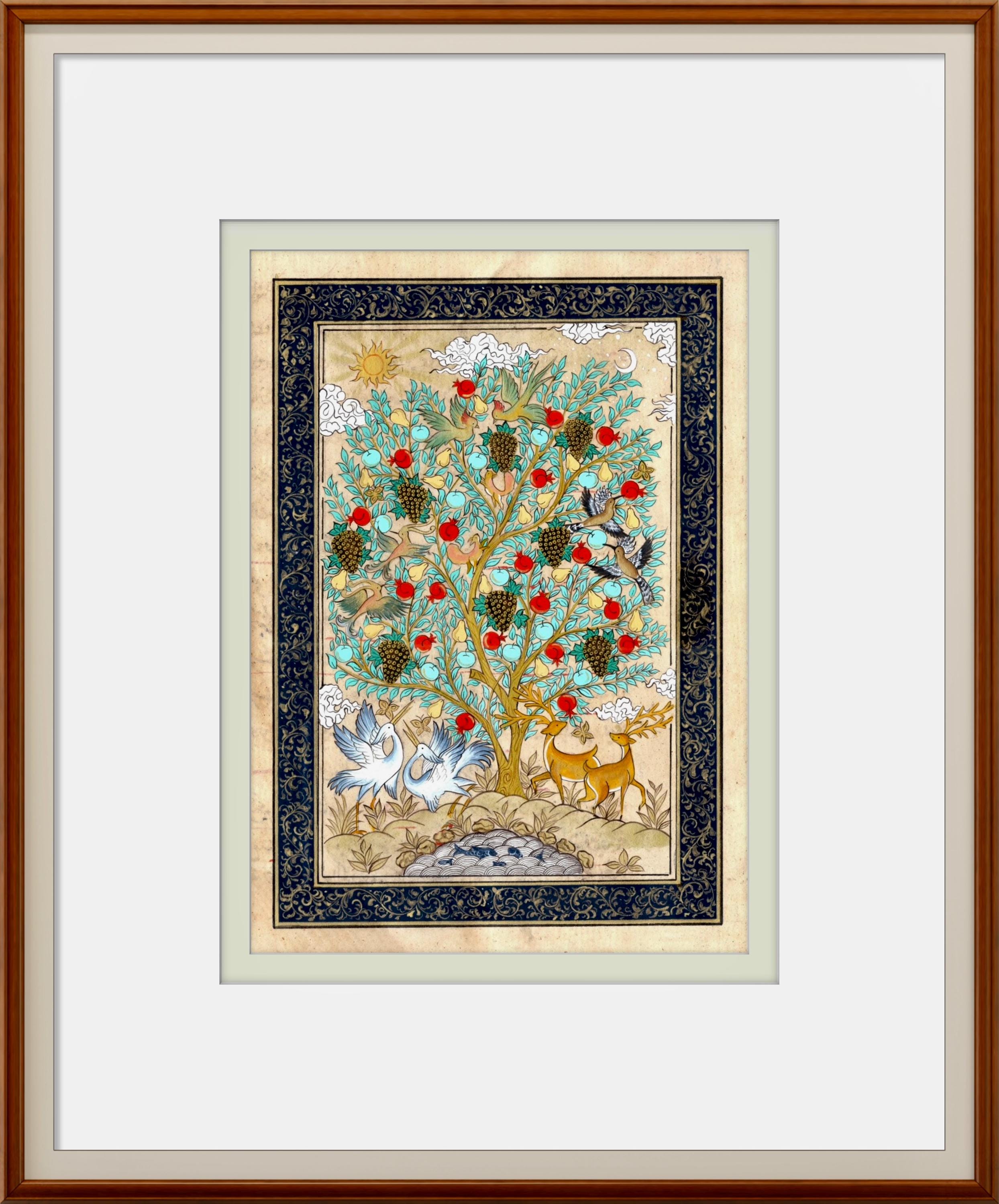 This exquisite miniature painting on silk paper depicts the Tree of Paradise, its branches elegantly adorned with ripe pomegranates, symbolizing fertility, prosperity, and the eternal cycle of life. The intricate details of the tree are brought to life through meticulous brushwork, showcasing its lush foliage and the radiant, textured fruits that provide a striking visual contrast to the soft background.