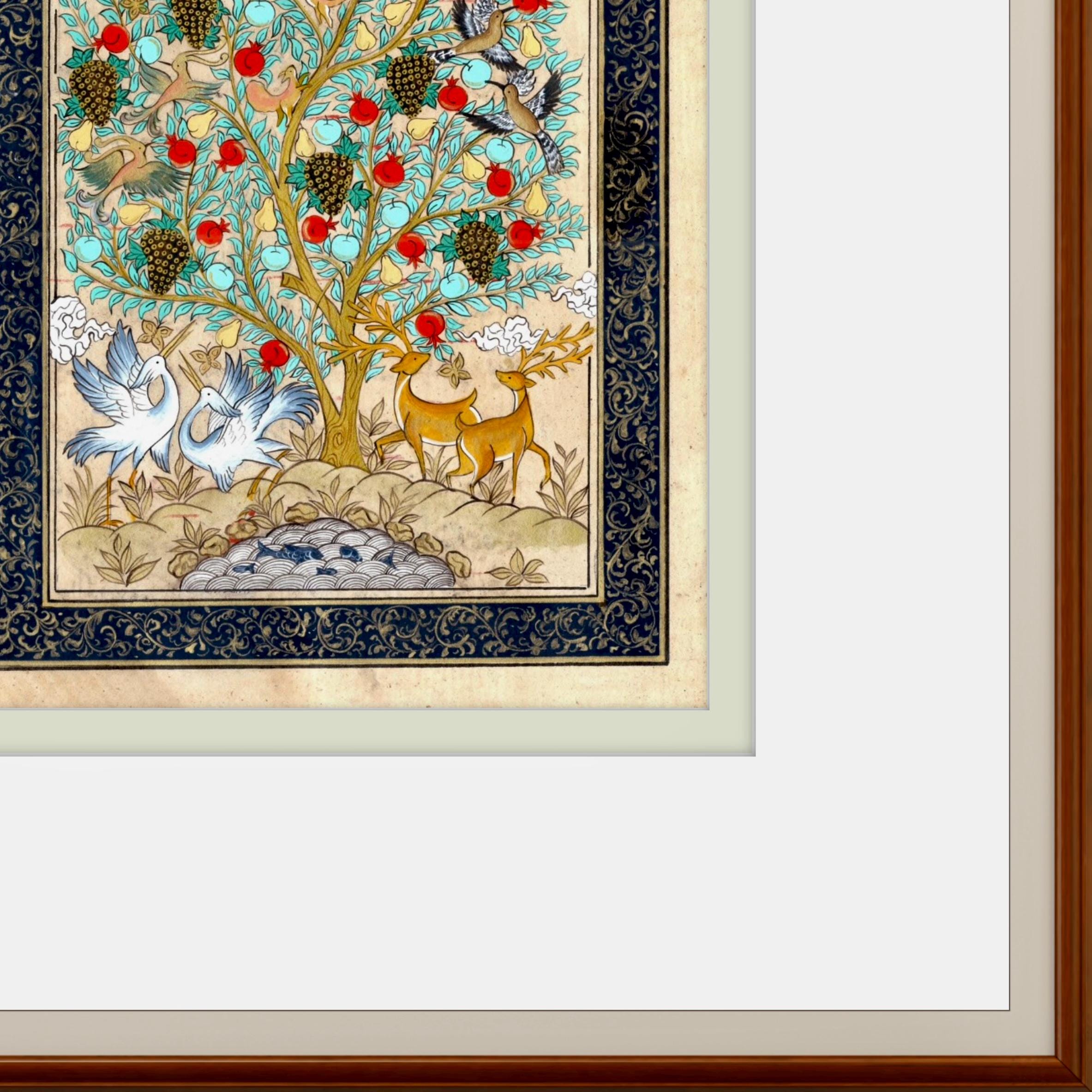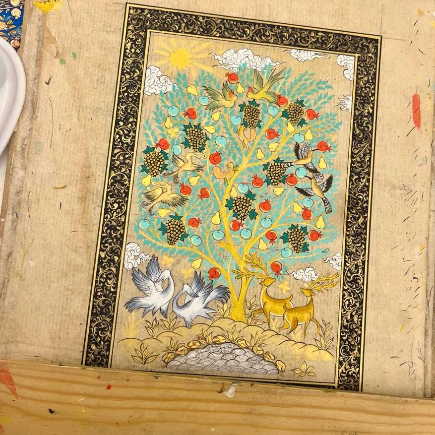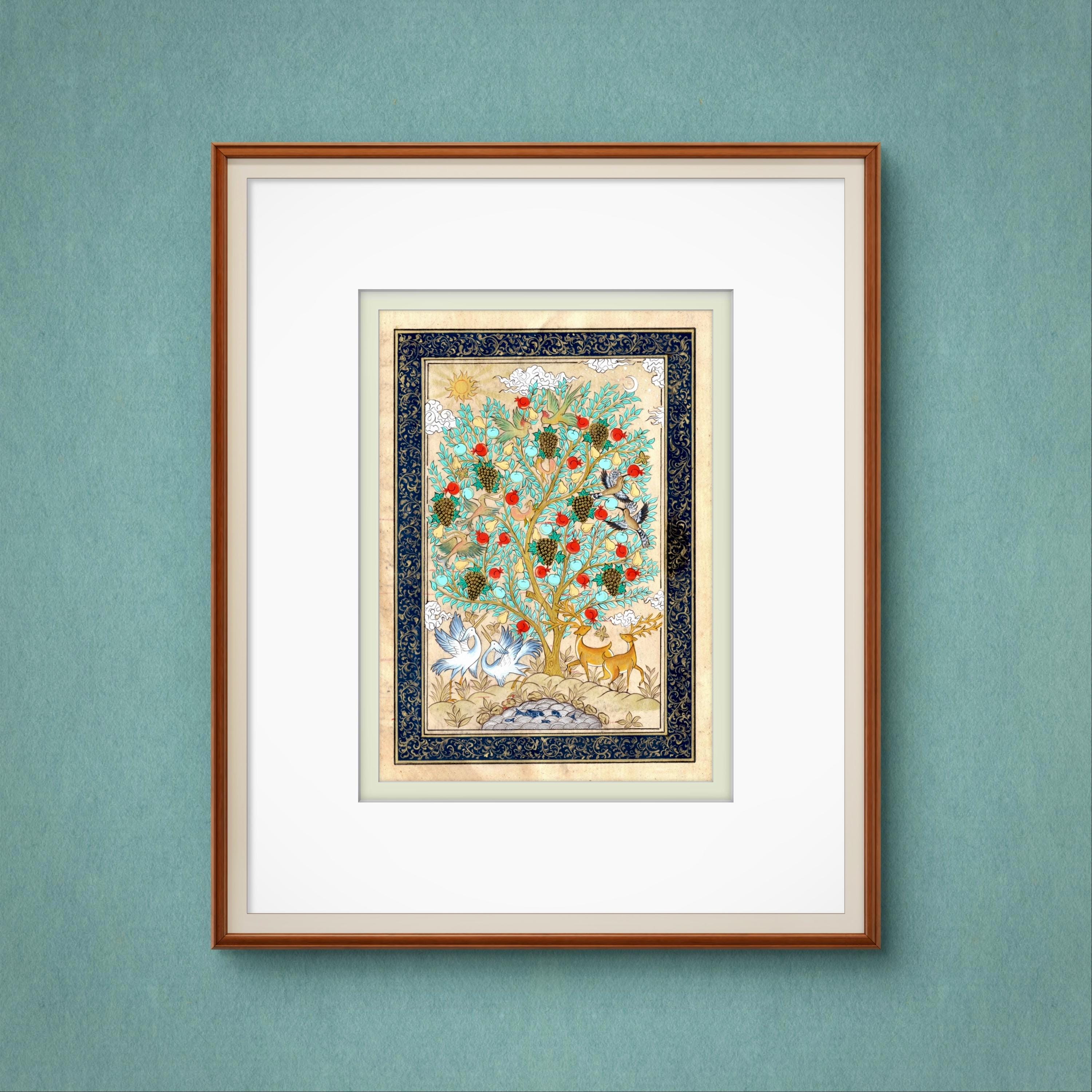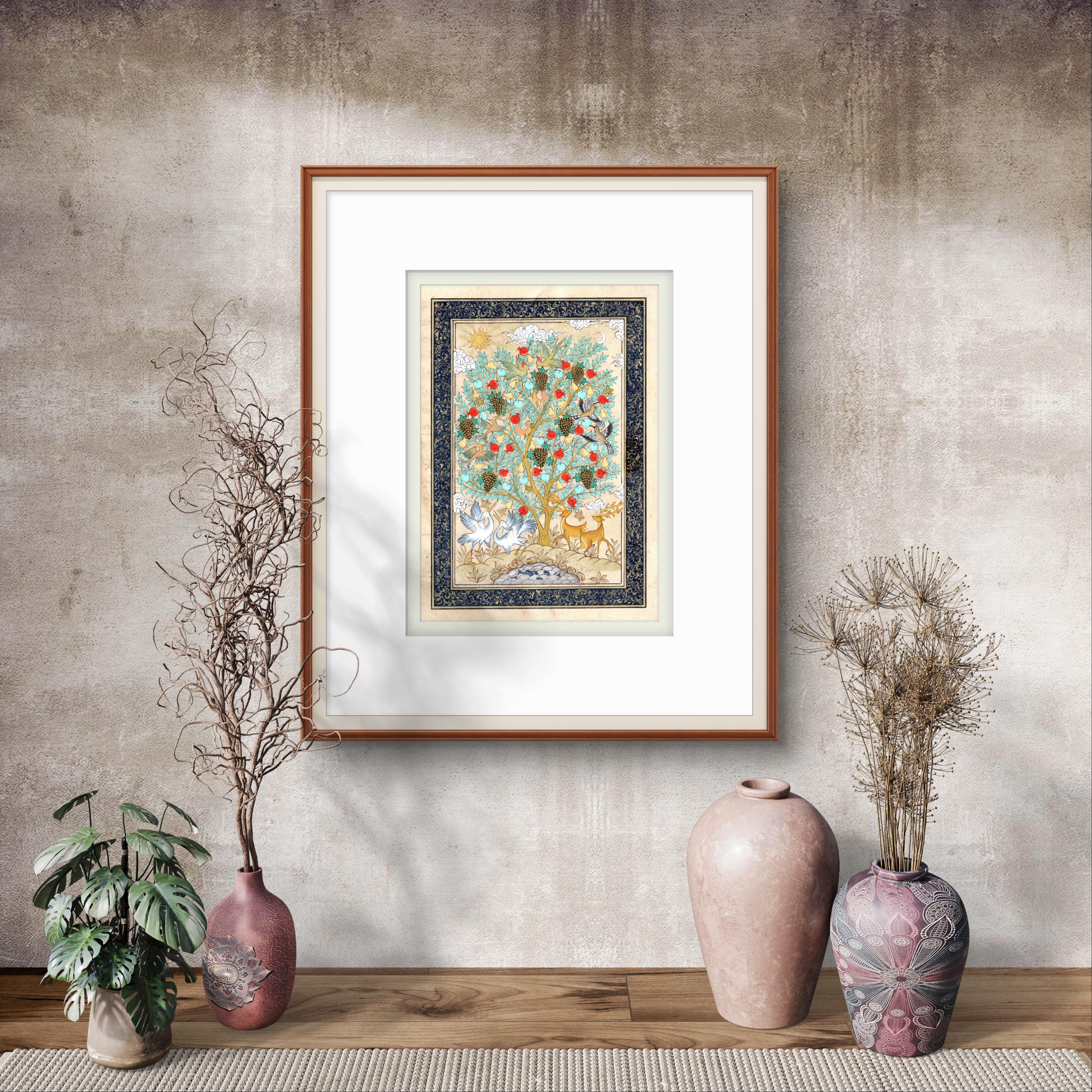 “Tree of Paradise: Pomegranates and Hoopoe Birds” captures the essence of spiritual beauty, the interconnectedness of life, and the serene balance of nature, all encapsulated in the timeless art of miniature painting.