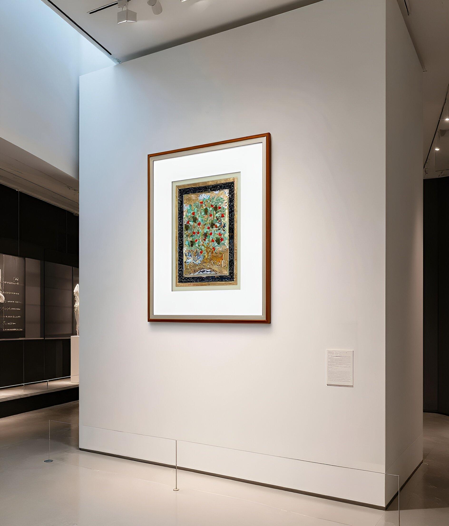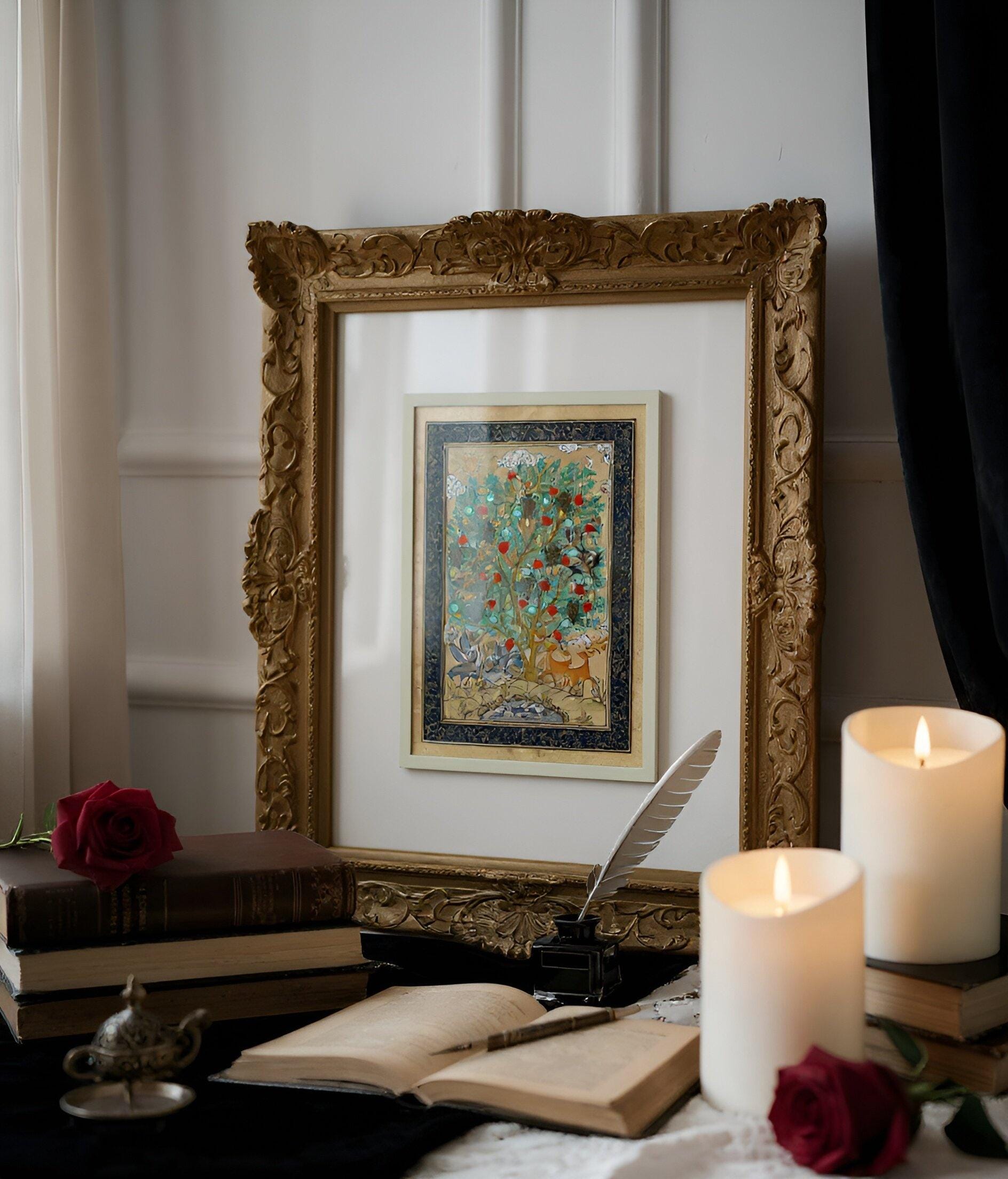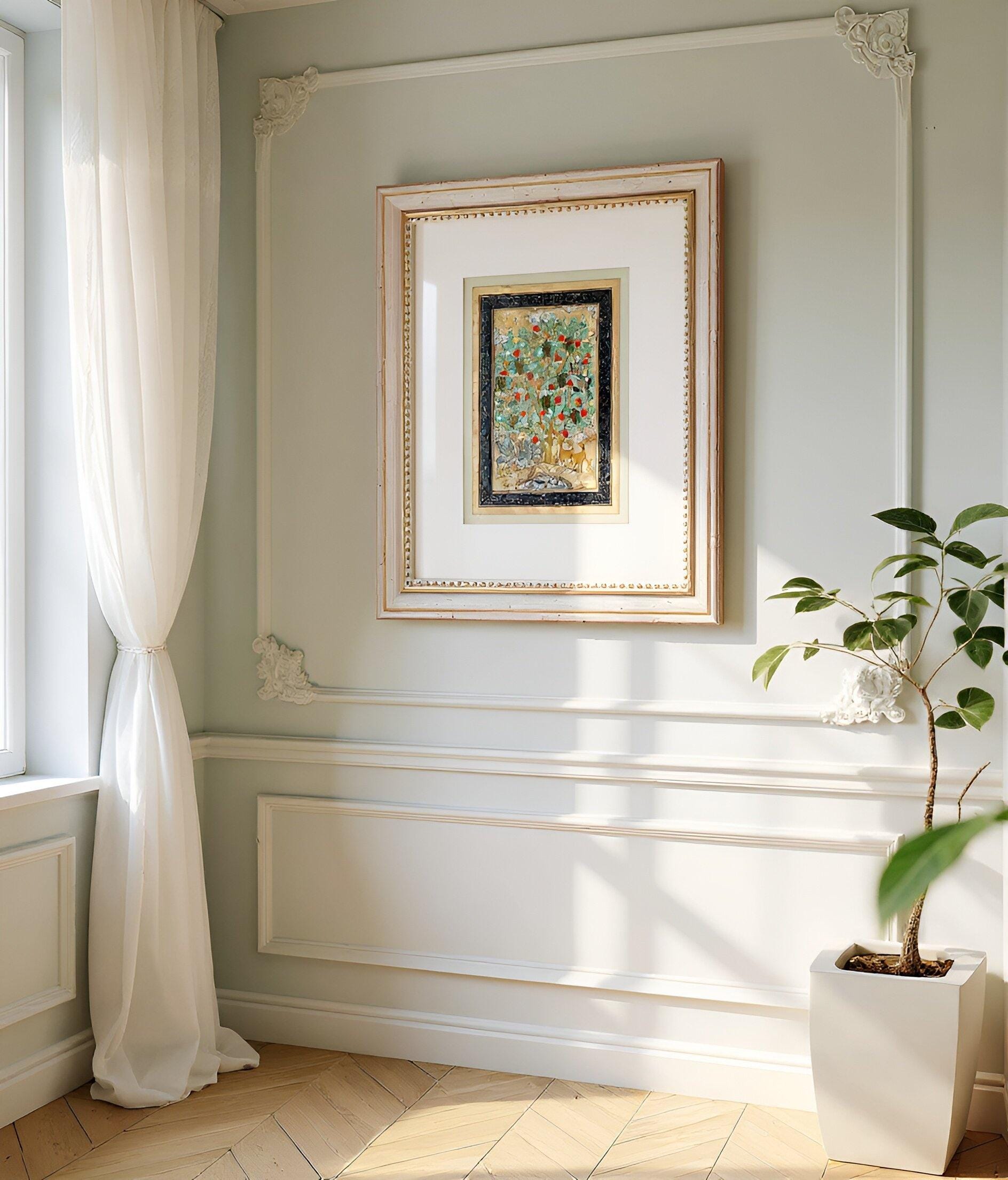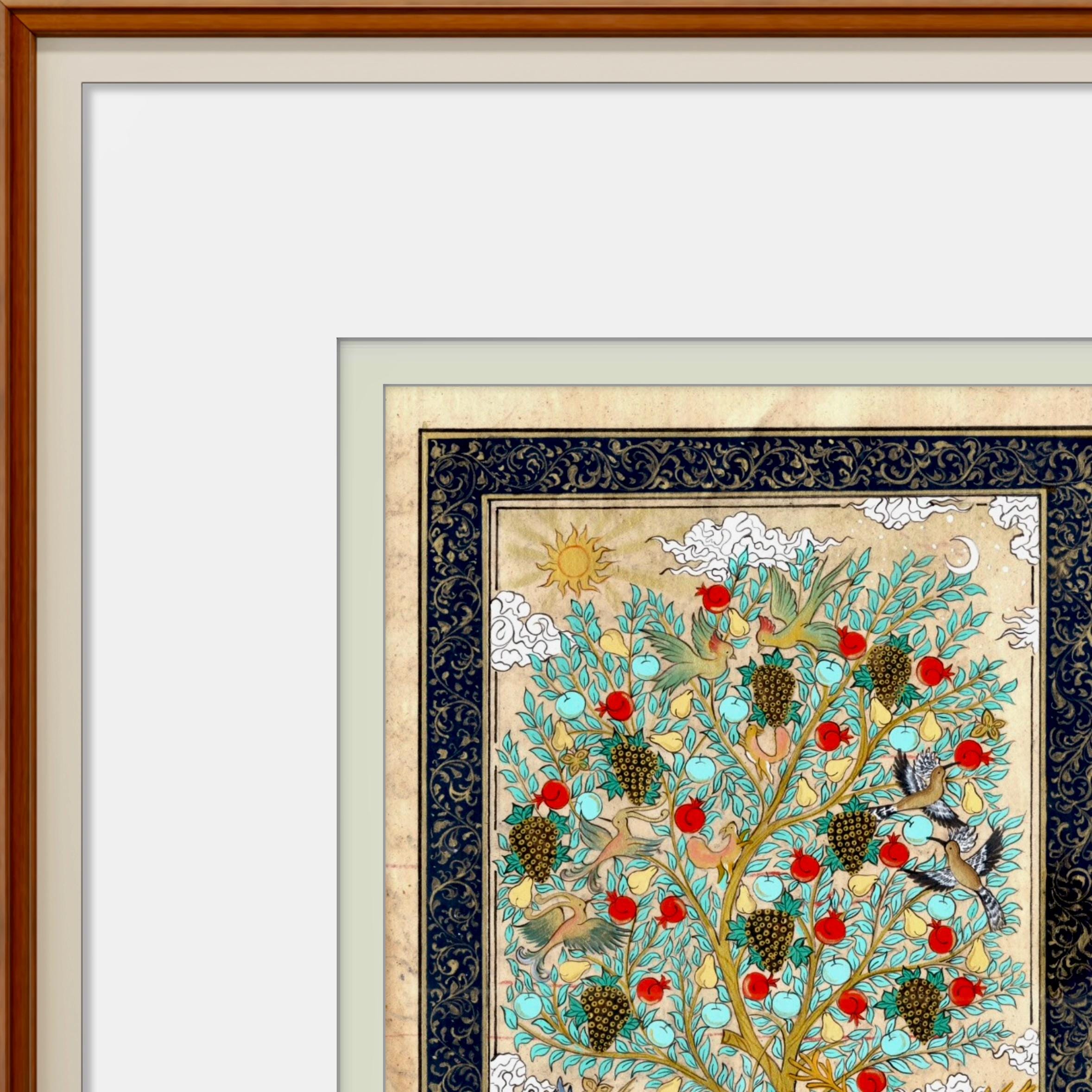 “Tree of Paradise: Pomegranates and Hoopoe Birds” captures the essence of spiritual beauty, the interconnectedness of life, and the serene balance of nature, all encapsulated in the timeless art of miniature painting.