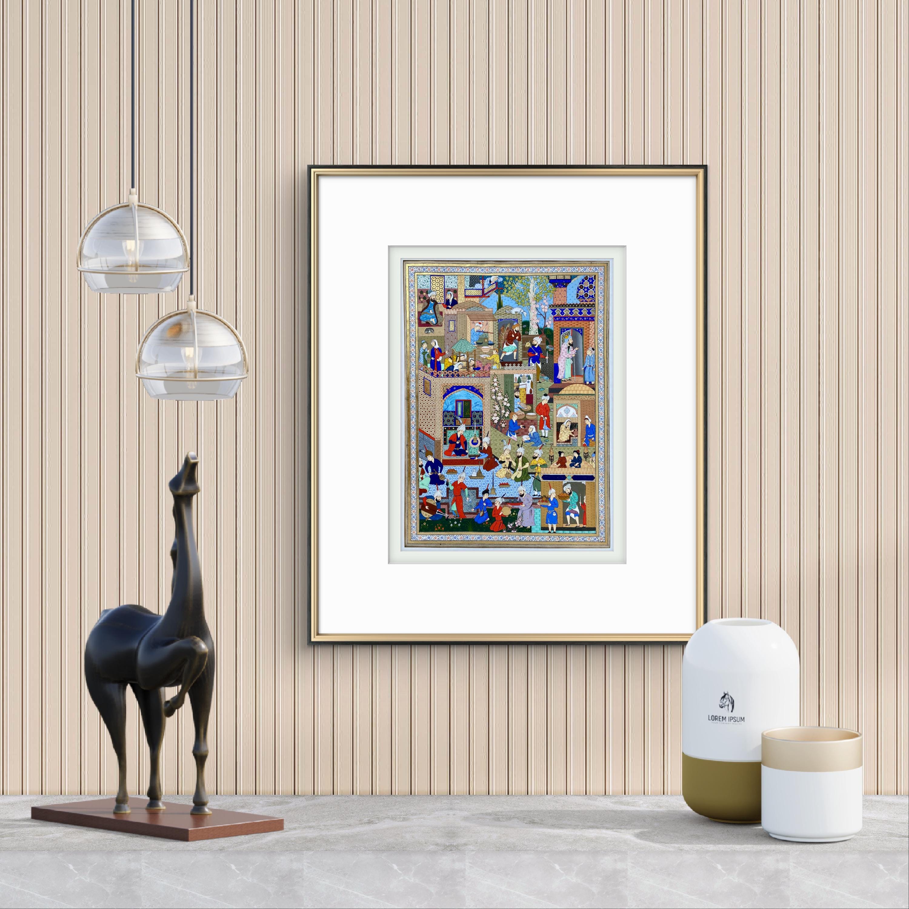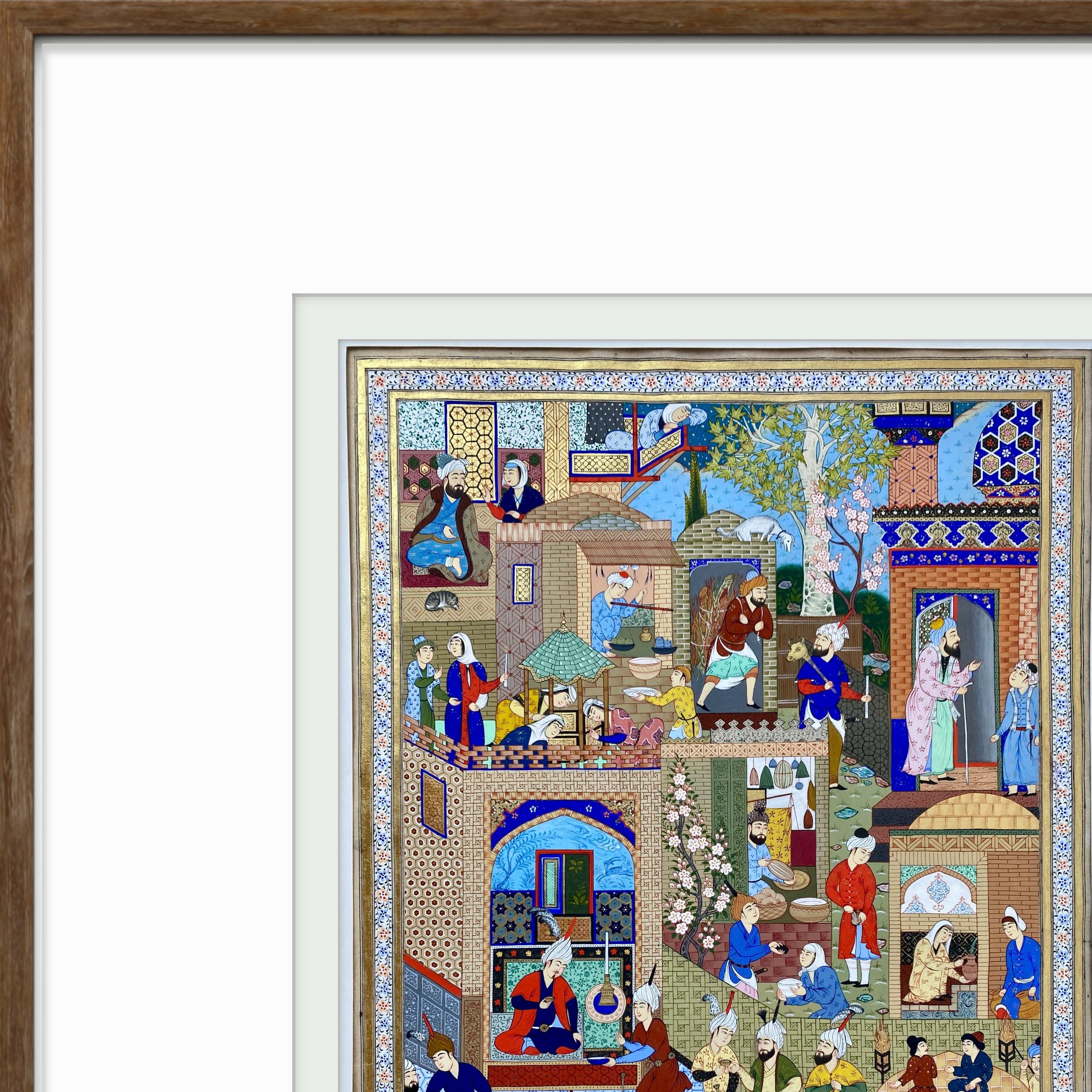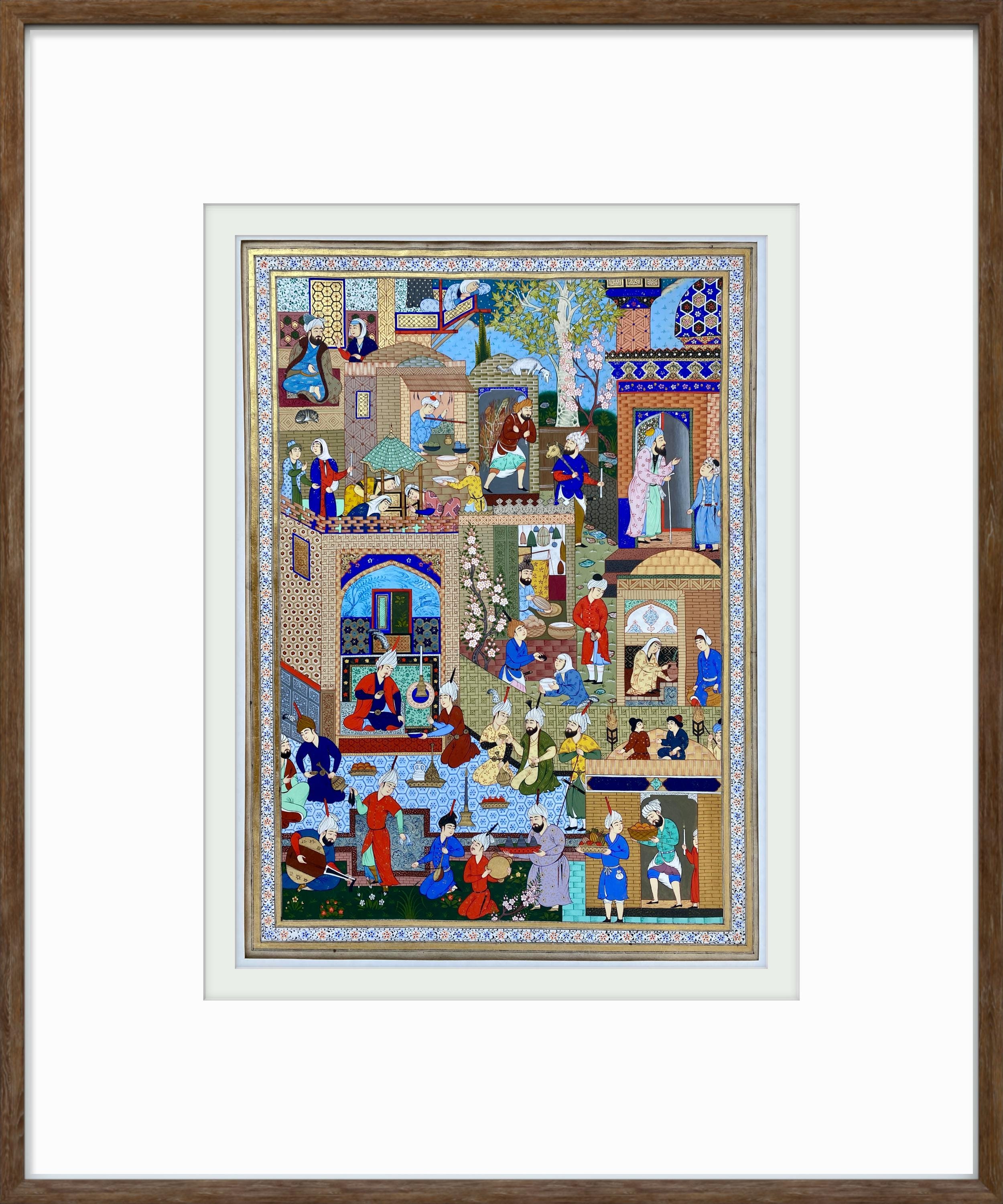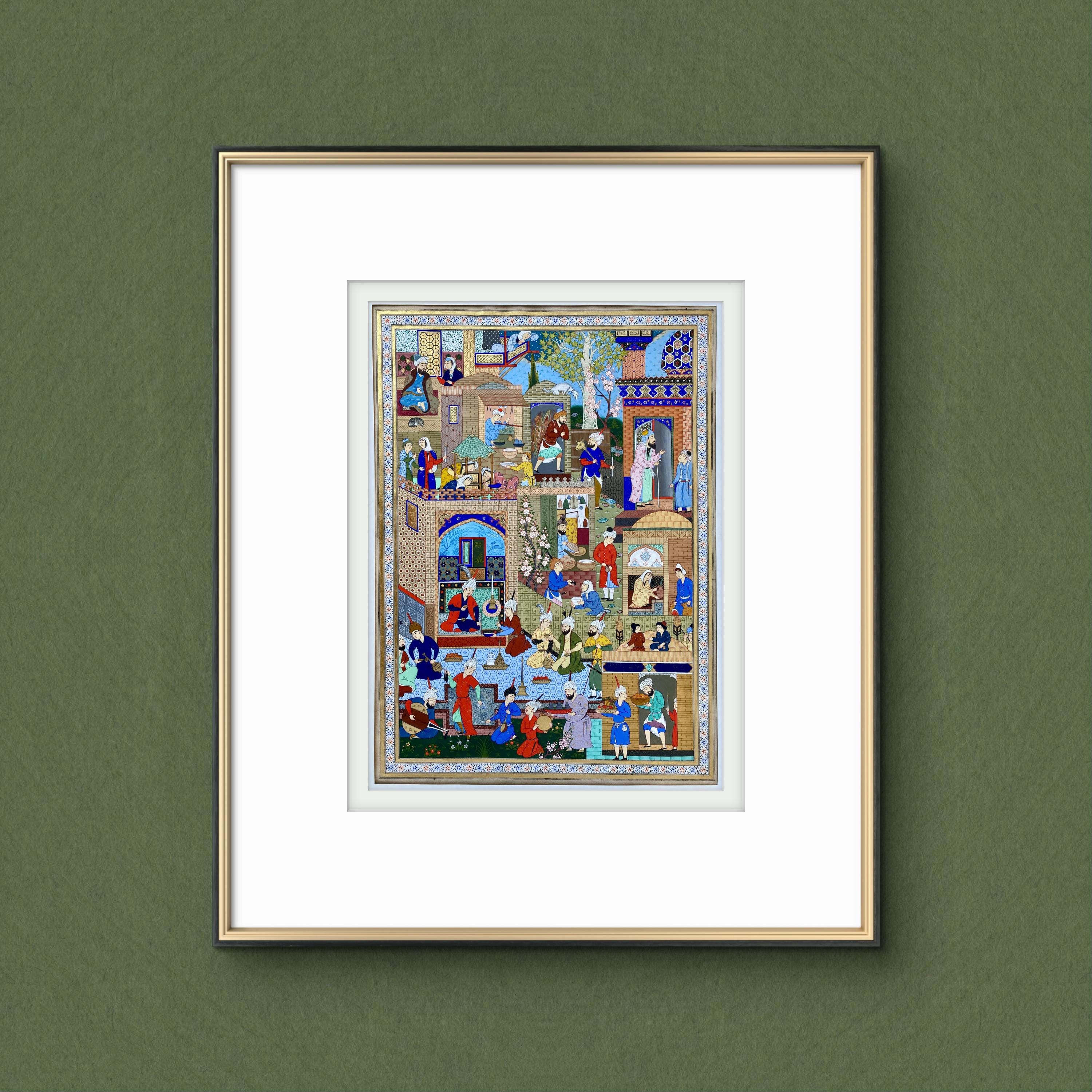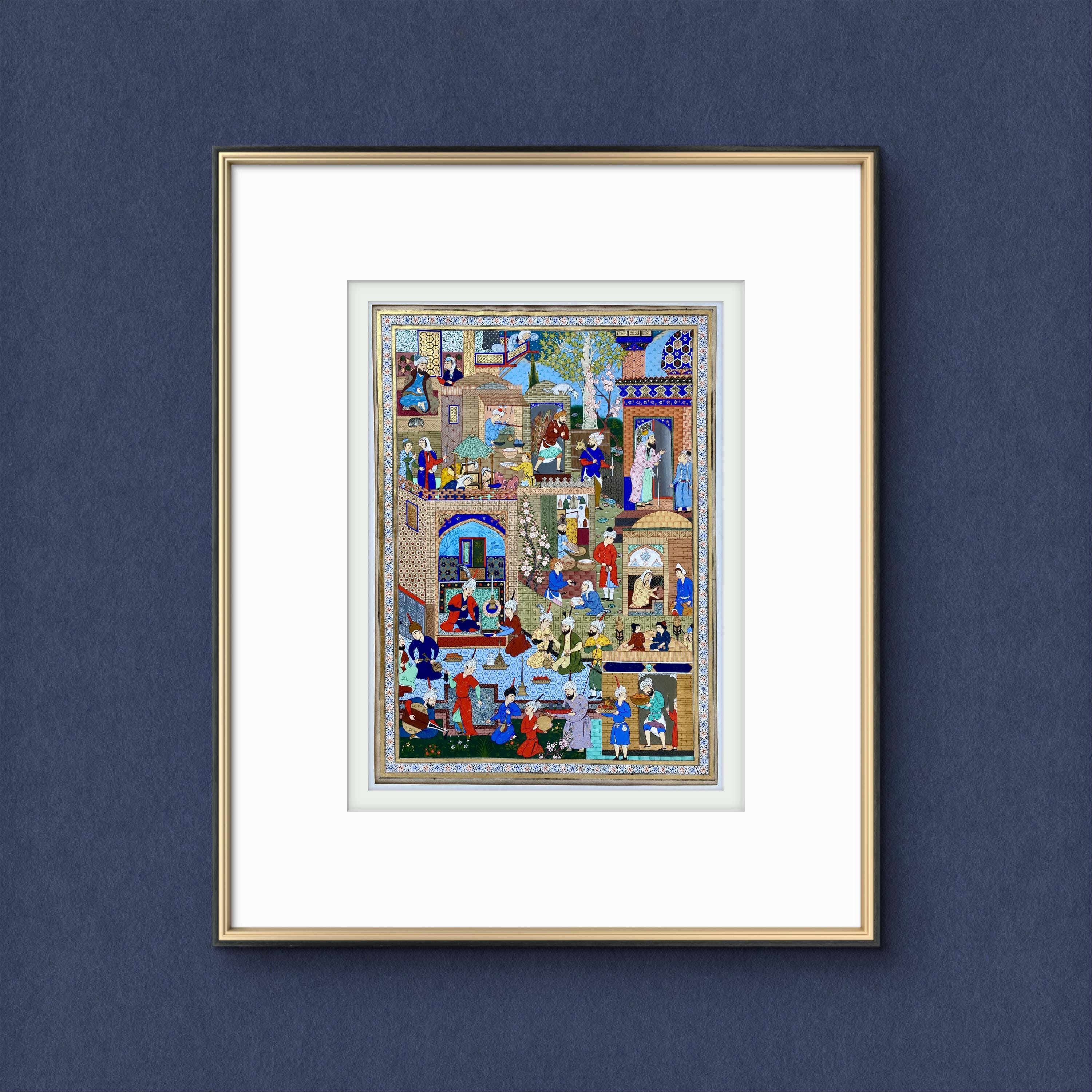 This exquisite artwork, titled Nighttime in a City, is a faithful reproduction of a 16th-century Persian miniature attributed to Mir Sayyid ‘Ali, one of the celebrated masters of the Tabriz School. The scene unfolds across an intricate composition filled with life, color, and rhythm - where architecture, music, and human presence merge into a luminous harmony of Persian manuscript tradition.