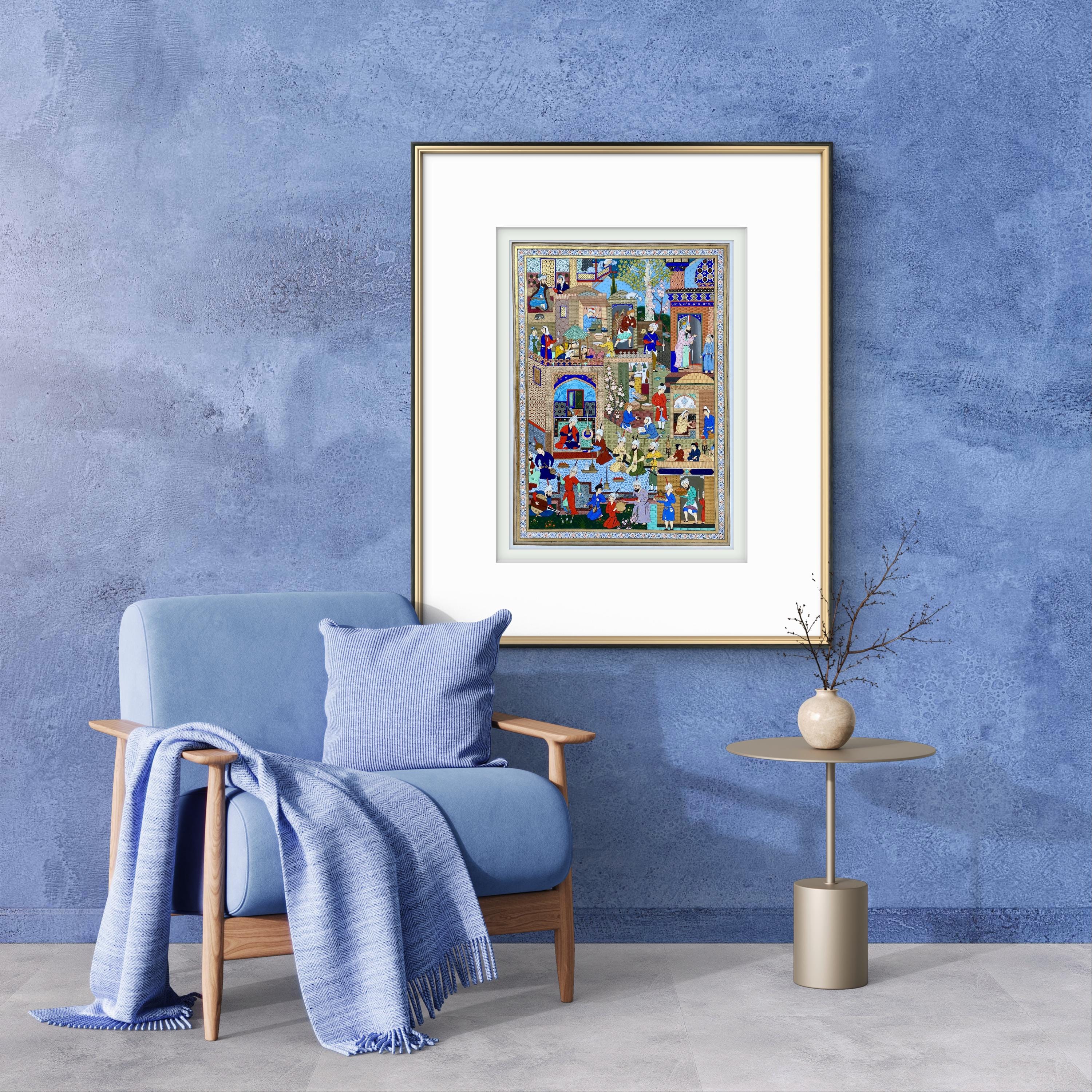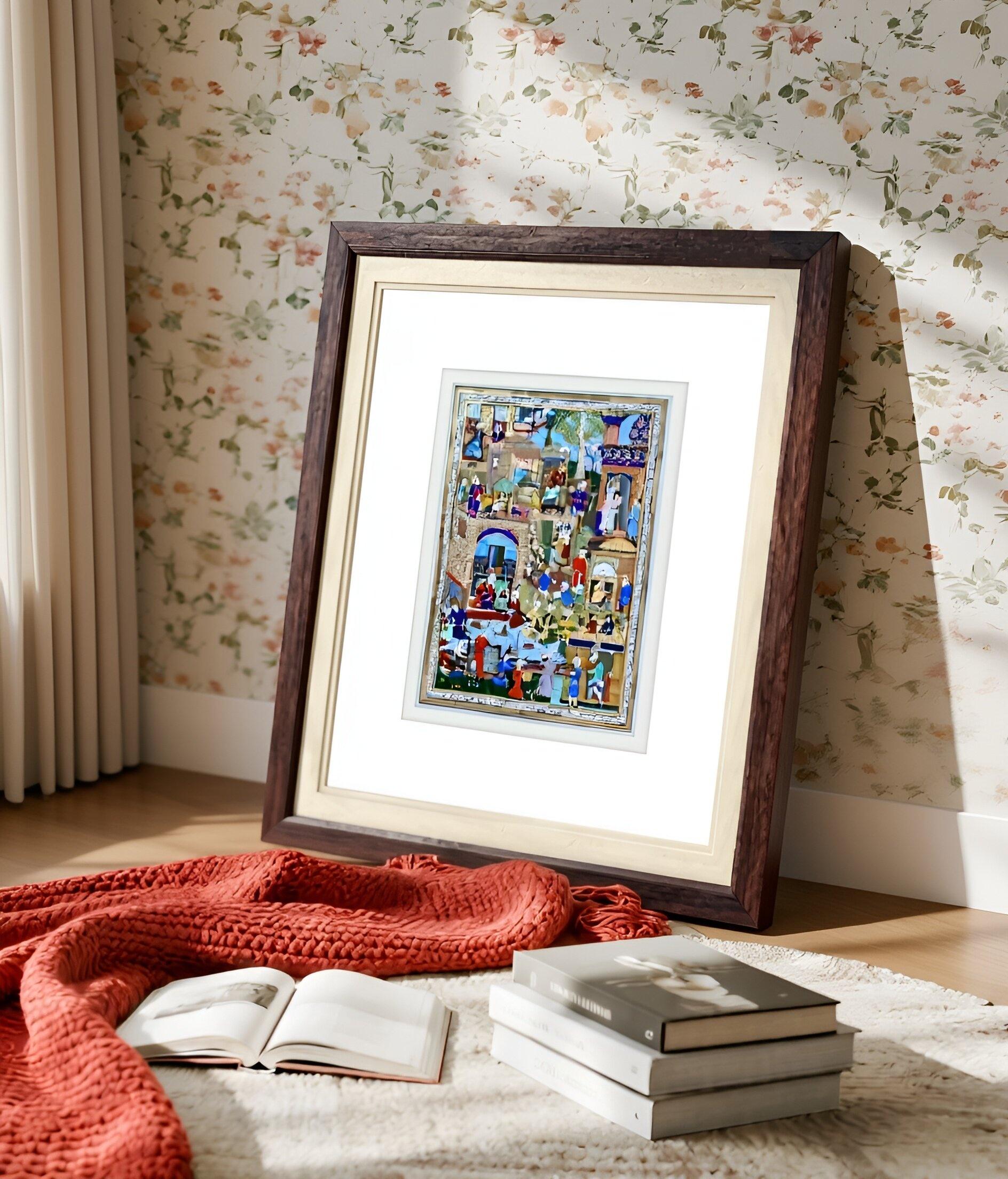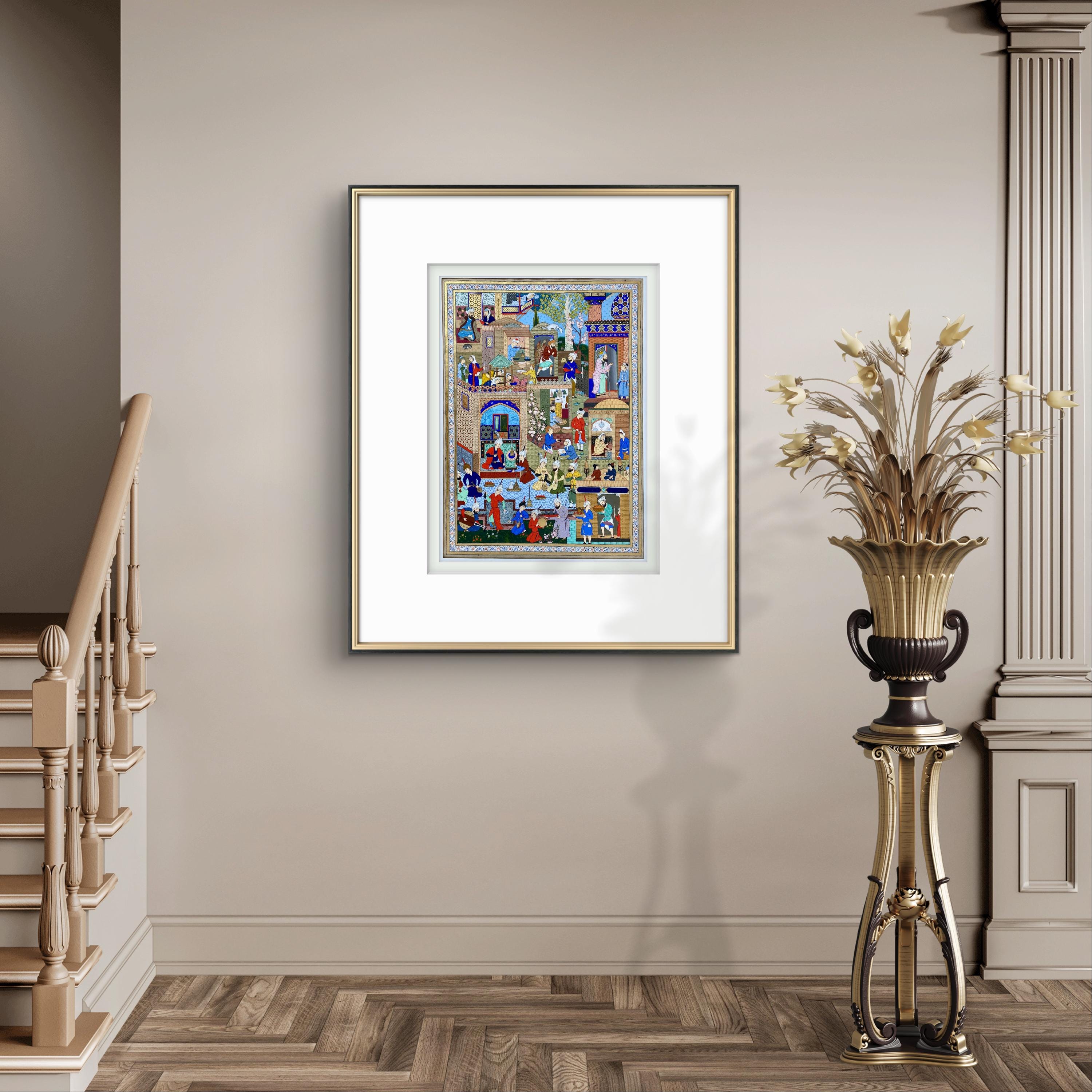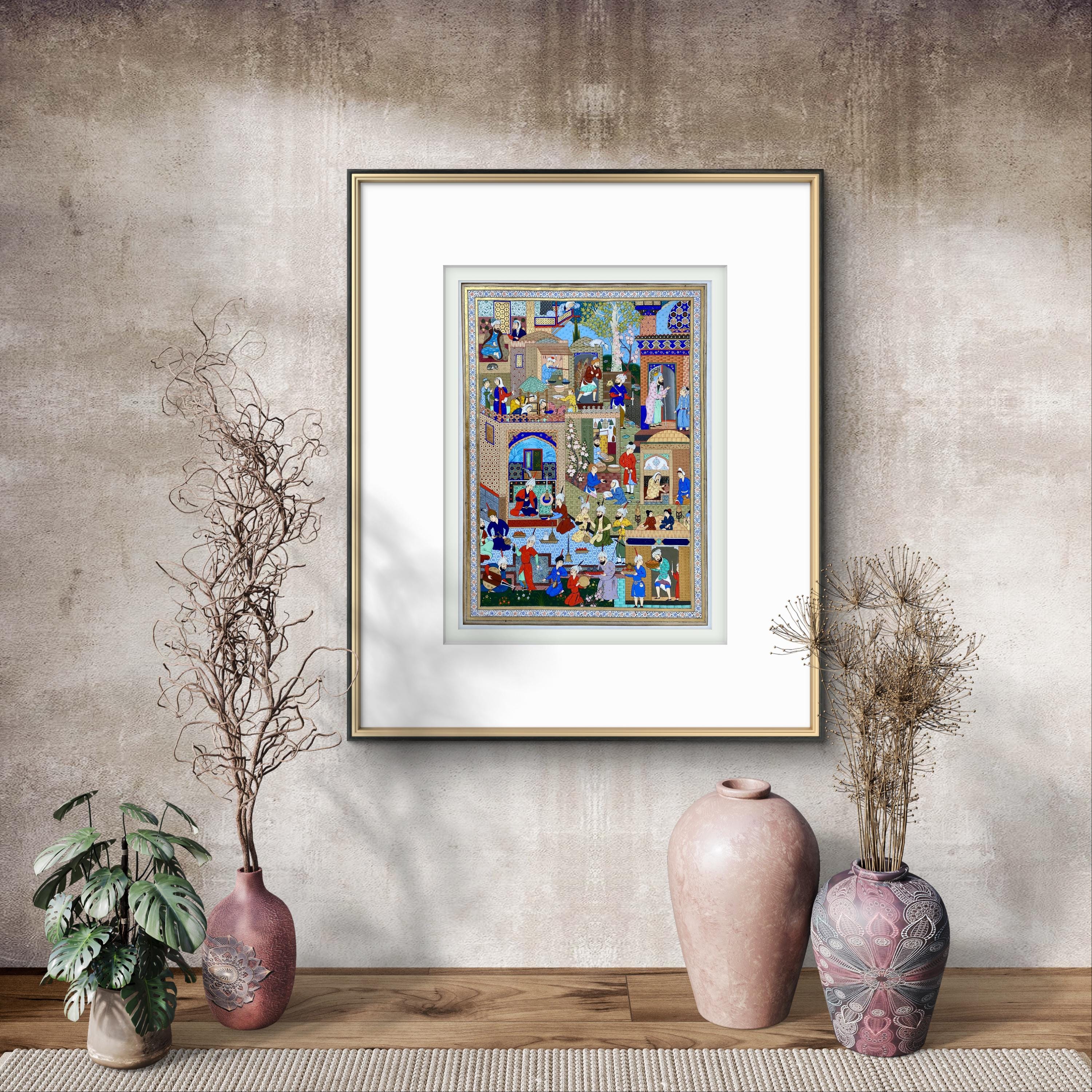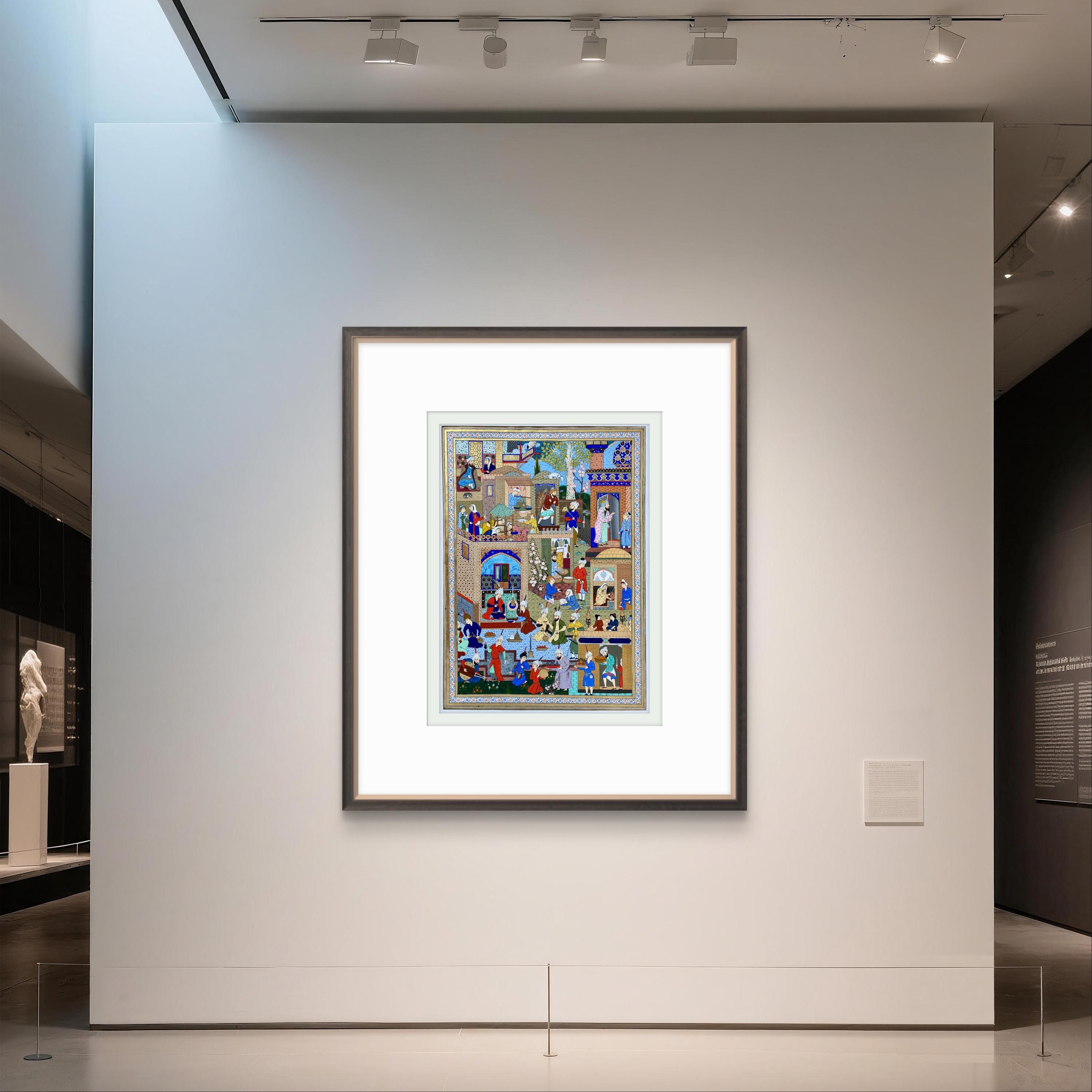 This exquisite artwork, titled Nighttime in a City, is a faithful reproduction of a 16th-century Persian miniature attributed to Mir Sayyid ‘Ali, one of the celebrated masters of the Tabriz School. The scene unfolds across an intricate composition filled with life, color, and rhythm - where architecture, music, and human presence merge into a luminous harmony of Persian manuscript tradition.