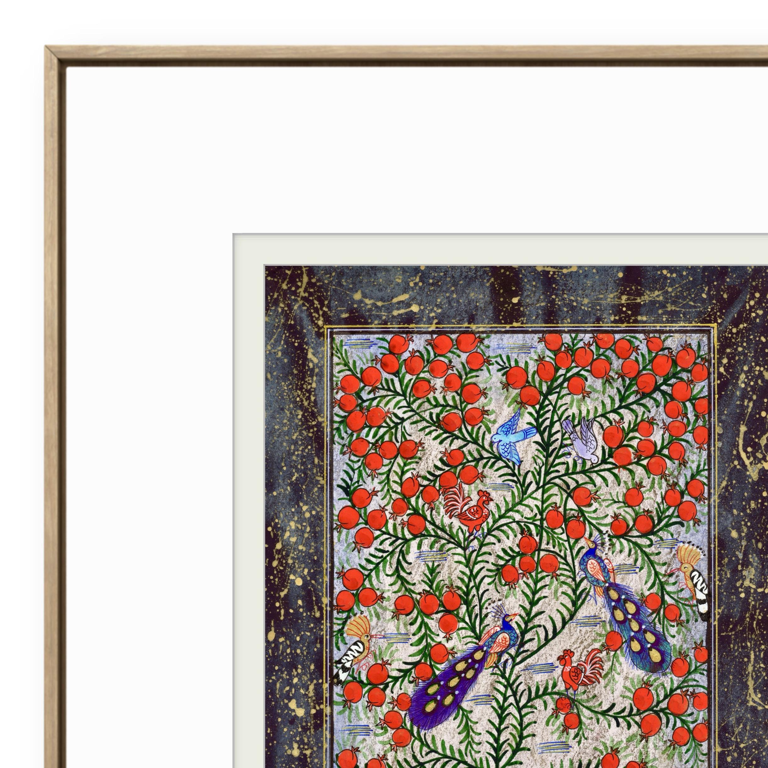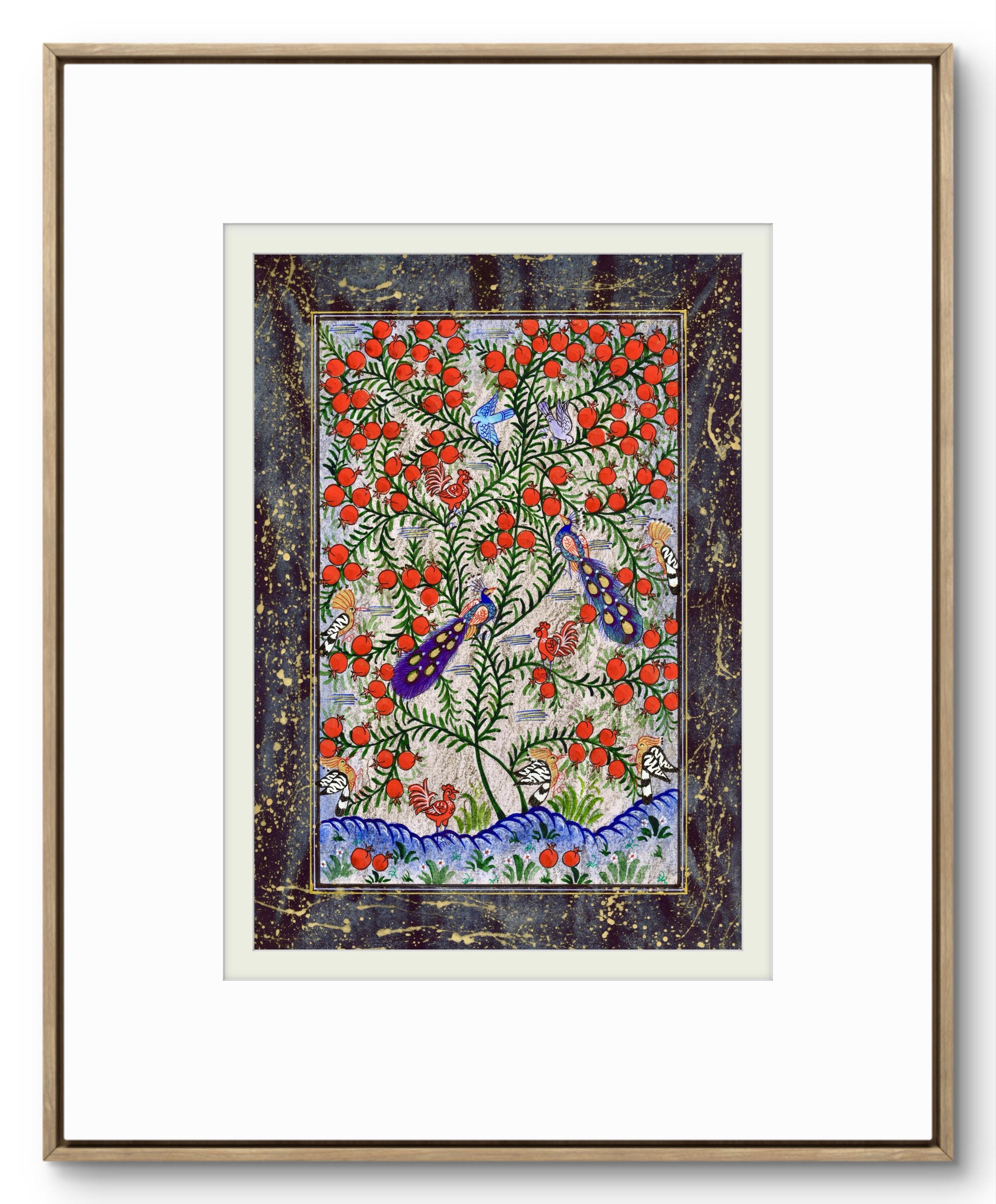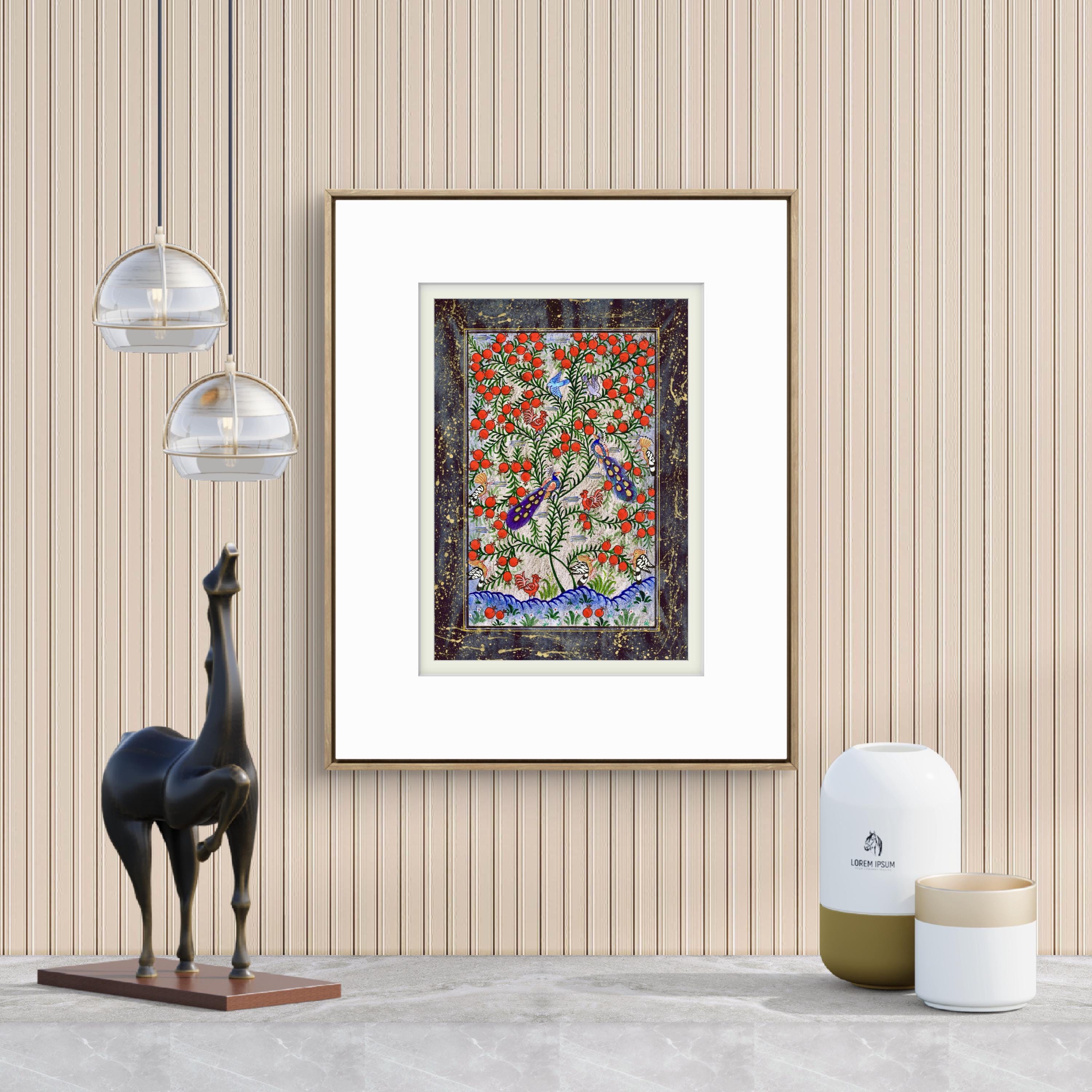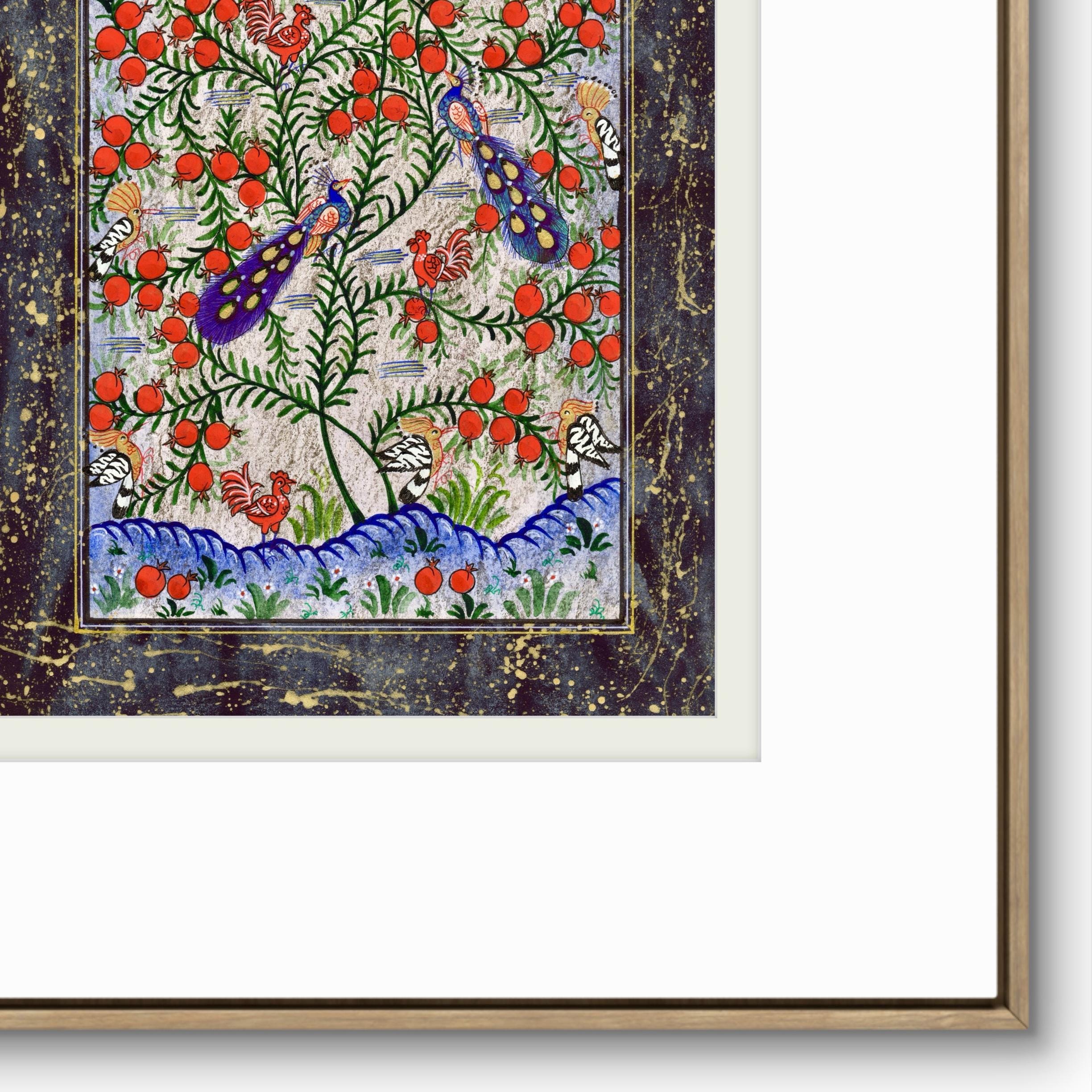 Tree of Paradise - Hoopoe Bird - Pomegranates Miniature Painting on Paper | Central Asian Cultural Heritage | Luxury Home Decor Art (MATTED)