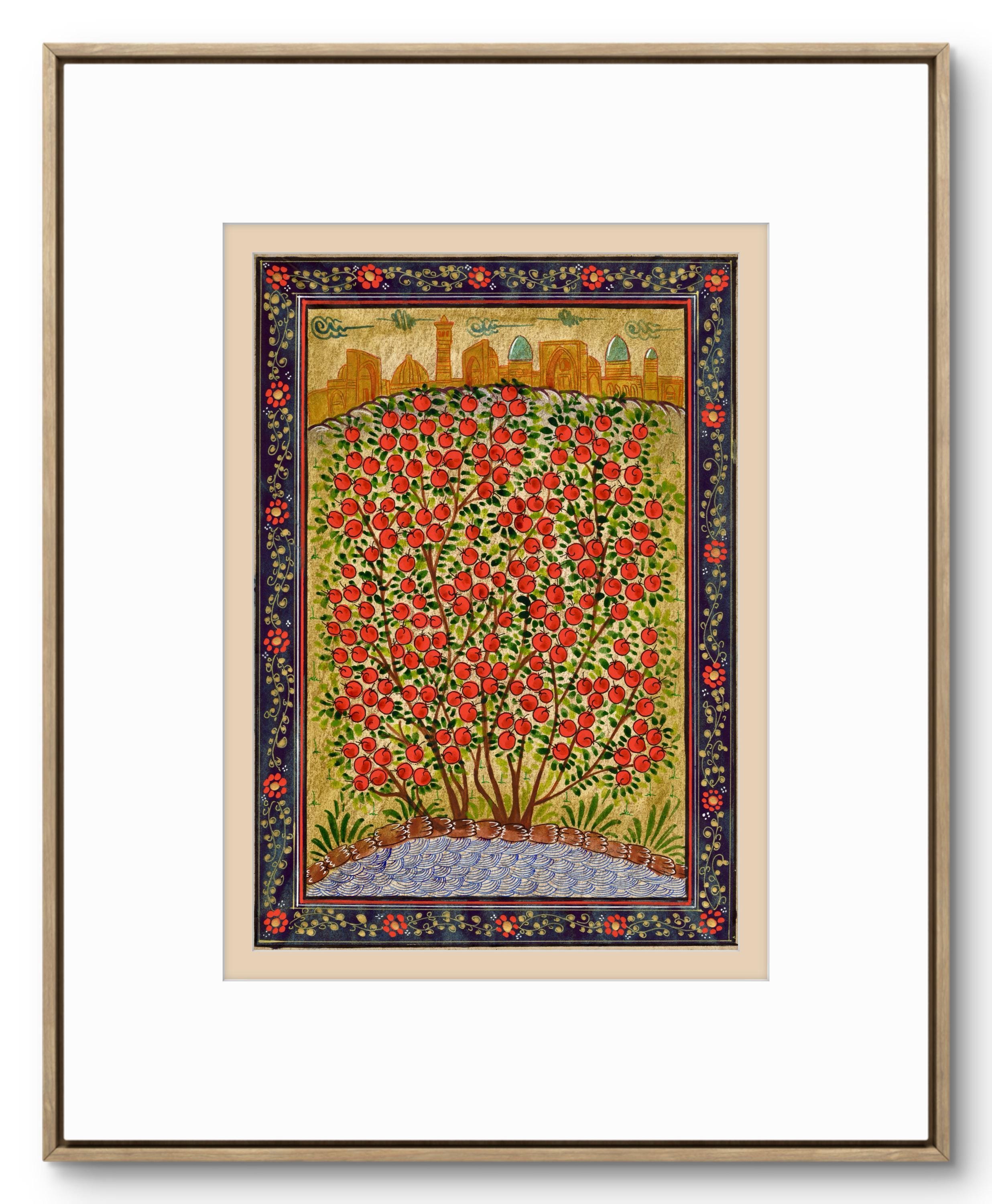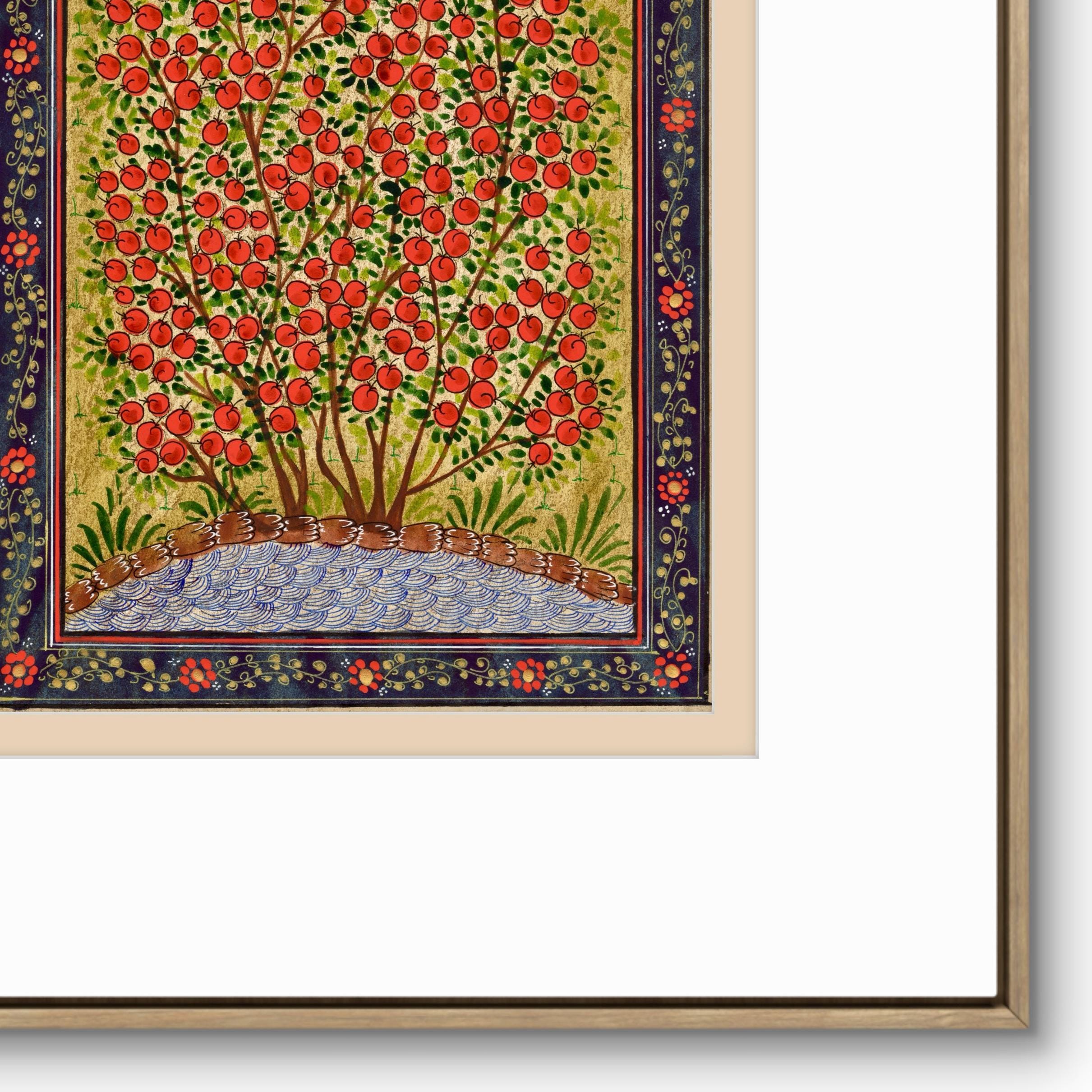 This exquisite miniature painting on cotton paper depicts the Tree of Paradise, its branches elegantly adorned with ripe pomegranates, symbolizing fertility, prosperity, and the eternal cycle of life. The intricate details of the tree are brought to life through meticulous brushwork, showcasing its lush foliage and the radiant, textured fruits that provide a striking visual contrast to the soft background.