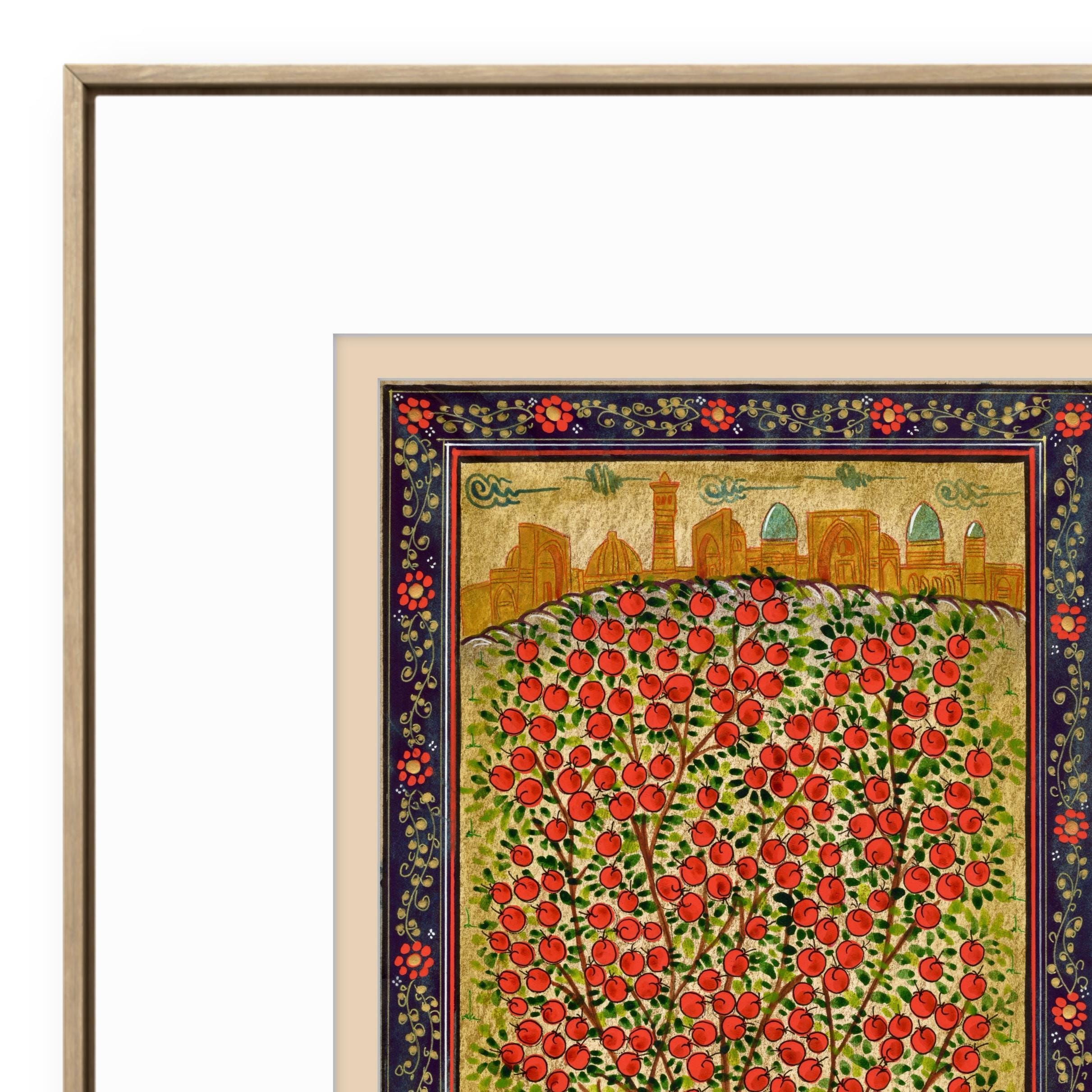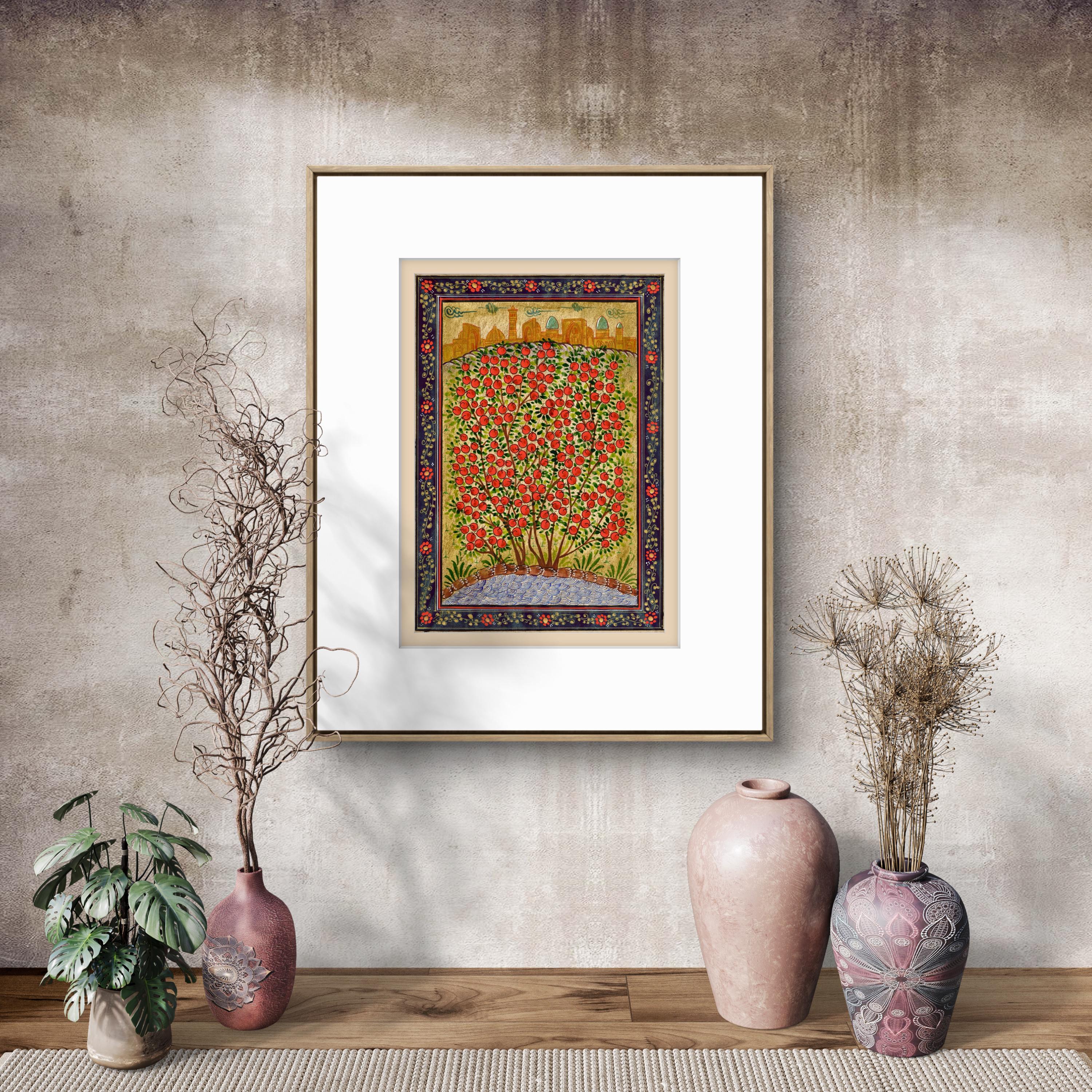 Tree of Paradise - Hoopoe Bird - Pomegranates Miniature Painting on Paper | Central Asian Cultural Heritage | Luxury Home Decor Art (MATTED)
