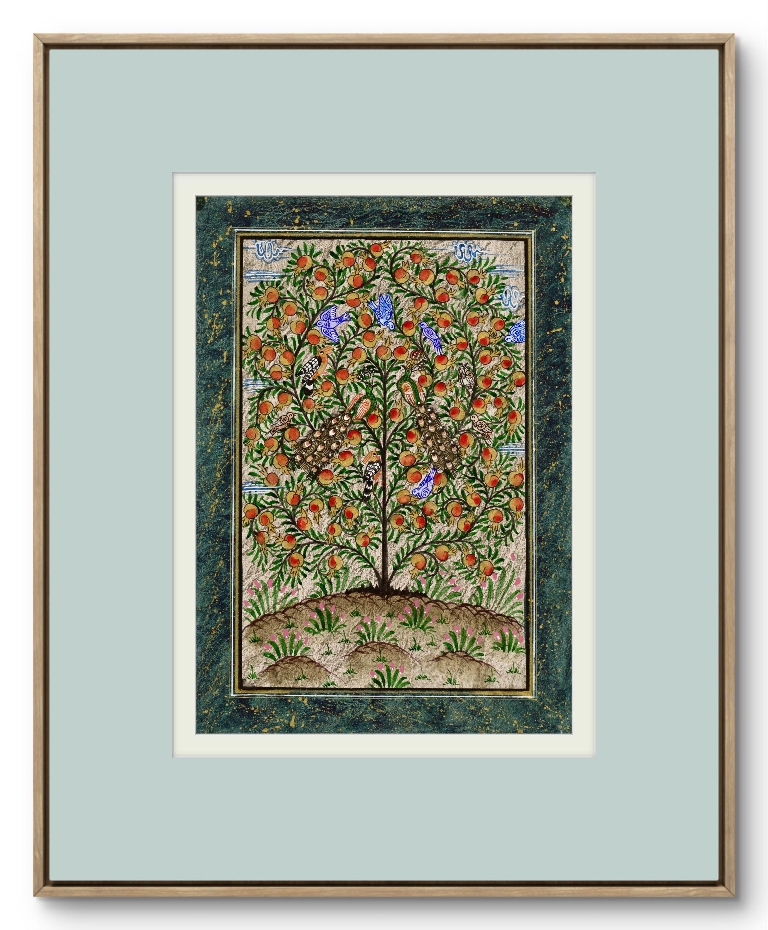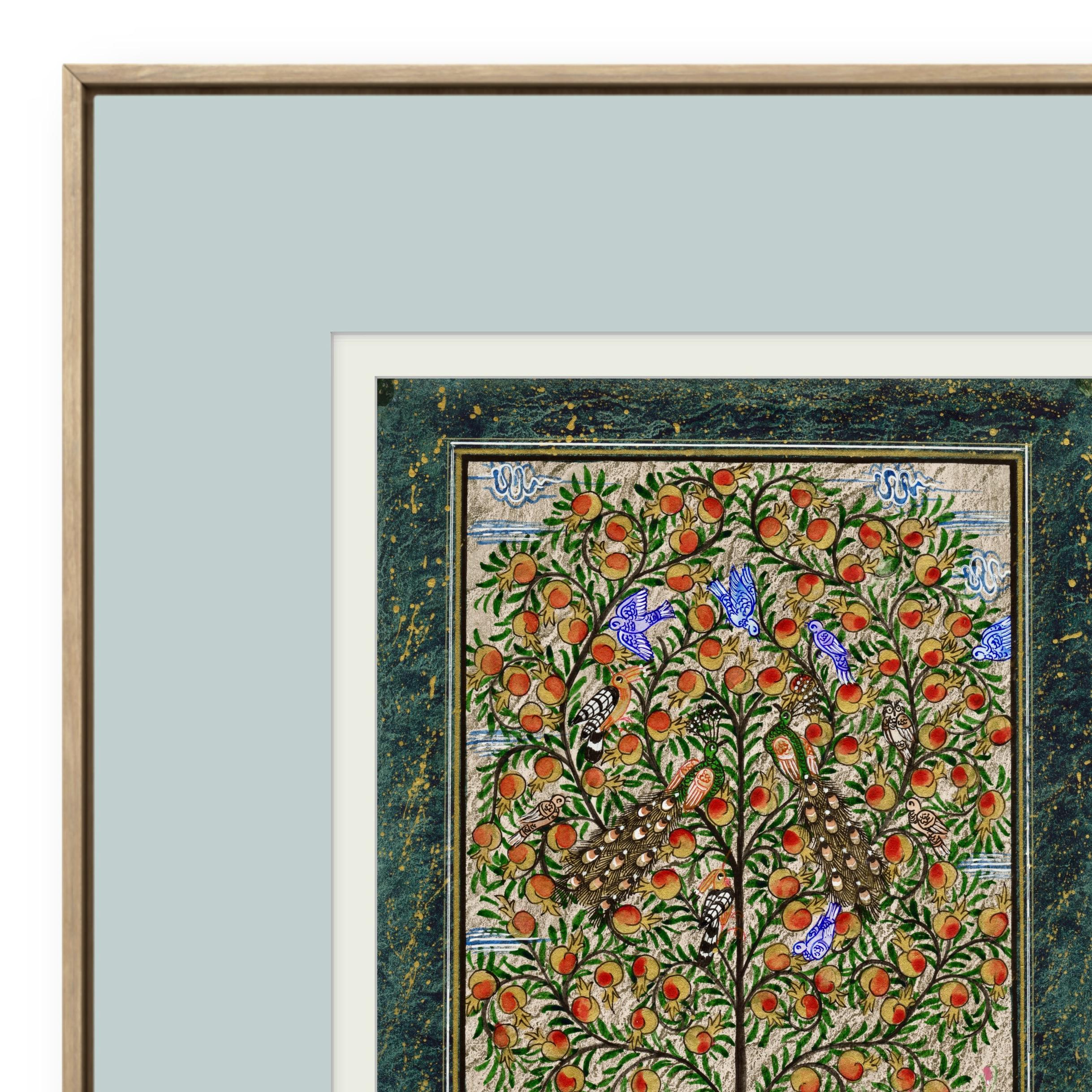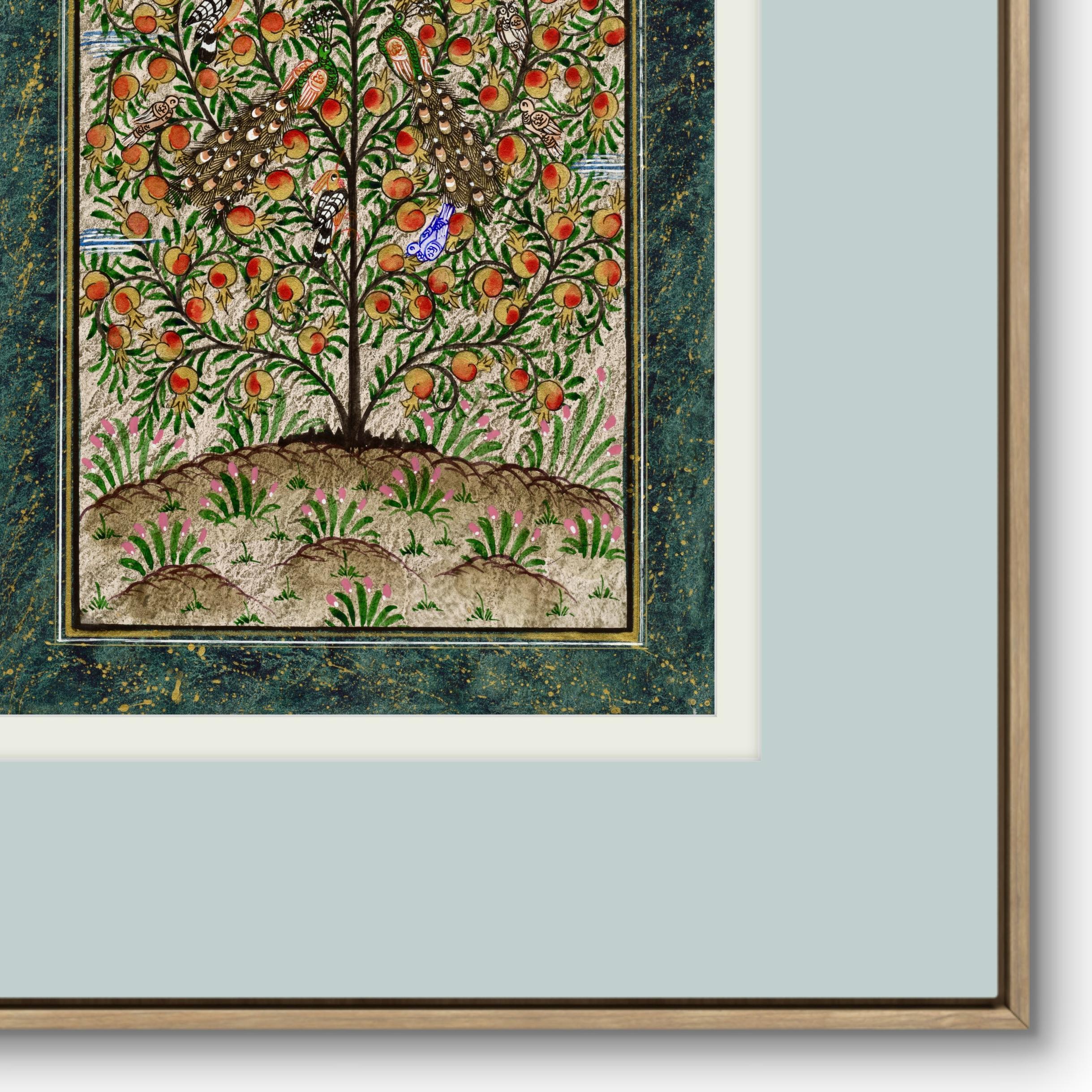 Tree of Paradise - Hoopoe Bird - Pomegranates Miniature Painting on Paper | Central Asian Cultural Heritage | Luxury Home Decor Art (MATTED)