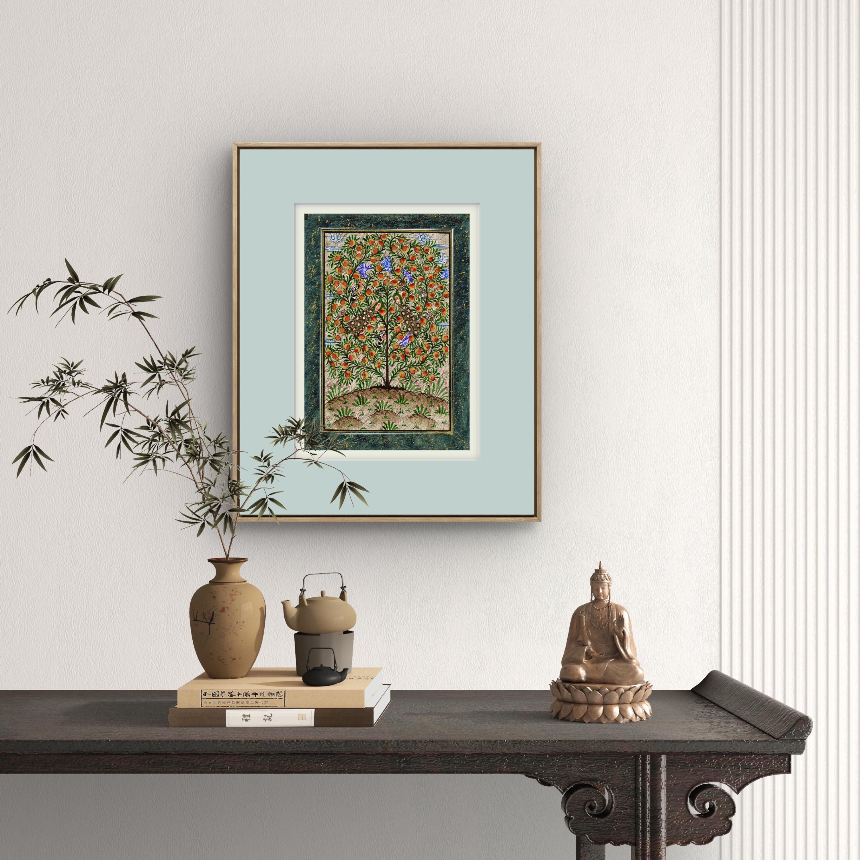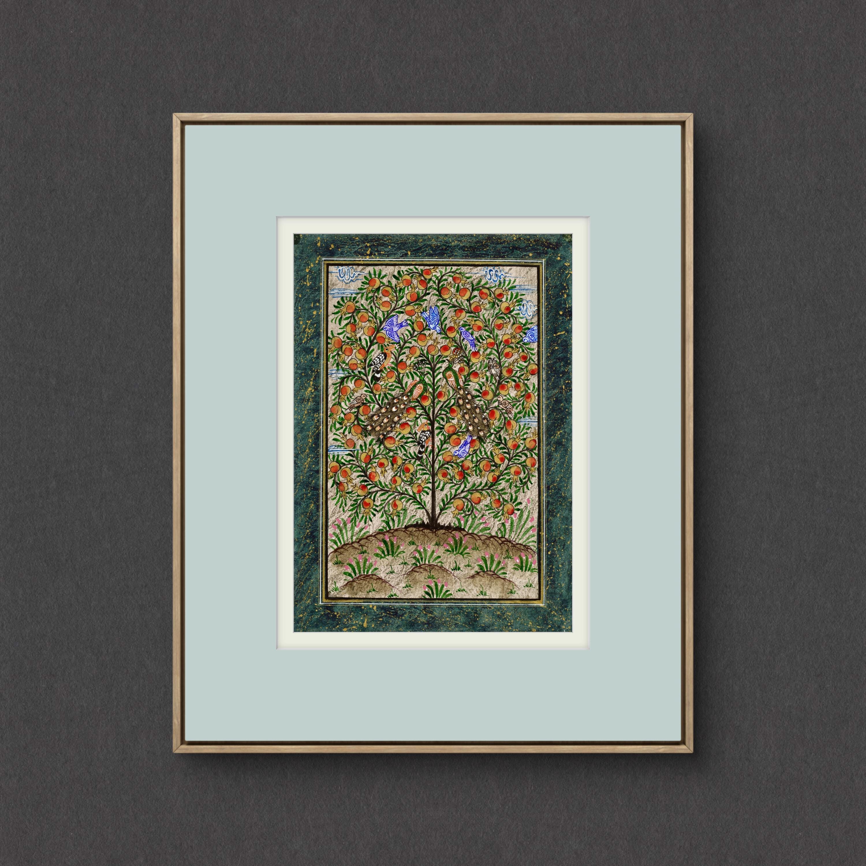 This exquisite miniature painting on cotton paper depicts the Tree of Paradise, its branches elegantly adorned with ripe pomegranates, symbolizing fertility, prosperity, and the eternal cycle of life. The intricate details of the tree are brought to life through meticulous brushwork, showcasing its lush foliage and the radiant, textured fruits that provide a striking visual contrast to the soft background.