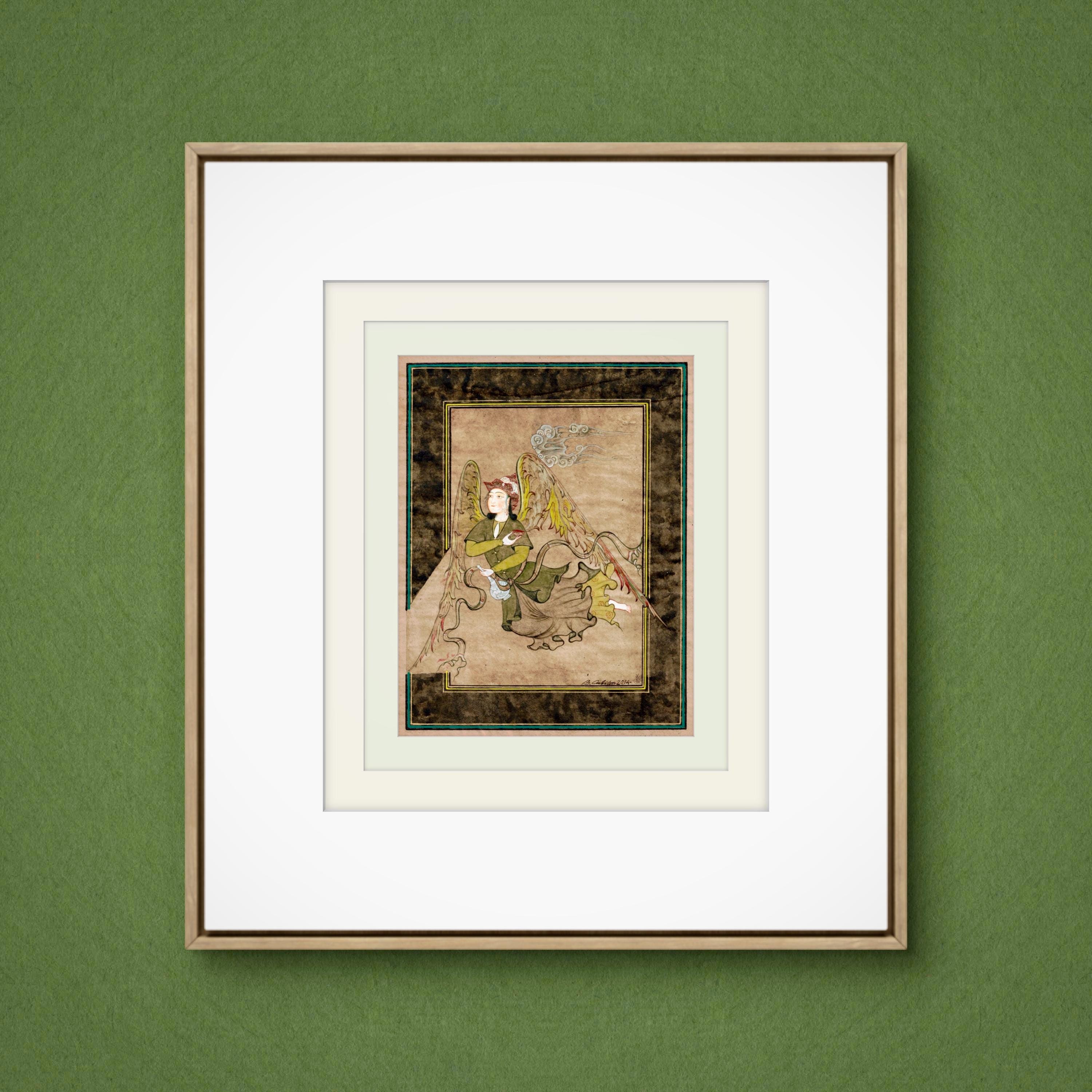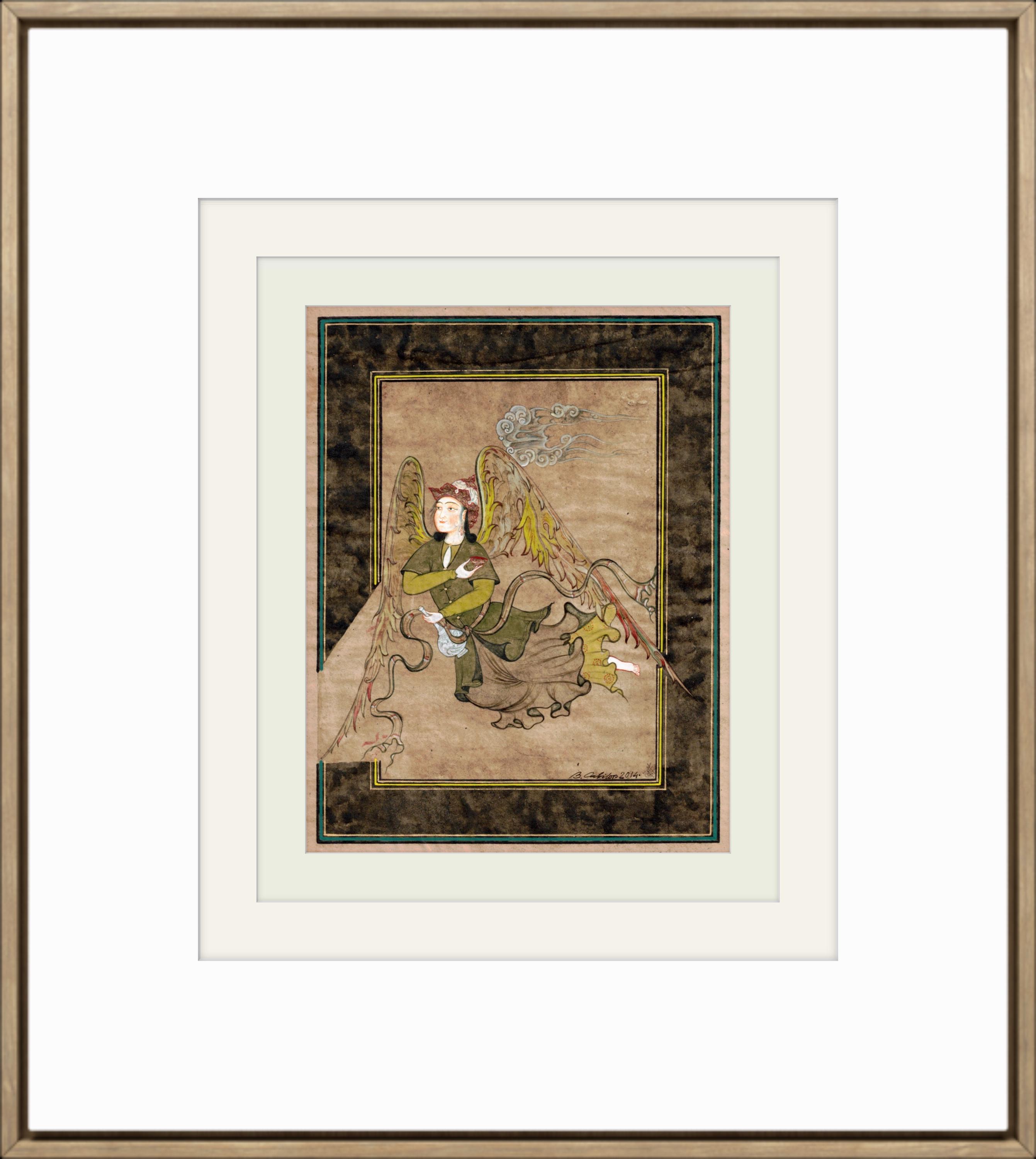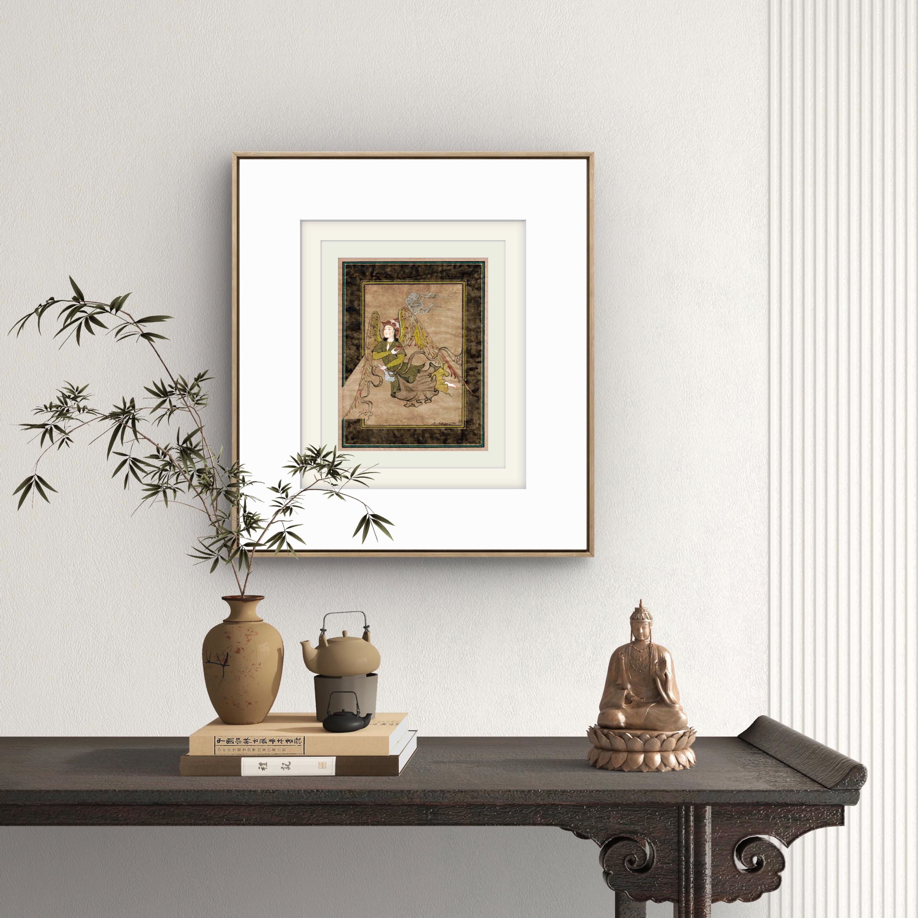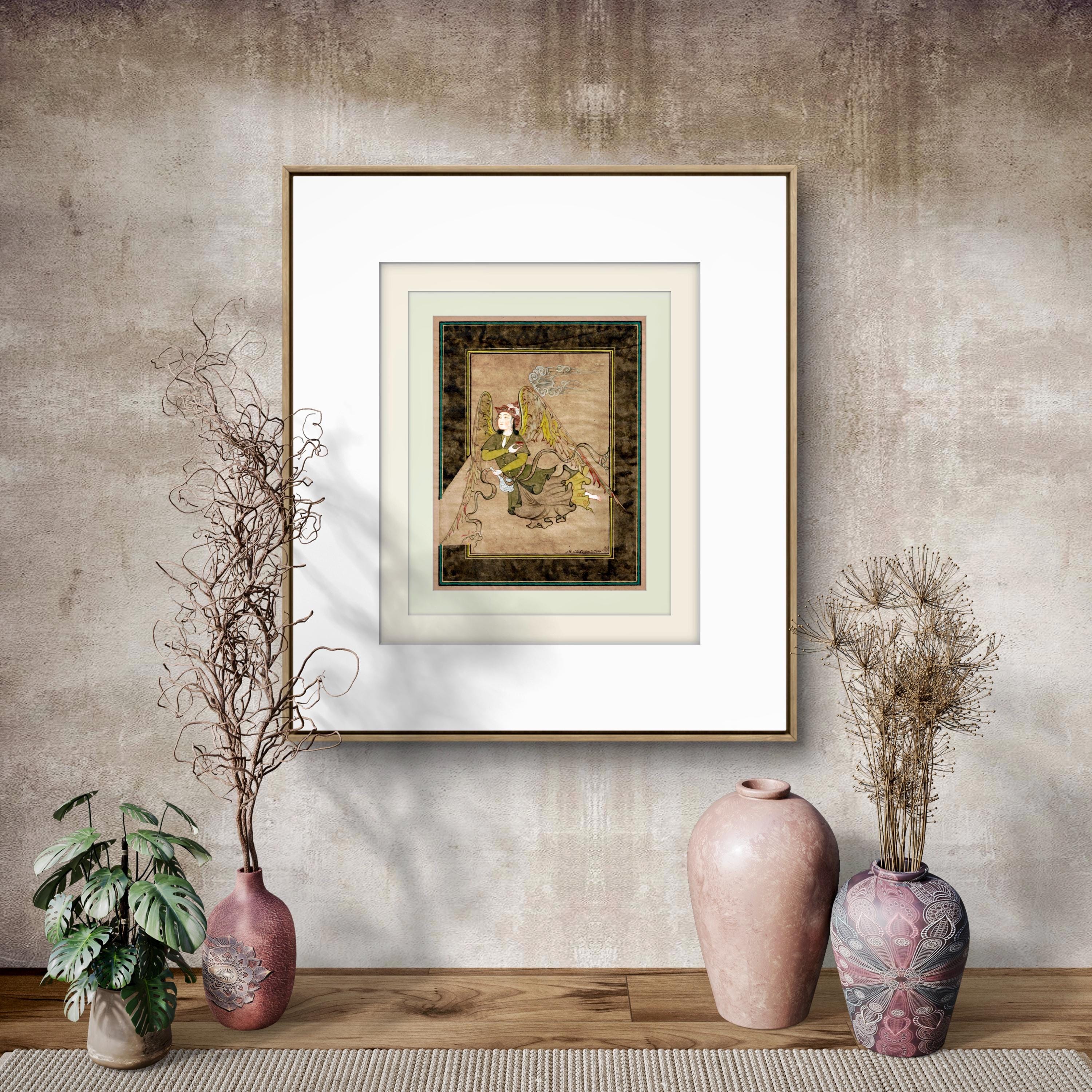 Illustration of Angel “PERI” Holding a Flask Historical Oriental Miniature reproduction | On Fine Antique Silk Paper | Exclusive piece