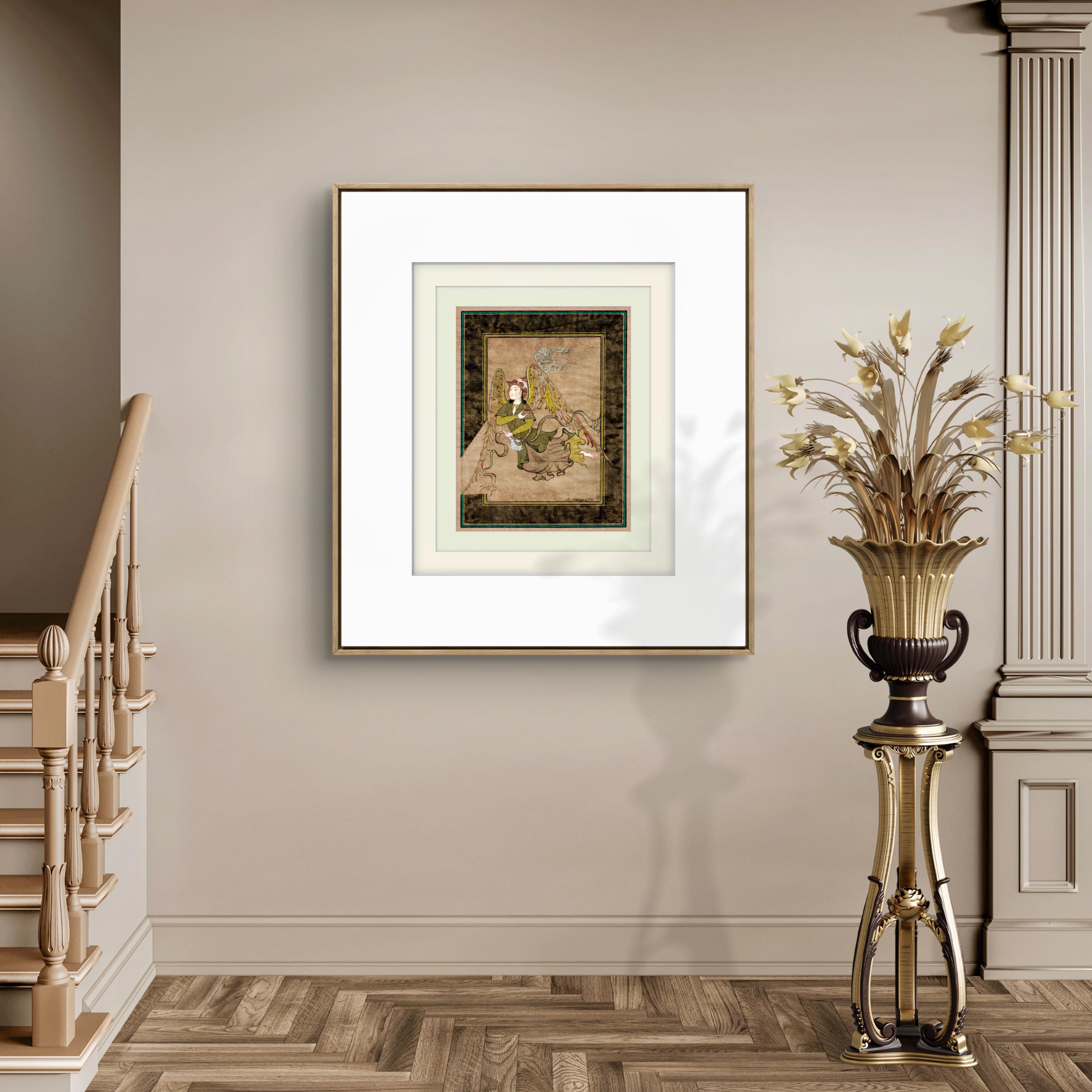 The composition depicts a Peri, a celestial and benevolent being deeply rooted in Islam and Ottoman visual culture. In Ottoman miniature tradition, Peris symbolize purity, grace, spiritual protection, and divine presence. The flask held by the Peri is a symbolic vessel, often interpreted as a sign of healing essence, sacred knowledge, or divine sustenance, reinforcing the spiritual nature of the figure.