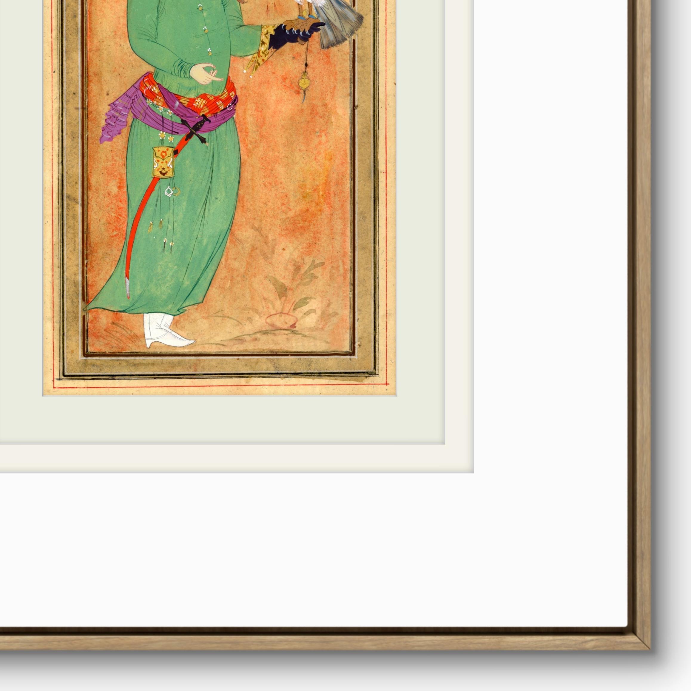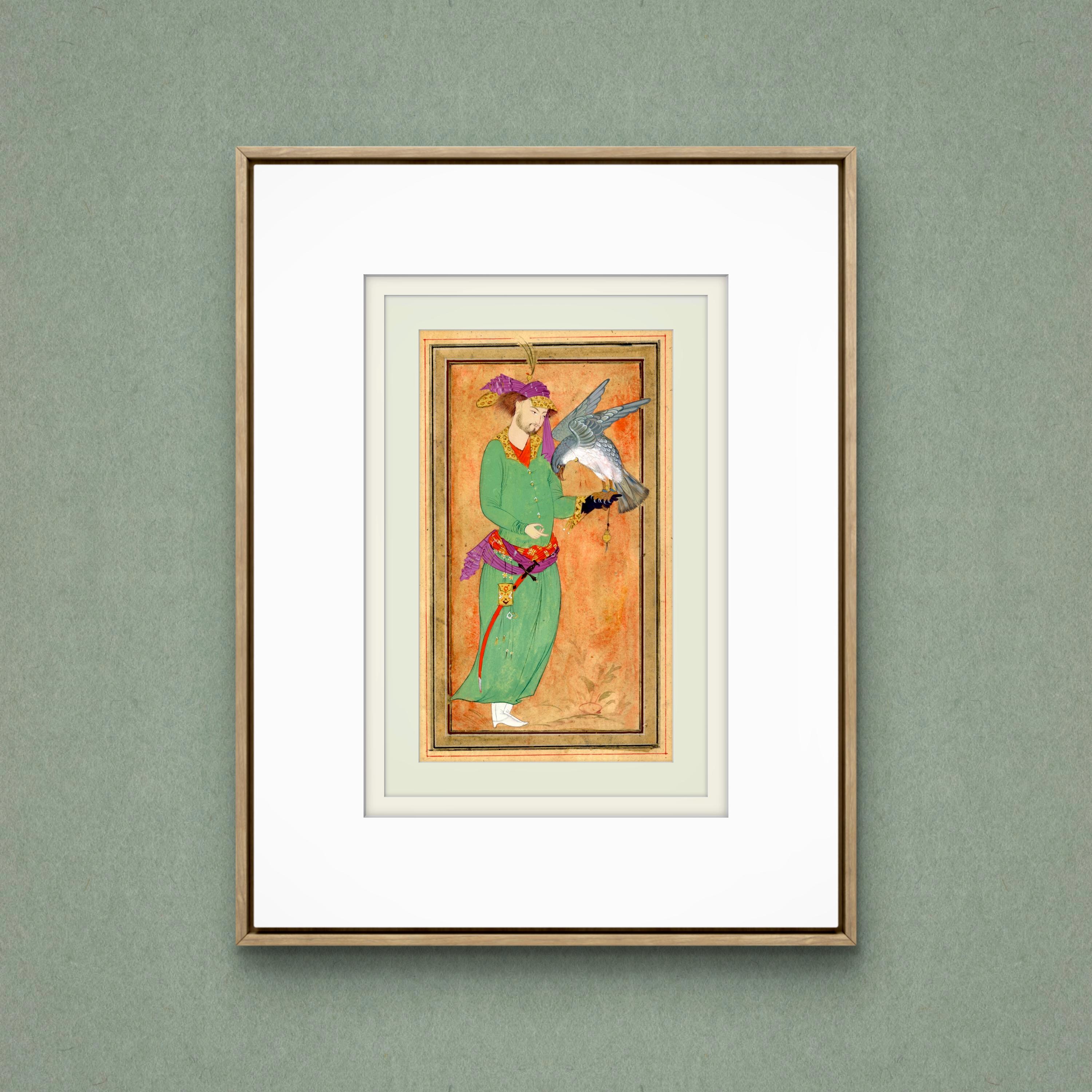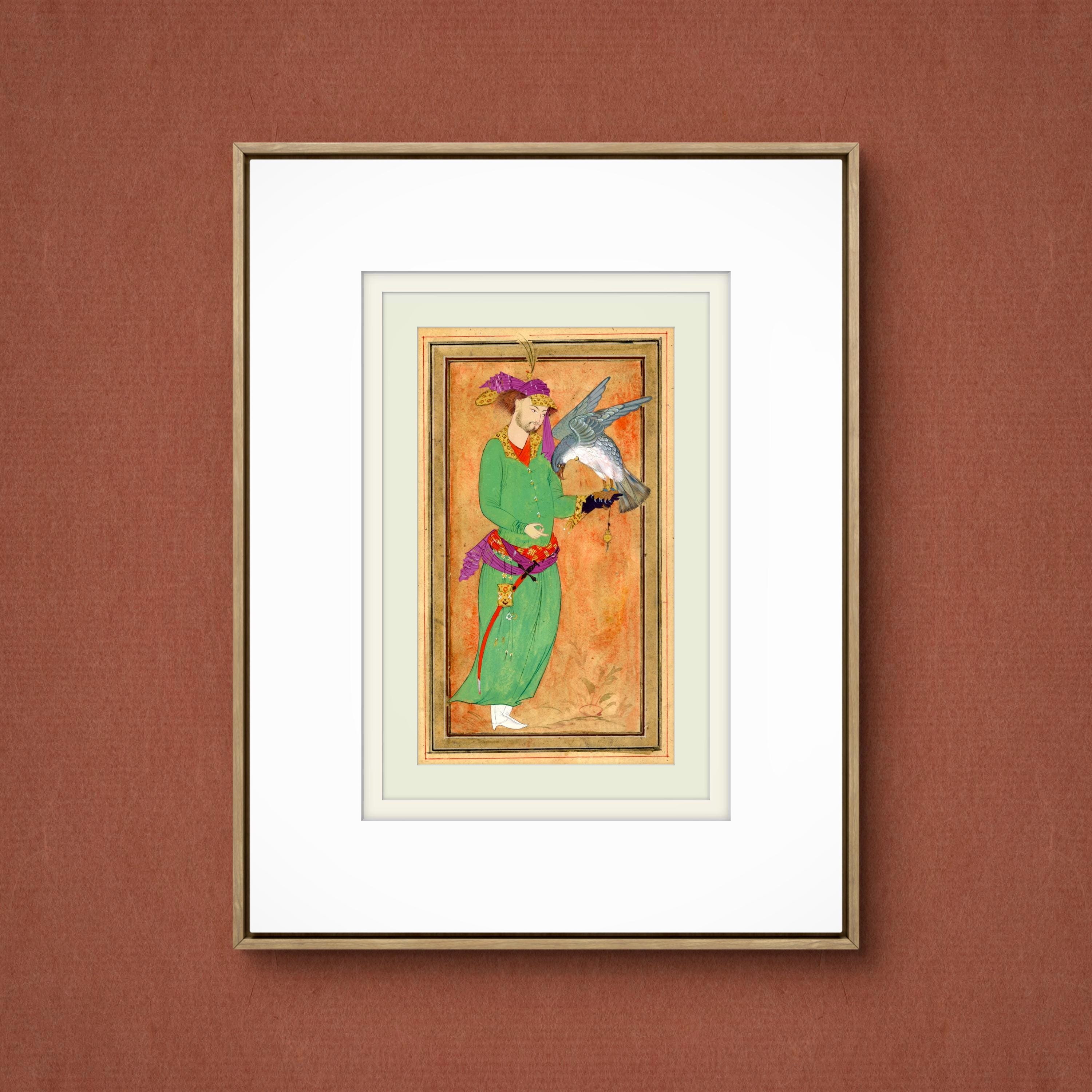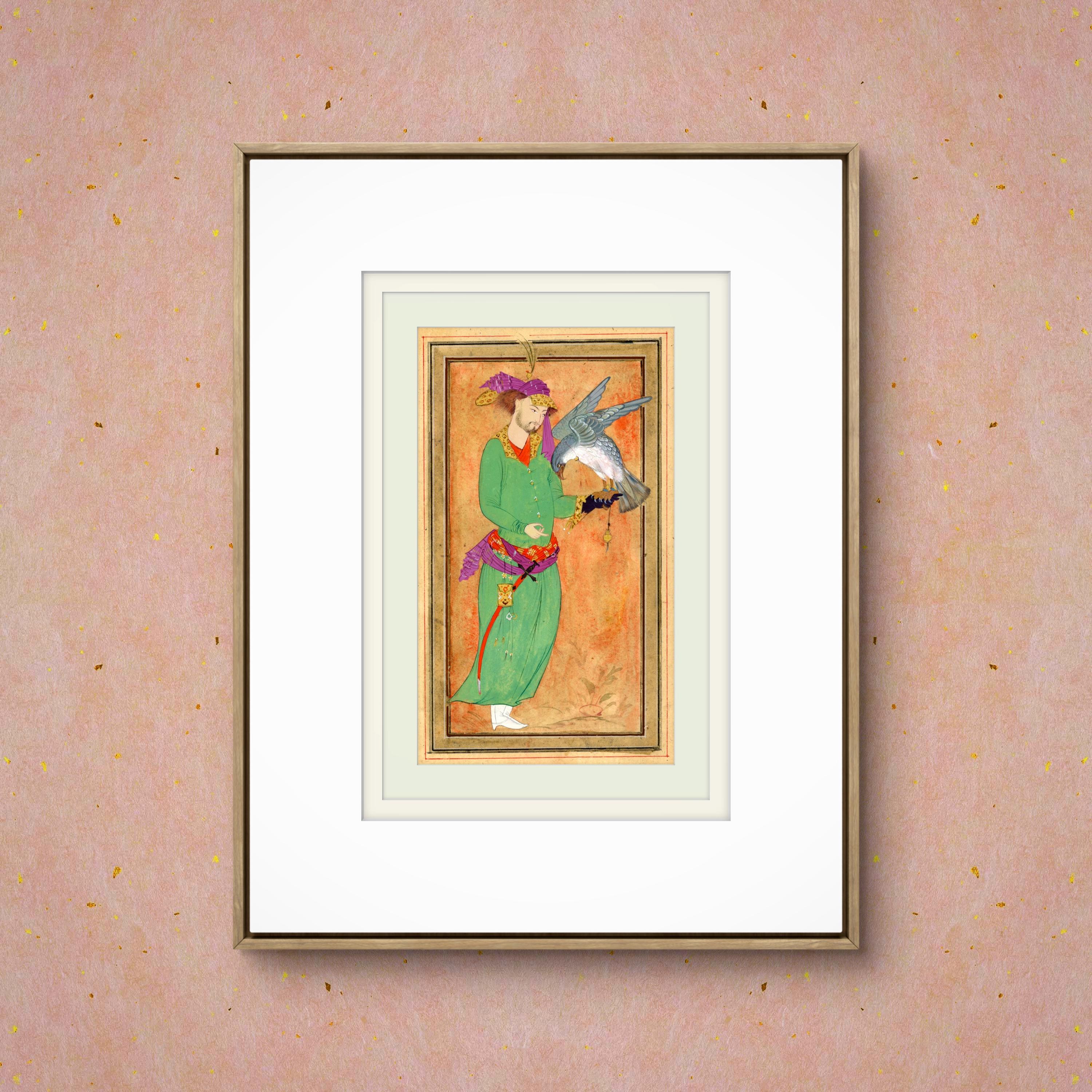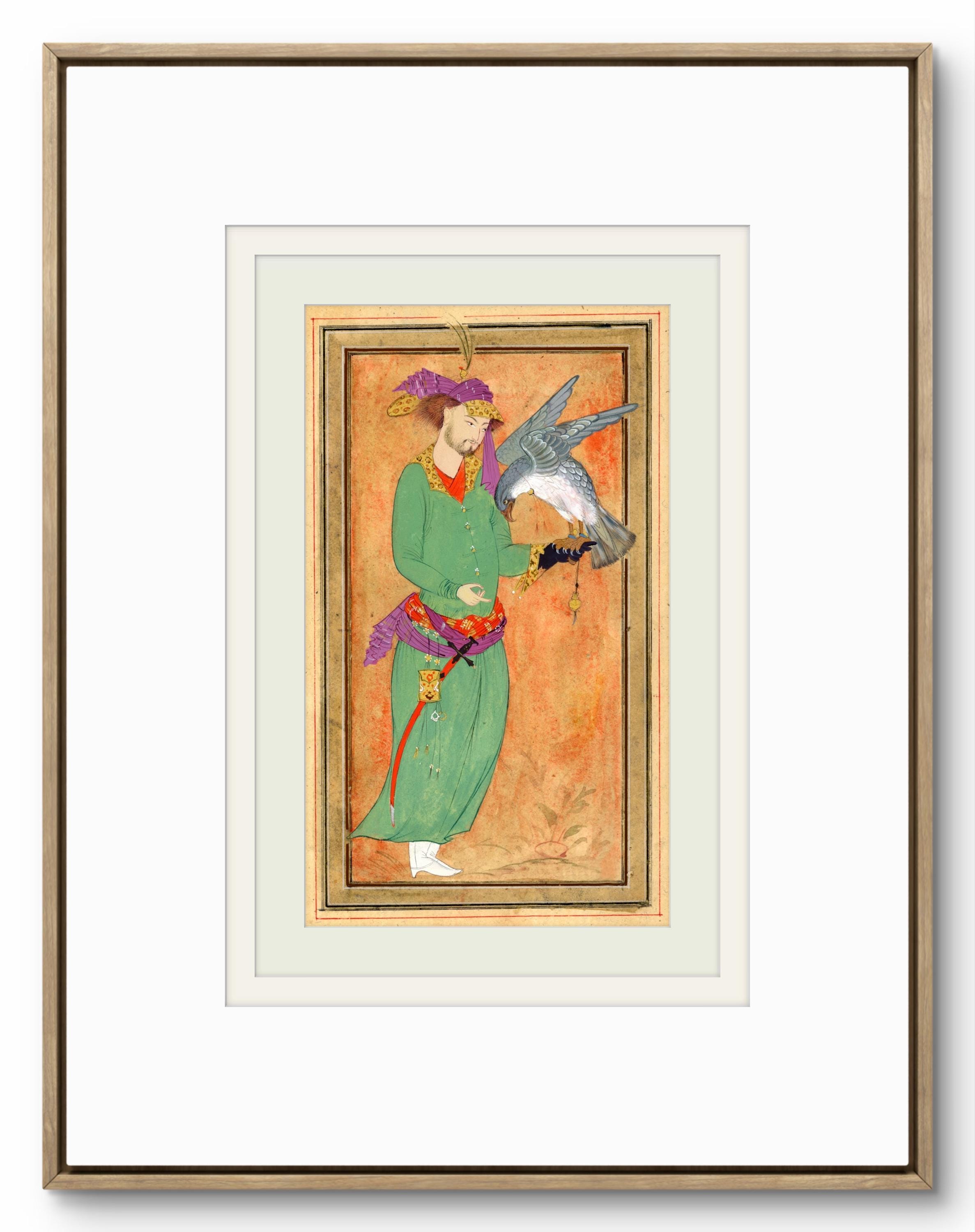 This artwork is inspired by classical Persian miniature painting traditions, depicting a royal hunter holding his falcon - a symbol of nobility, elegance, and the timeless relationship between man and nature in Islam and Oriental court culture.