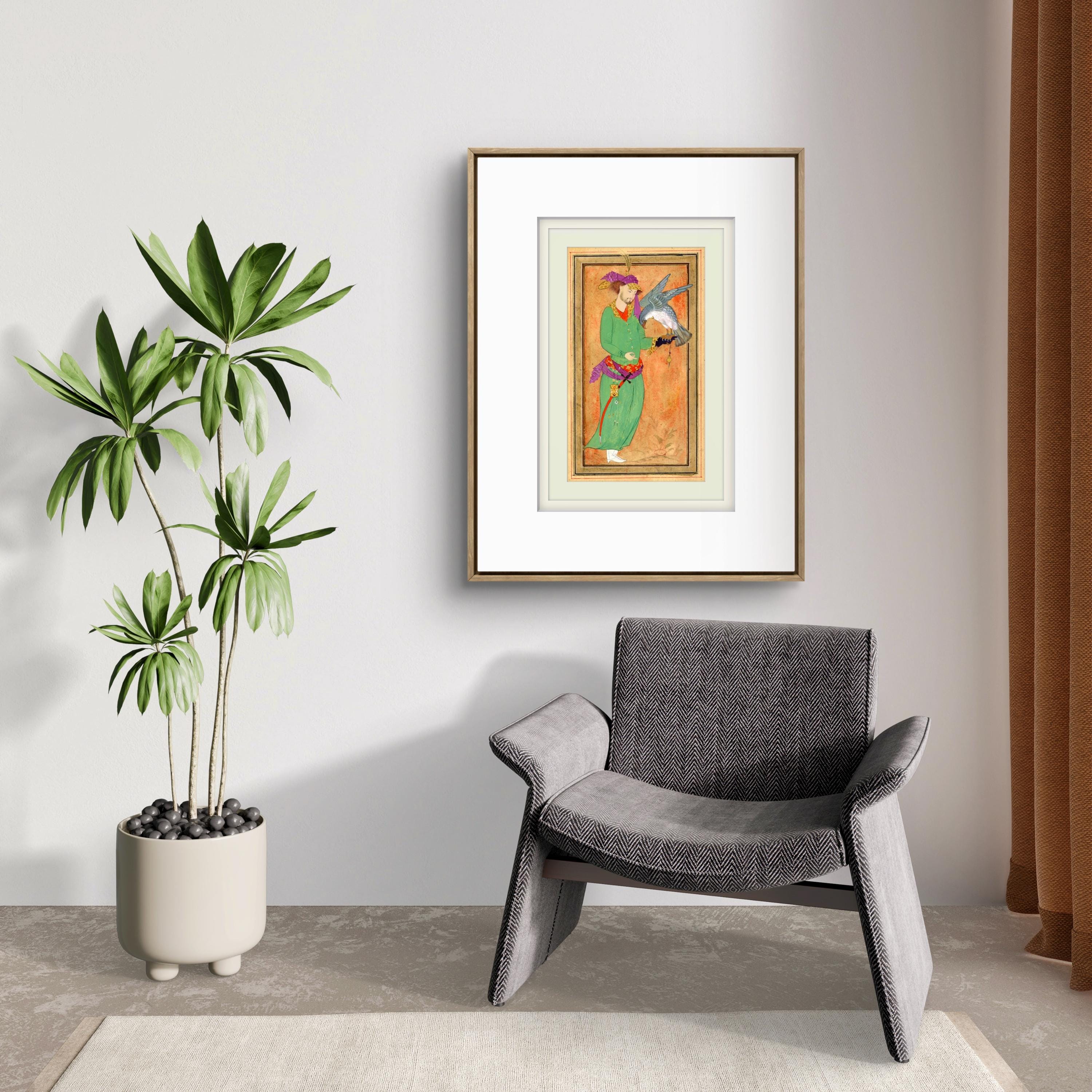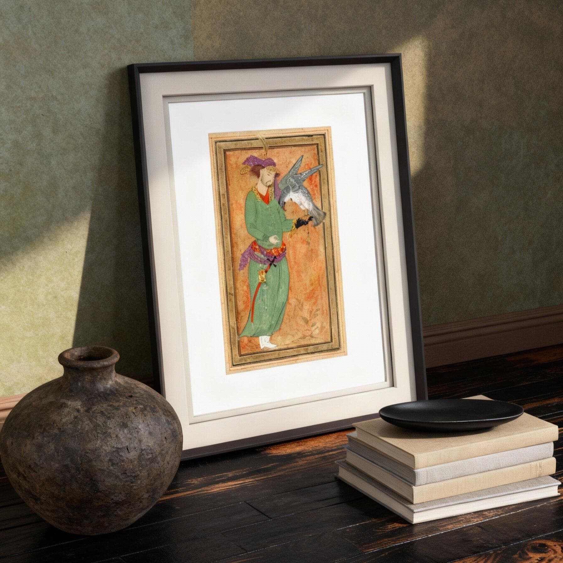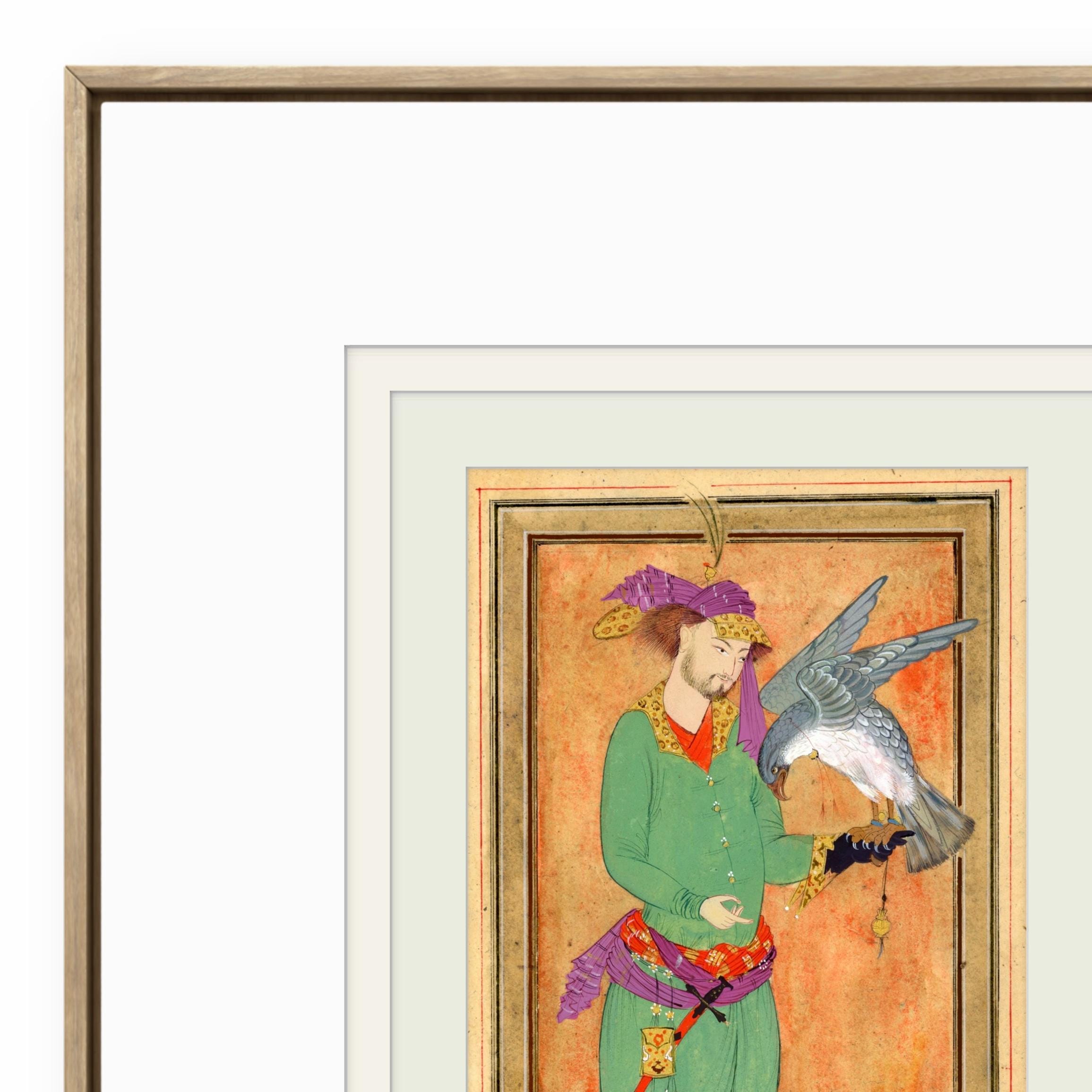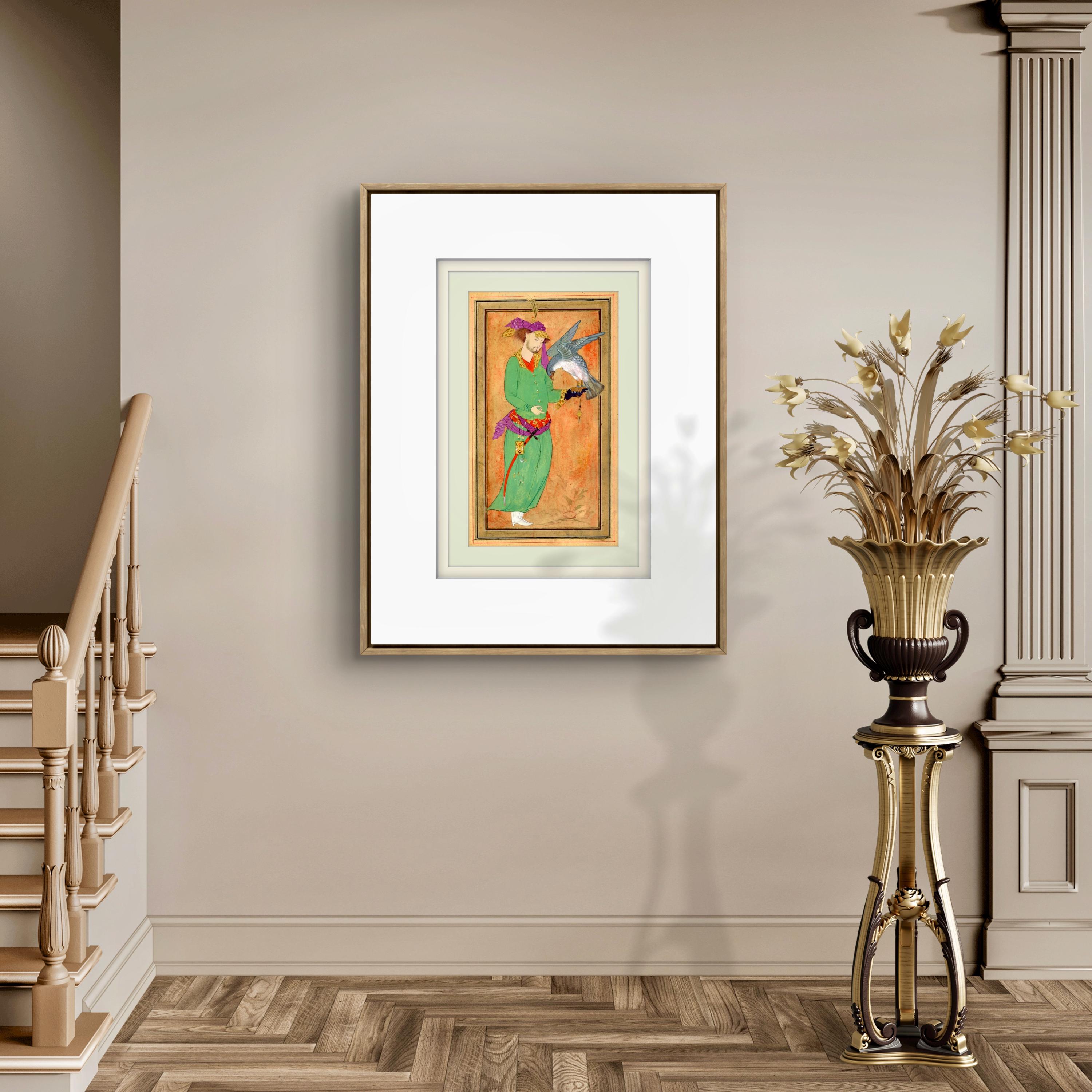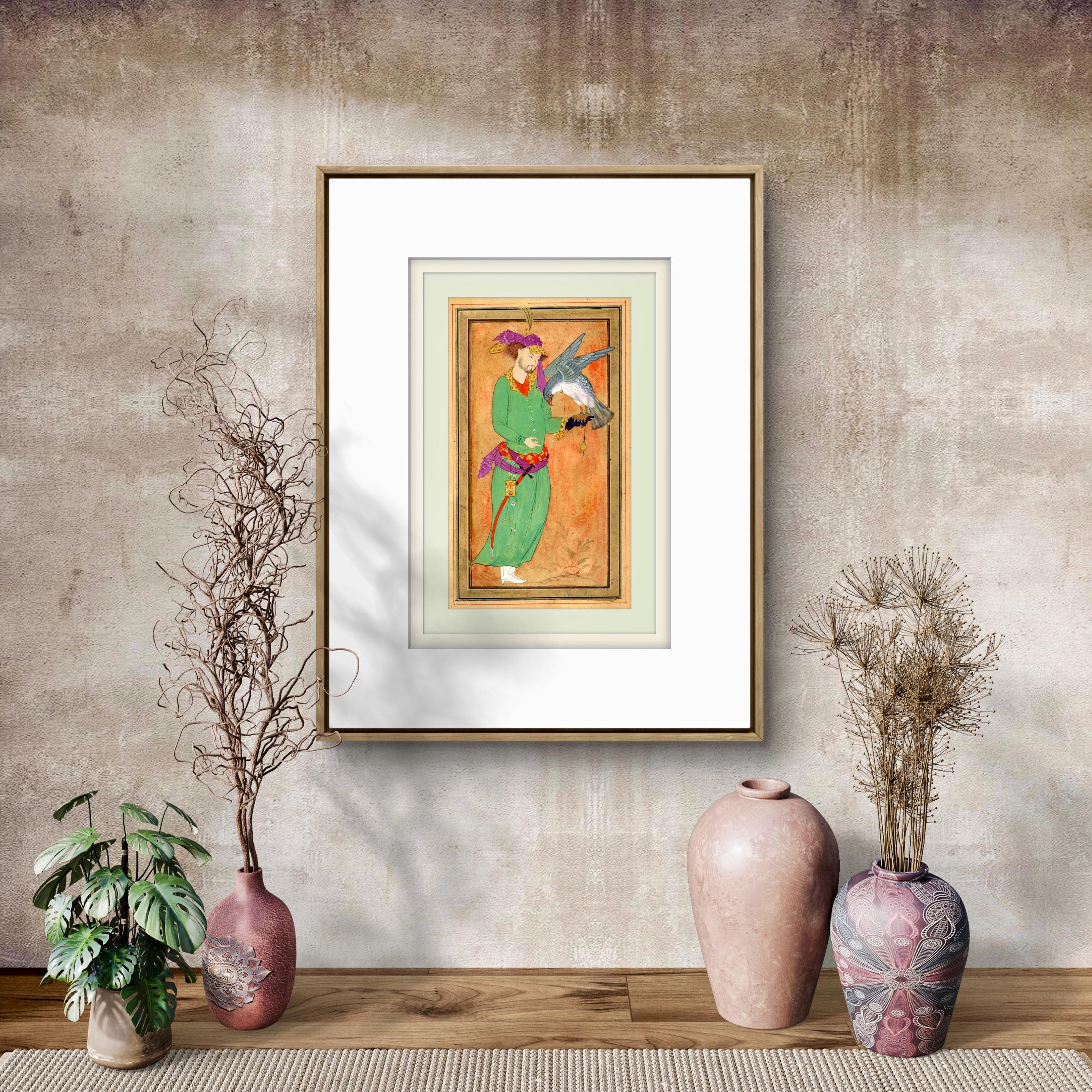 This artwork is inspired by classical Persian miniature painting traditions, depicting a royal hunter holding his falcon - a symbol of nobility, elegance, and the timeless relationship between man and nature in Islam and Oriental court culture.