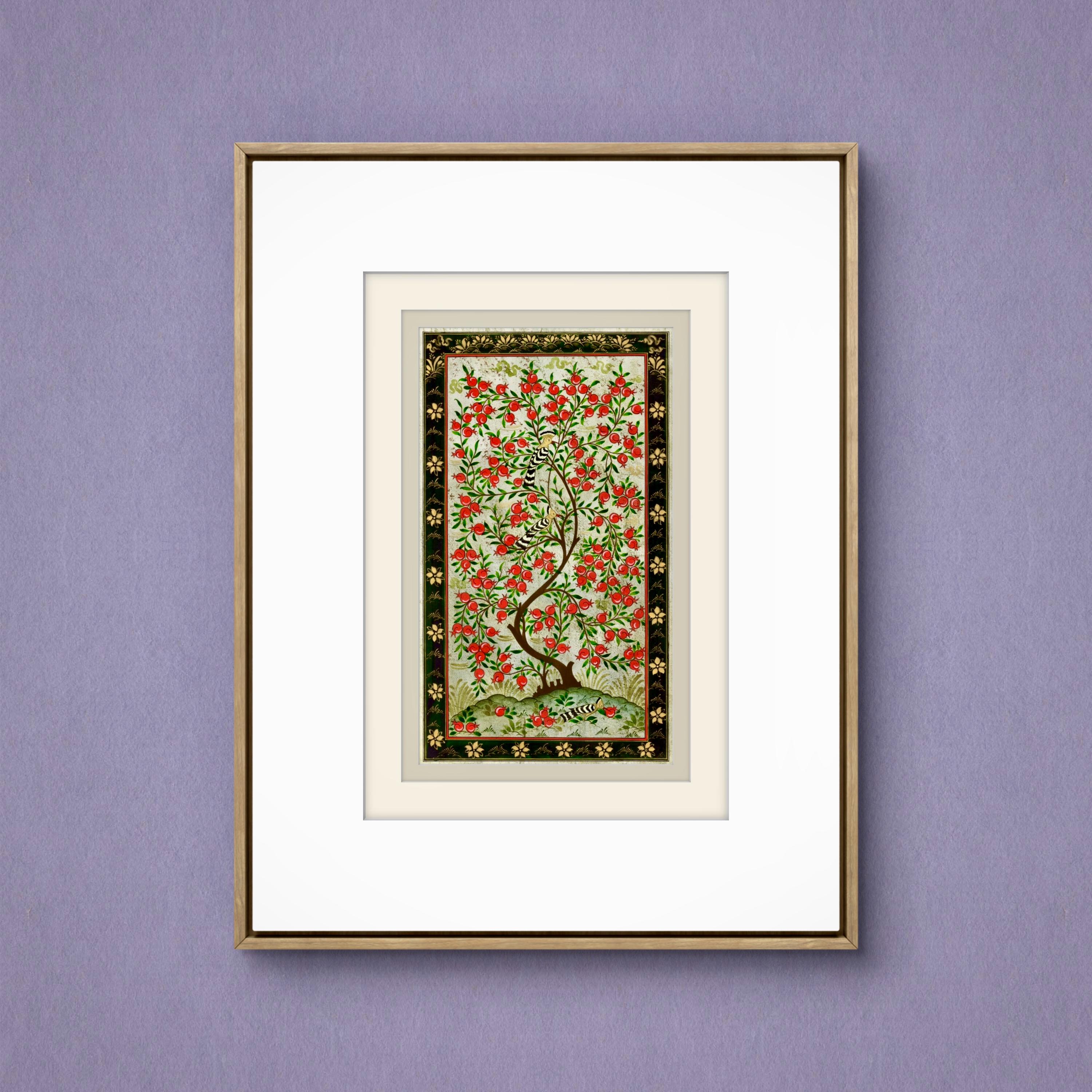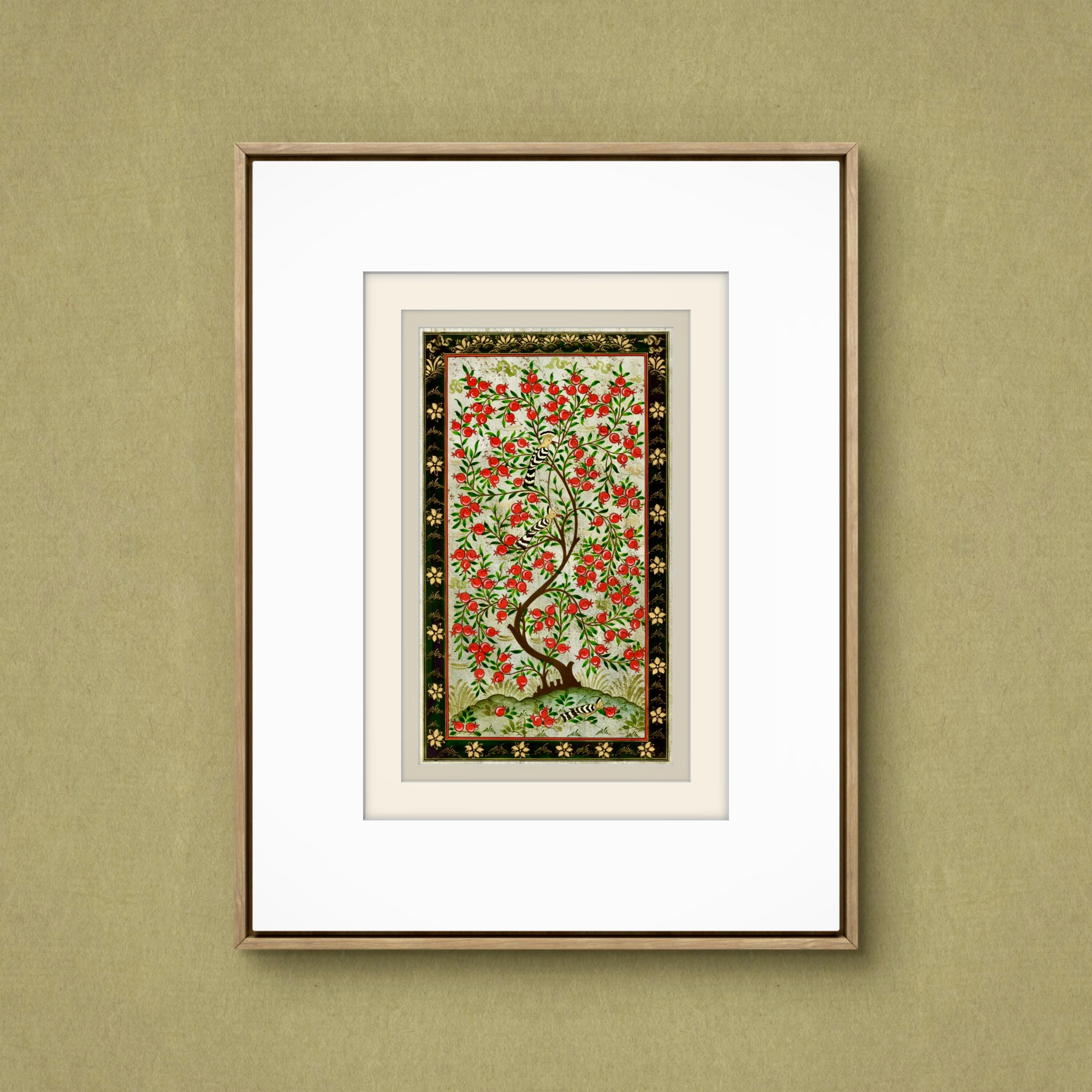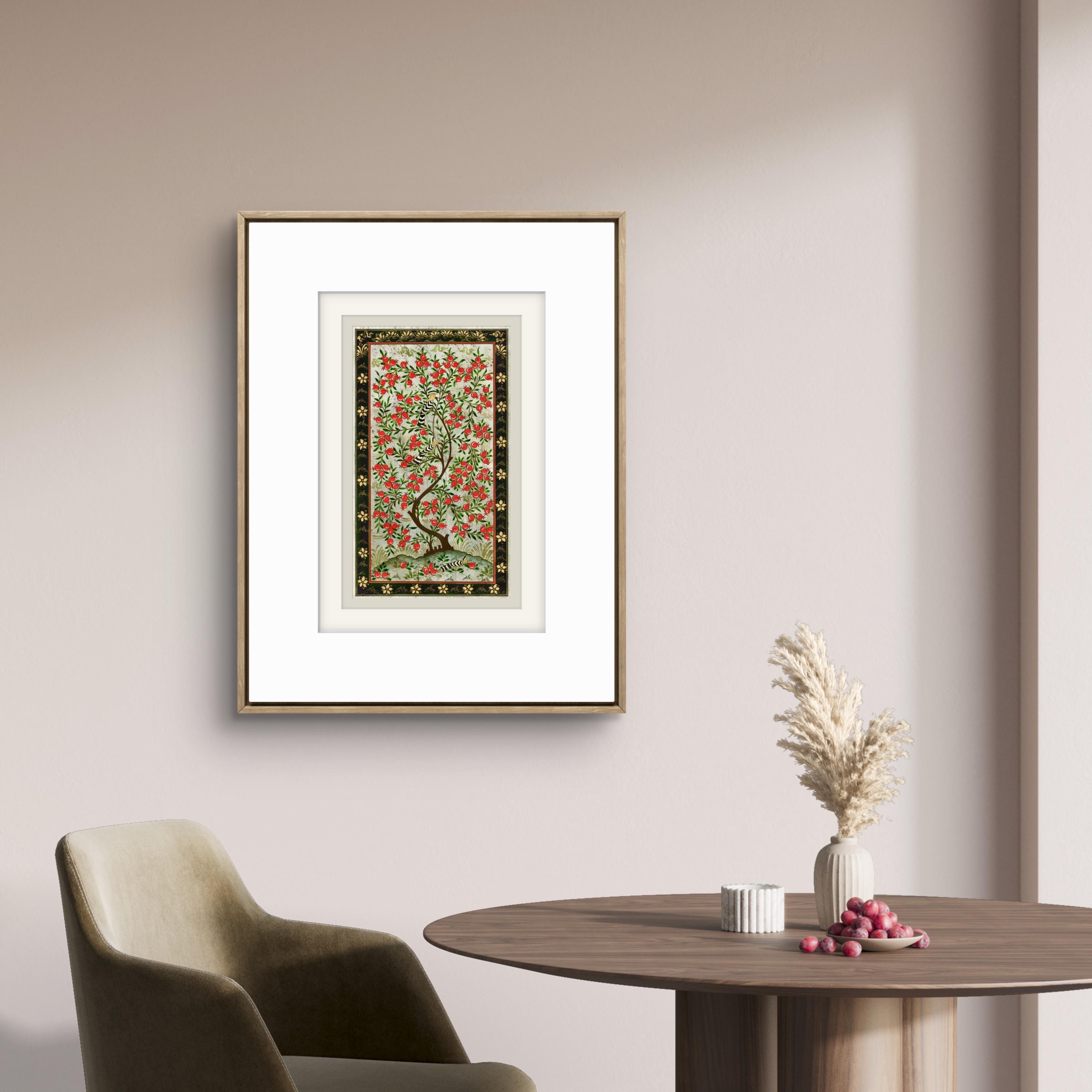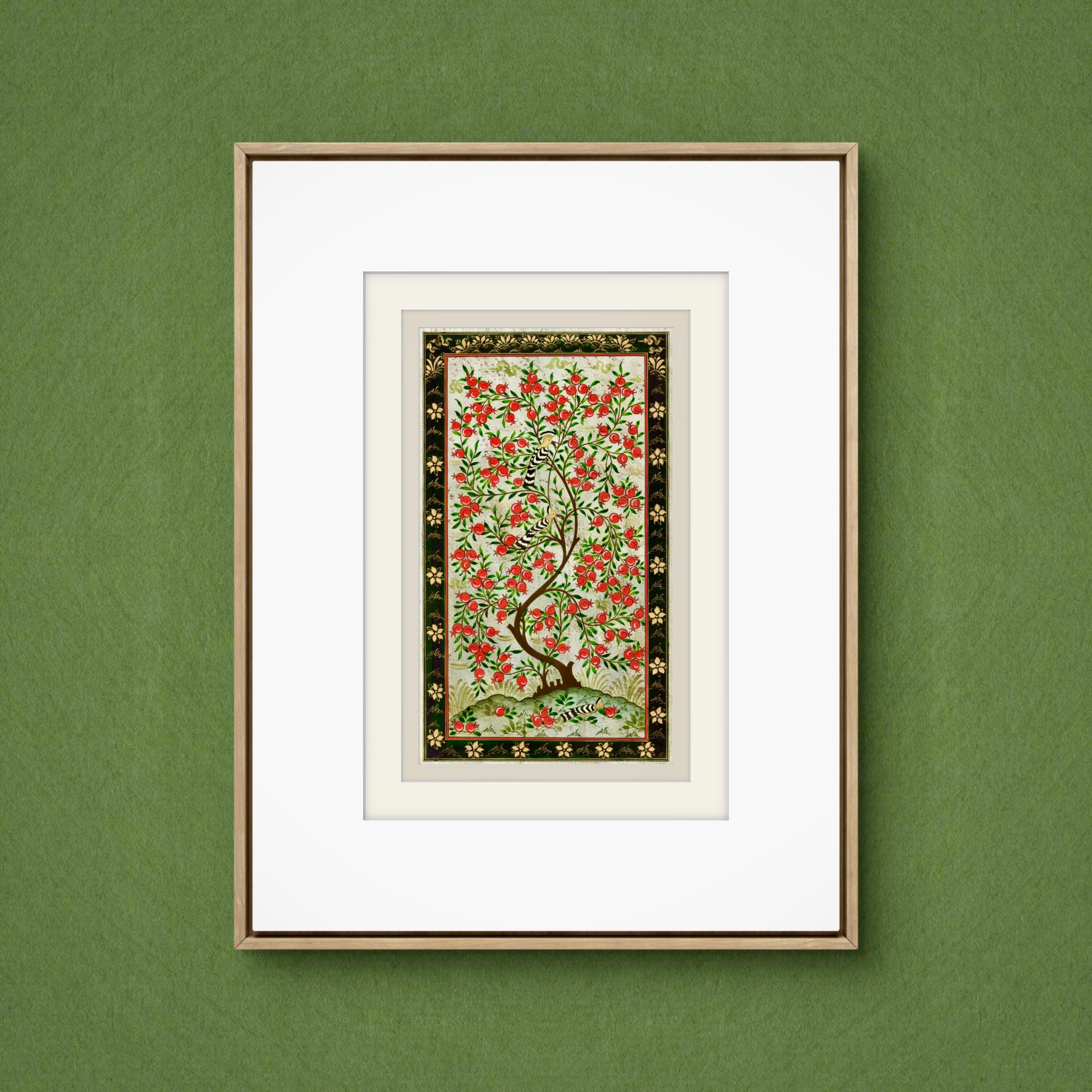 This exquisite miniature painting on silk paper depicts the Tree of Paradise, its branches elegantly adorned with ripe pomegranates, symbolizing fertility, prosperity, and the eternal cycle of life. The intricate details of the tree are brought to life through meticulous brushwork, showcasing its lush foliage and the radiant, textured fruits that provide a striking visual contrast to the soft background.