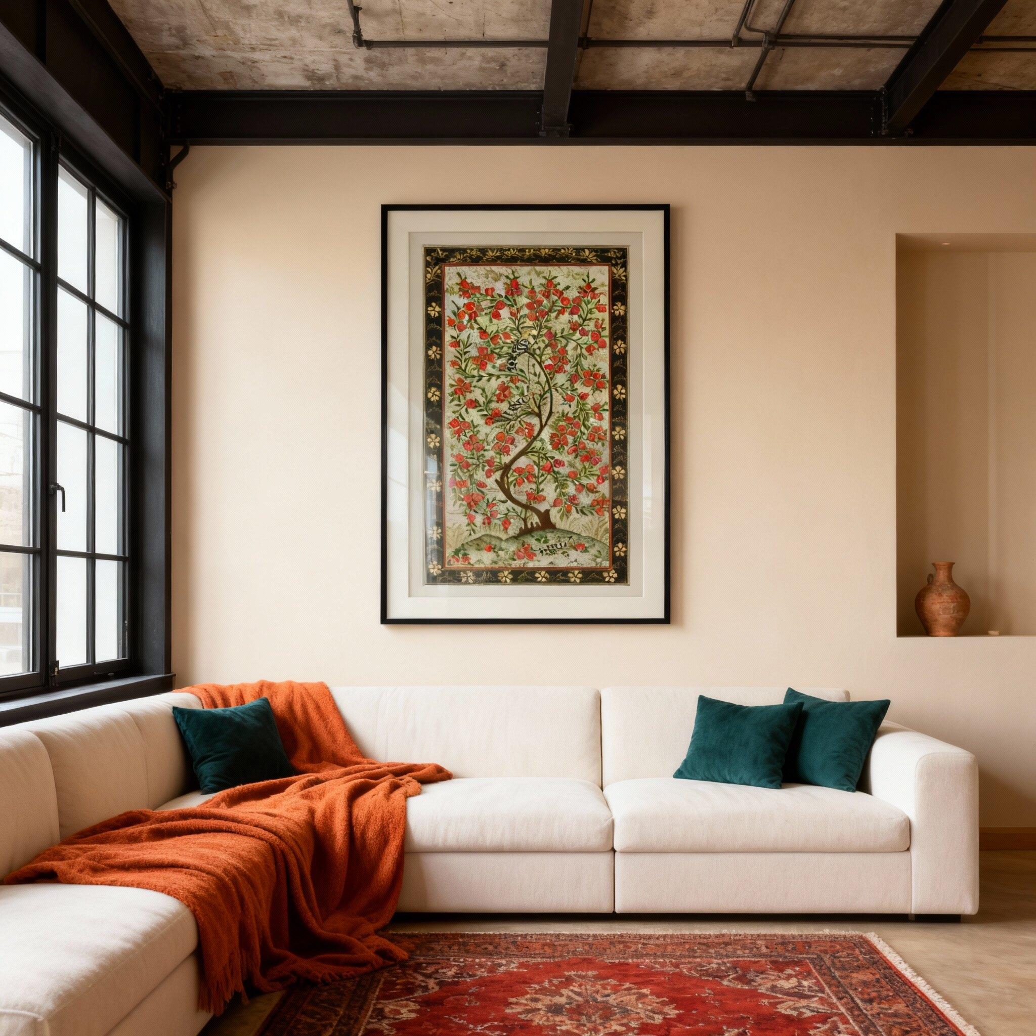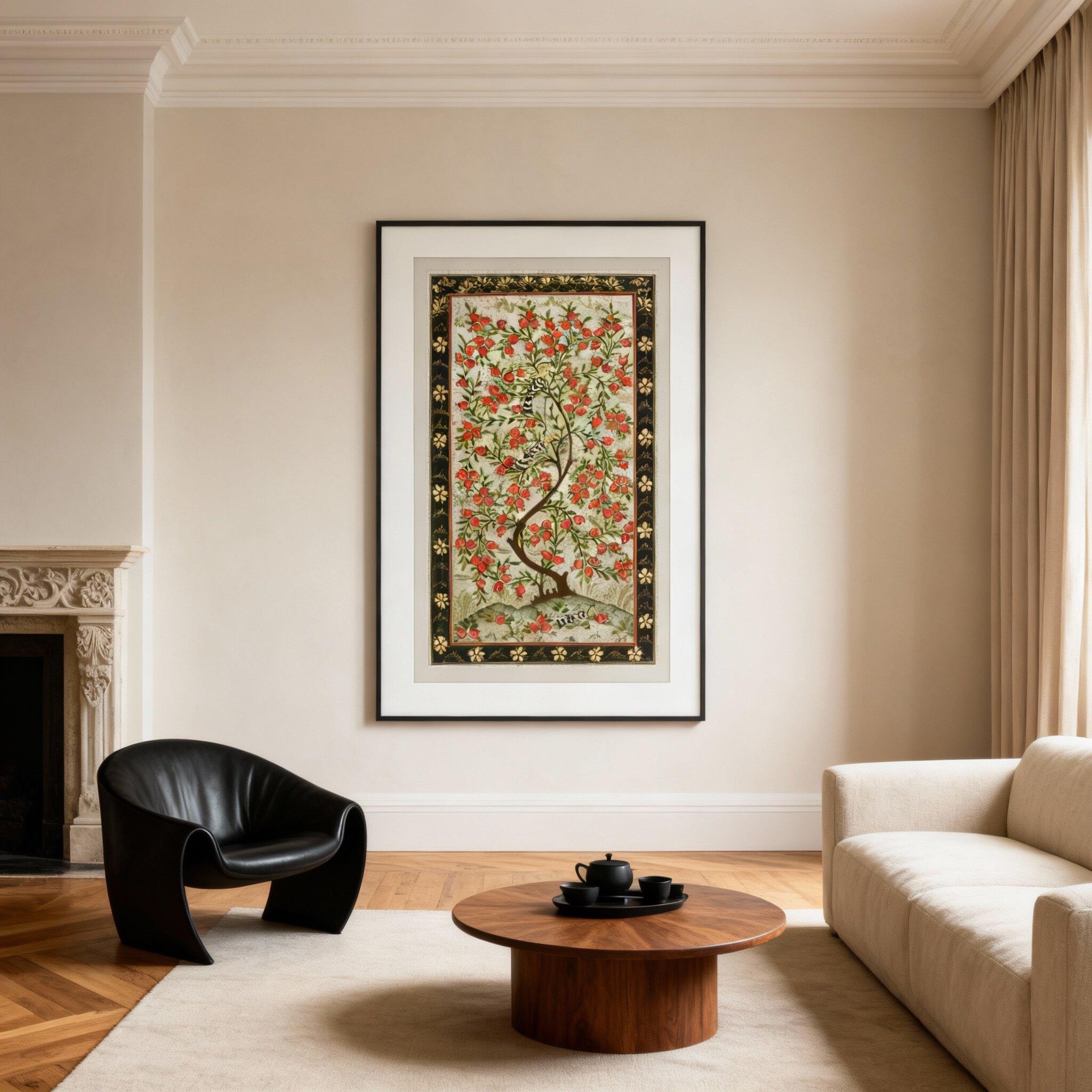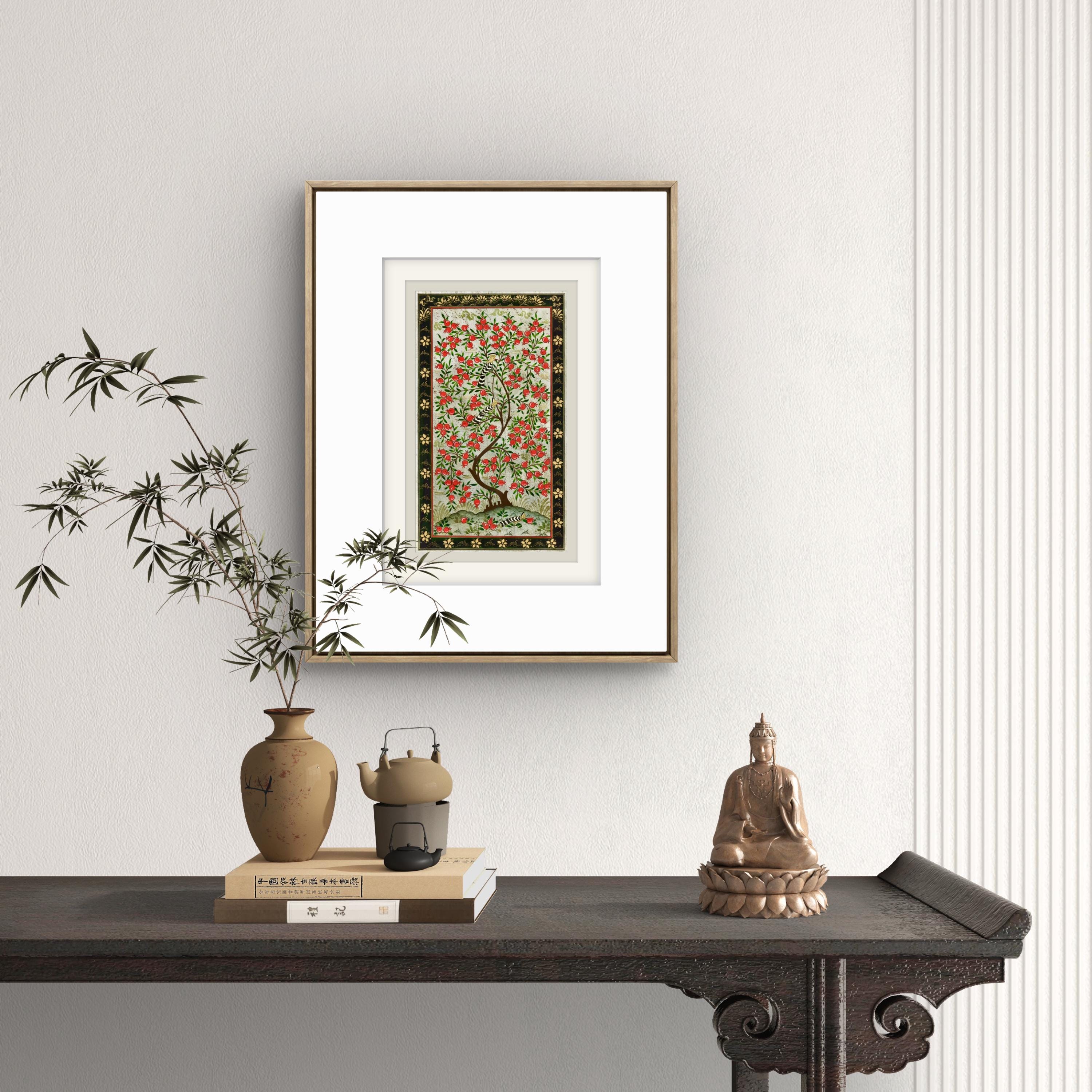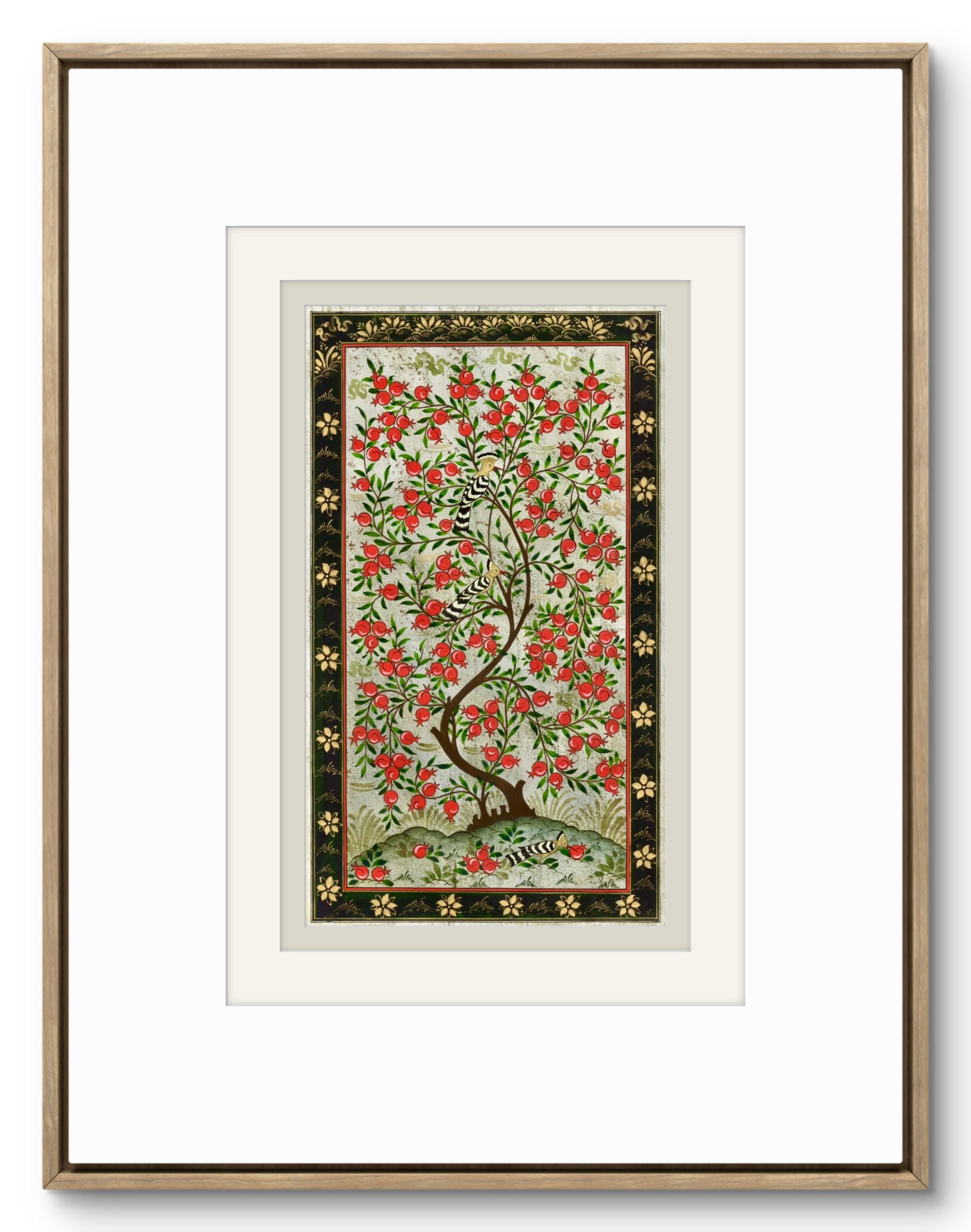 This exquisite miniature painting on silk paper depicts the Tree of Paradise, its branches elegantly adorned with ripe pomegranates, symbolizing fertility, prosperity, and the eternal cycle of life. The intricate details of the tree are brought to life through meticulous brushwork, showcasing its lush foliage and the radiant, textured fruits that provide a striking visual contrast to the soft background.