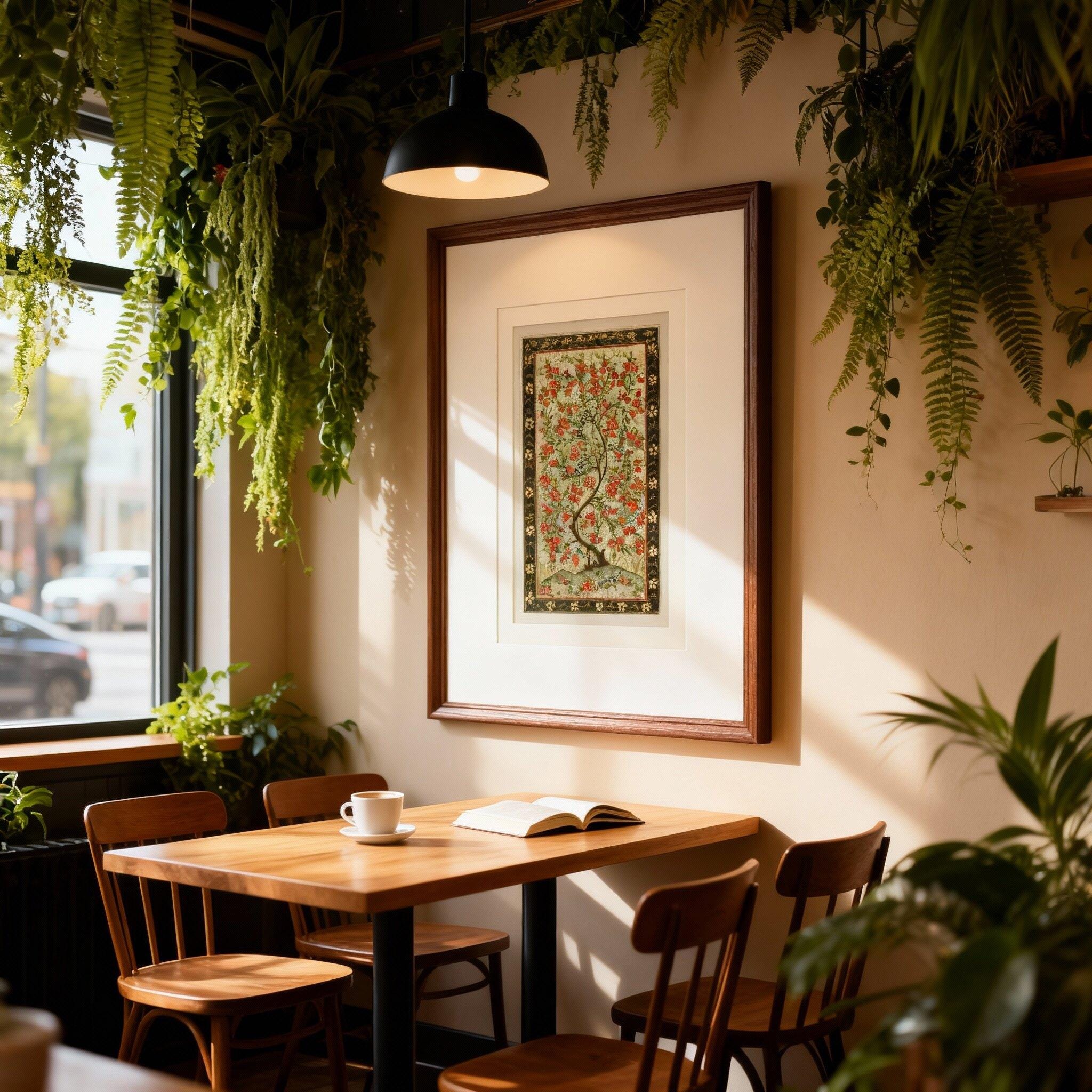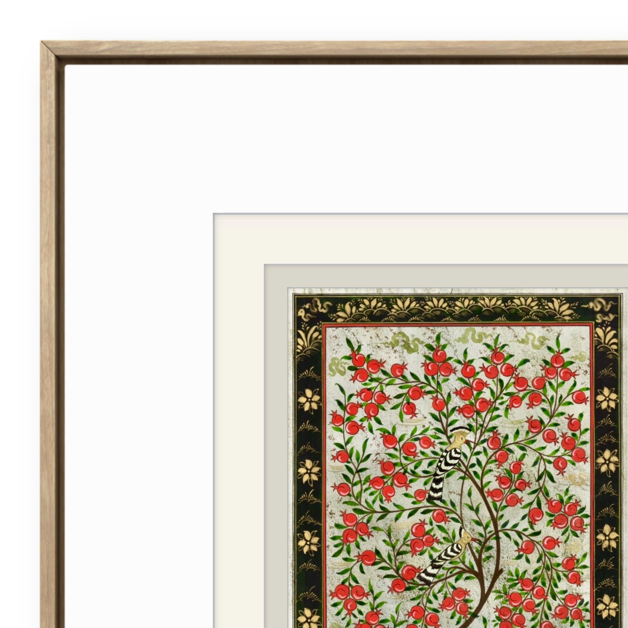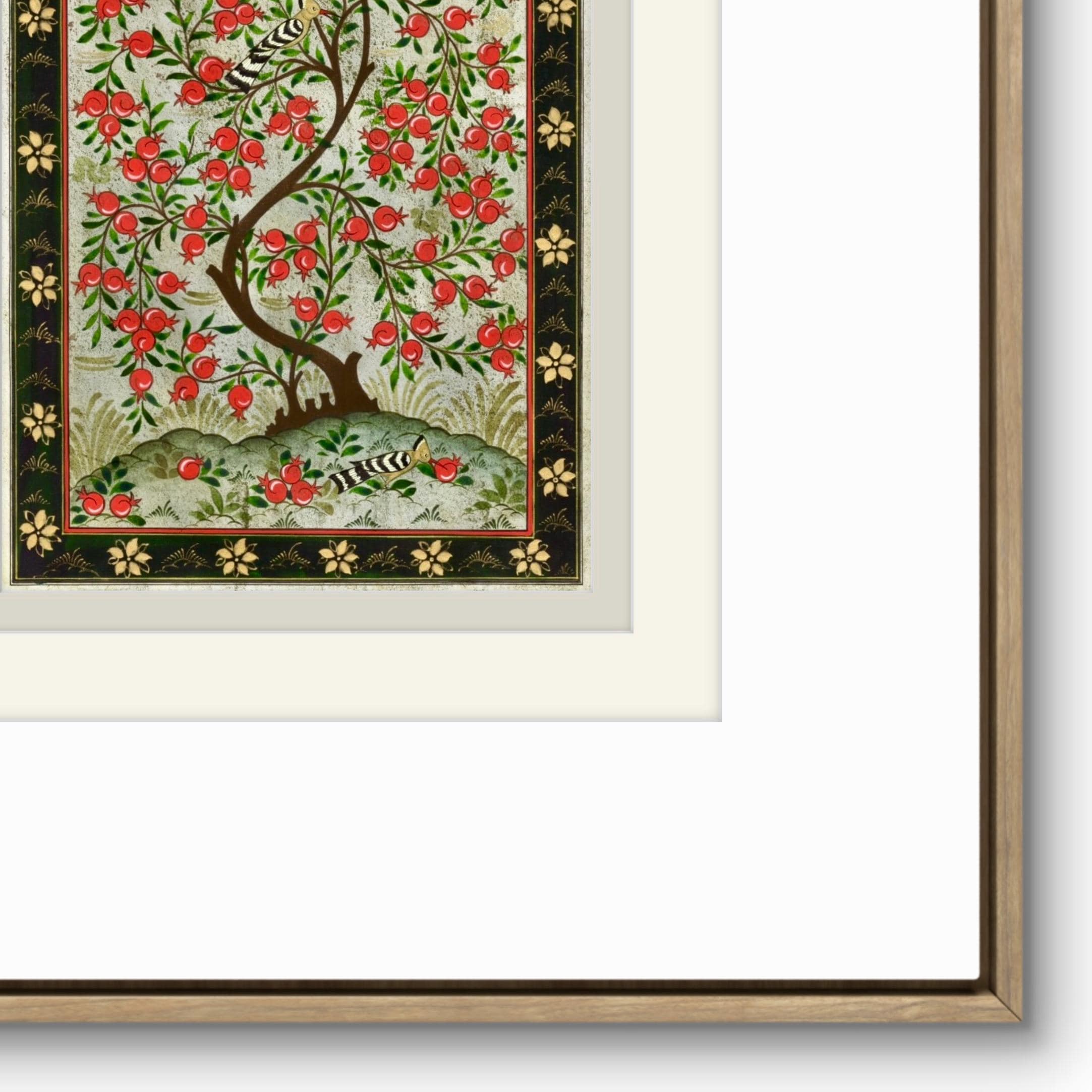 “Tree of Paradise: Pomegranates and Hoopoe Birds” captures the essence of spiritual beauty, the interconnectedness of life, and the serene balance of nature, all encapsulated in the timeless art of miniature painting.