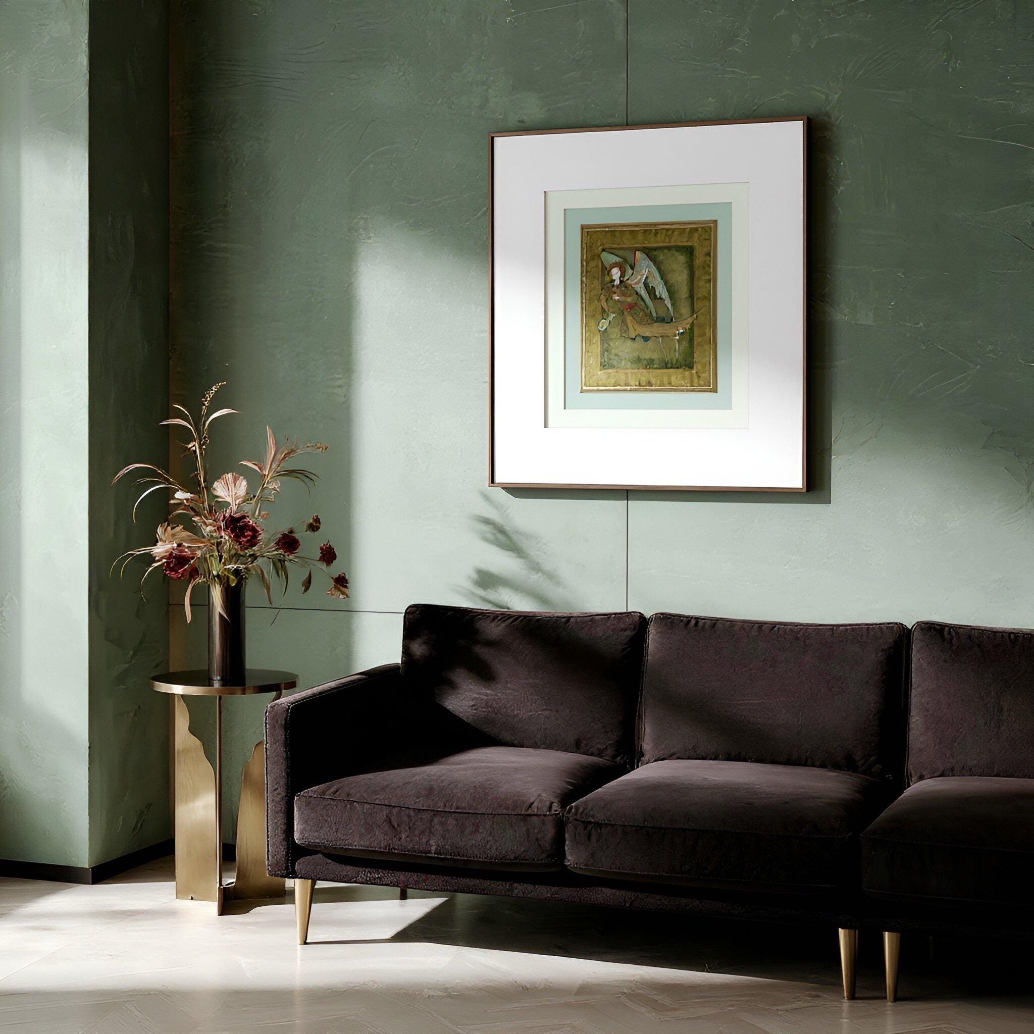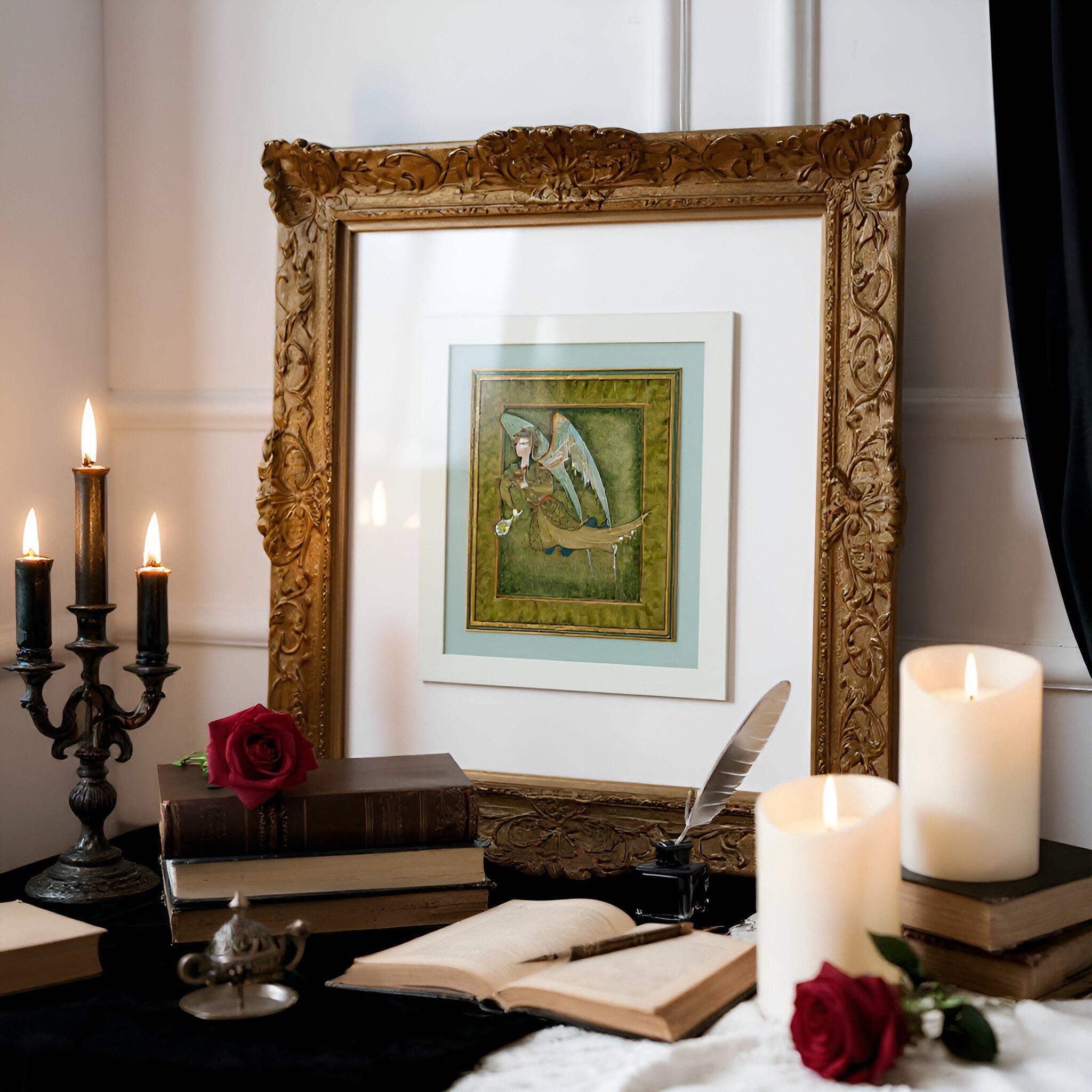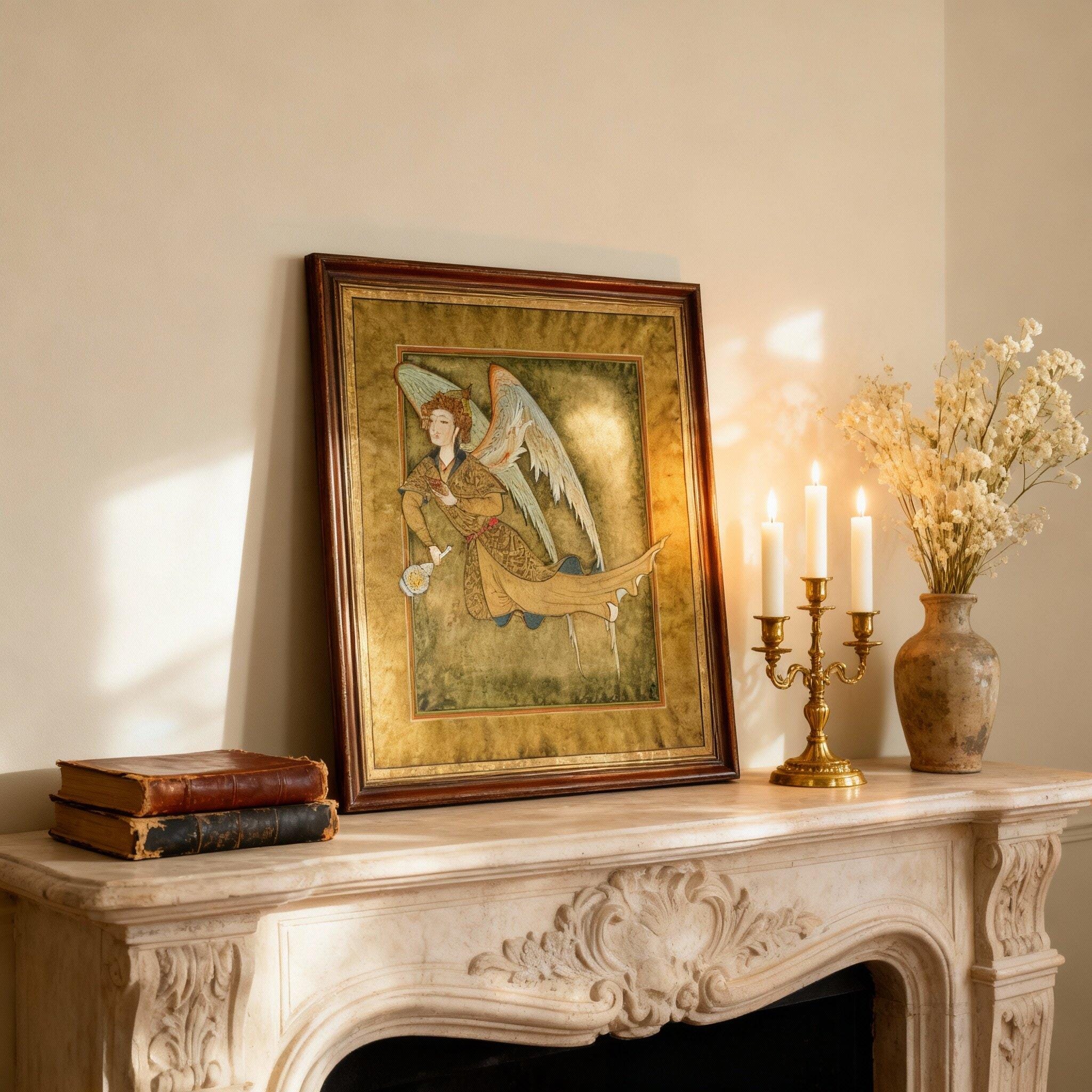 This piece radiates an atmosphere of timeless elegance and spiritual serenity. The delicate lines, flowing garments, and gentle posture of the Peri invite the viewer into a contemplative world inspired by ancient manuscript art, where beauty, symbolism, and sacred meaning exist in perfect harmony.