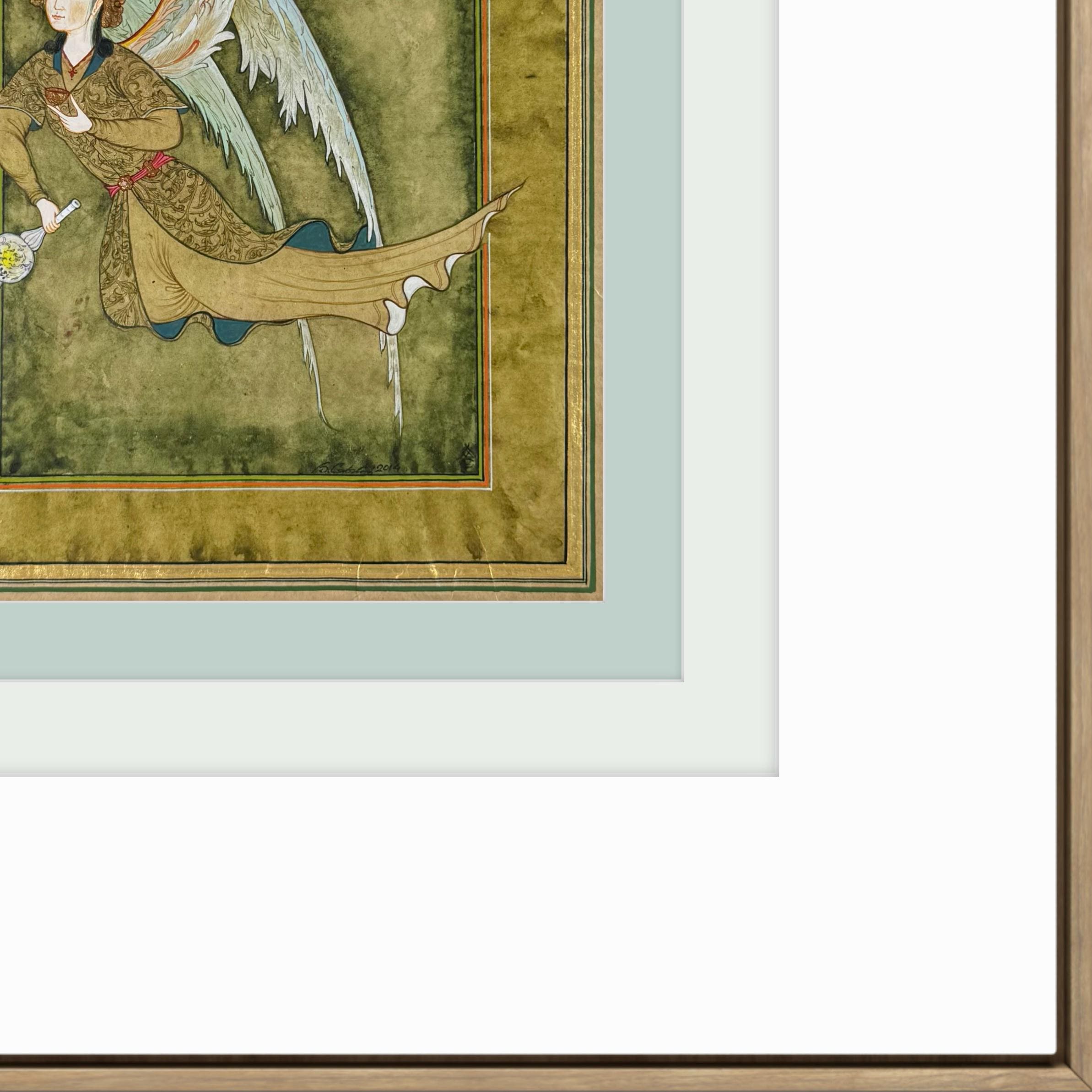 The composition depicts a Peri, a celestial and benevolent being deeply rooted in Islam and Ottoman visual culture. In Ottoman miniature tradition, Peris symbolize purity, grace, spiritual protection, and divine presence. The flask held by the Peri is a symbolic vessel, often interpreted as a sign of healing essence, sacred knowledge, or divine sustenance, reinforcing the spiritual nature of the figure.