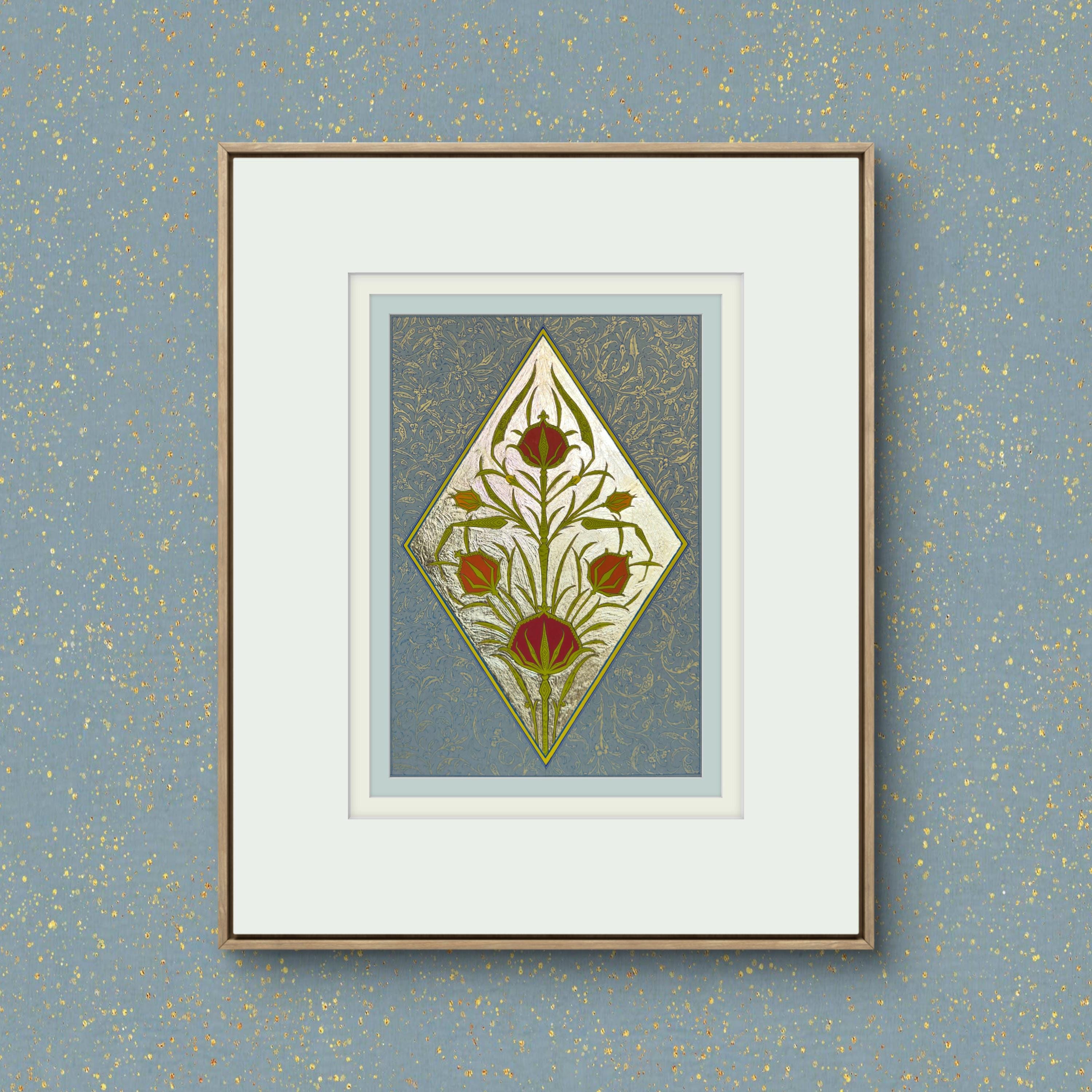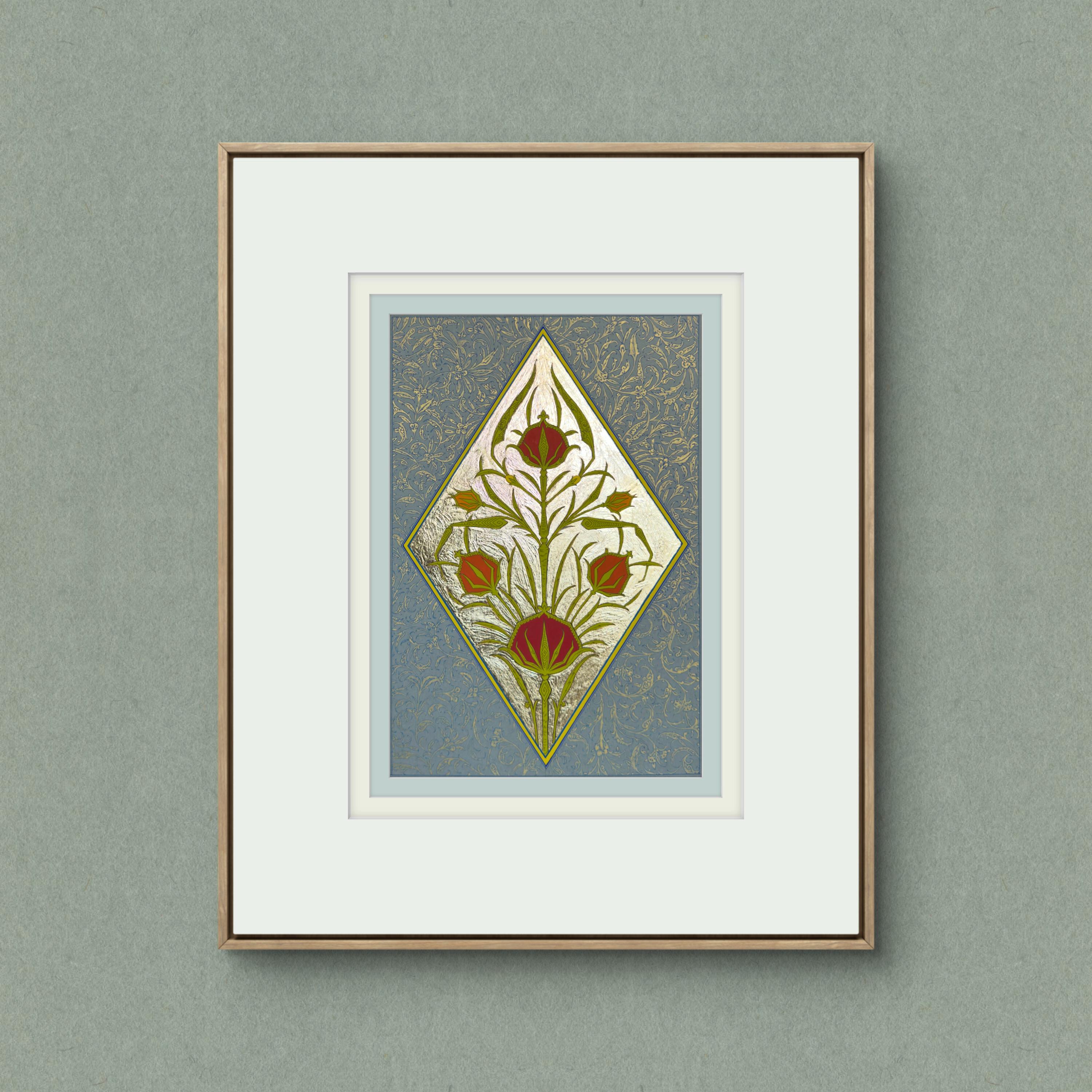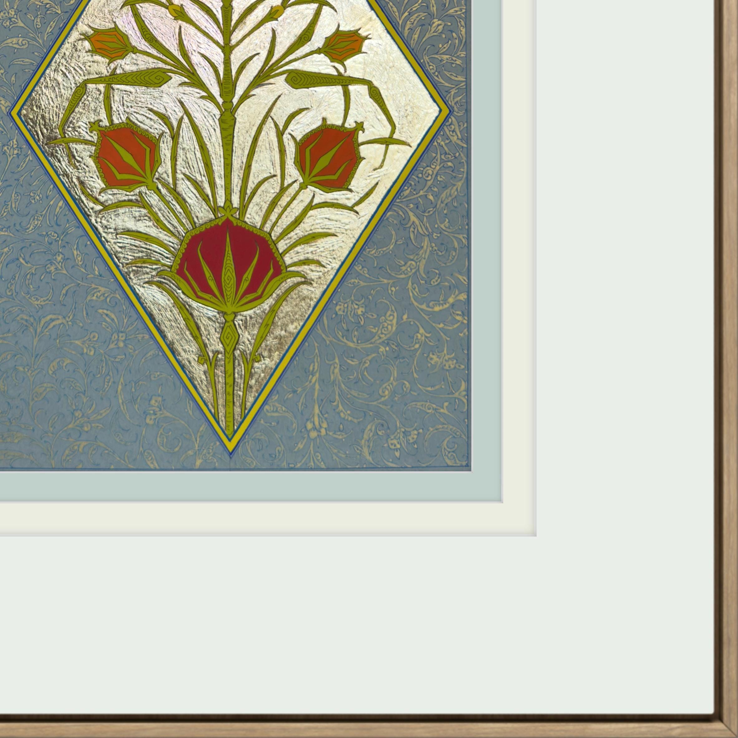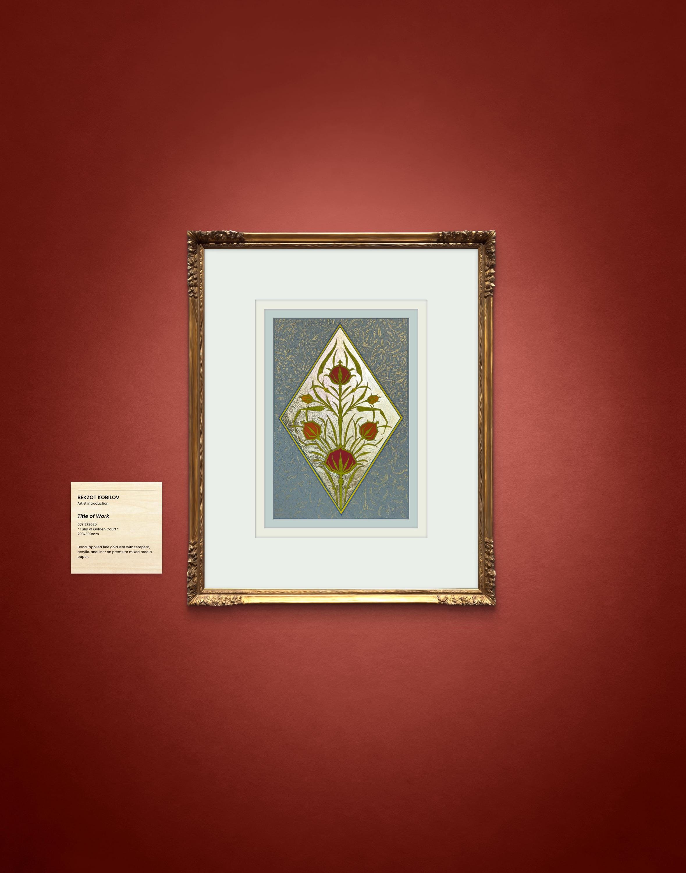 Tulip of the Golden Court is a hand-painted illumination inspired by the refined floral ornament of the Ottoman court. The composition centers on the timeless tulip motif—an emblem of elegance and nobility—rendered with luminous fine gold leaf and delicate botanical detailing. Drawing inspiration from historical manuscript traditions, this piece combines classical ornament with meticulous craftsmanship, creating a work that reflects the grace and sophistication of imperial decorative art.