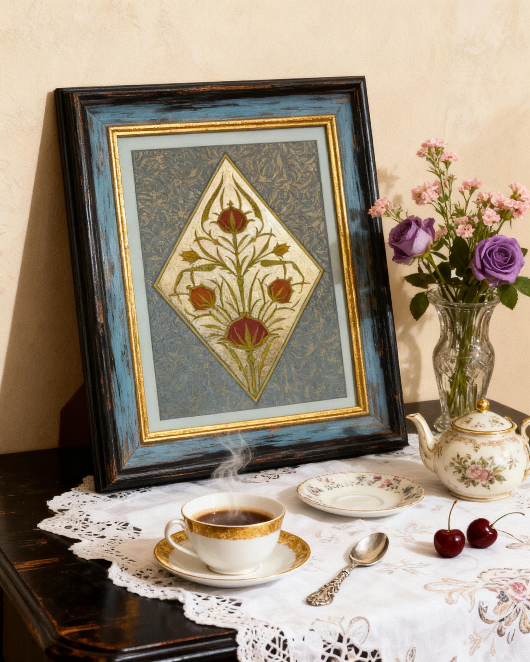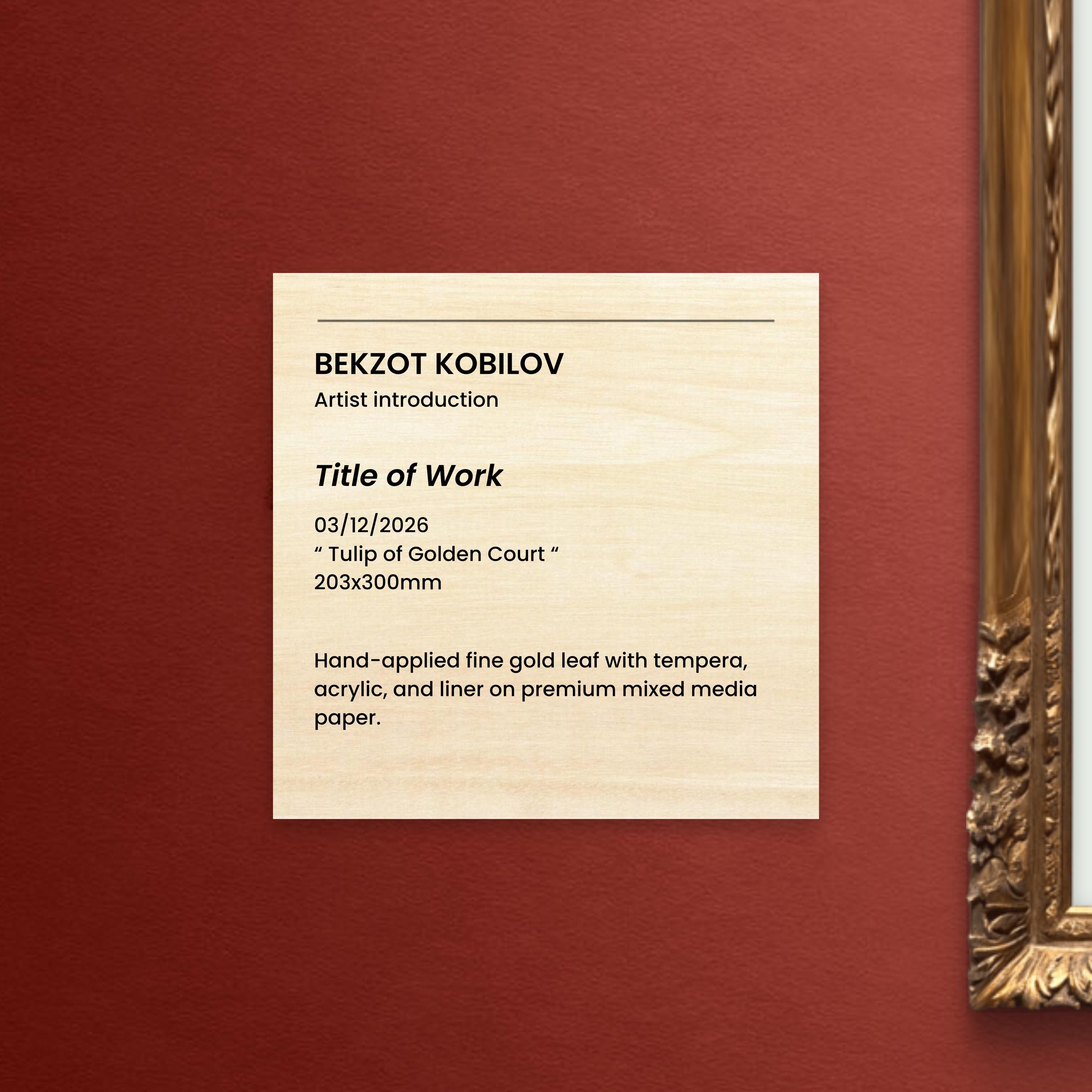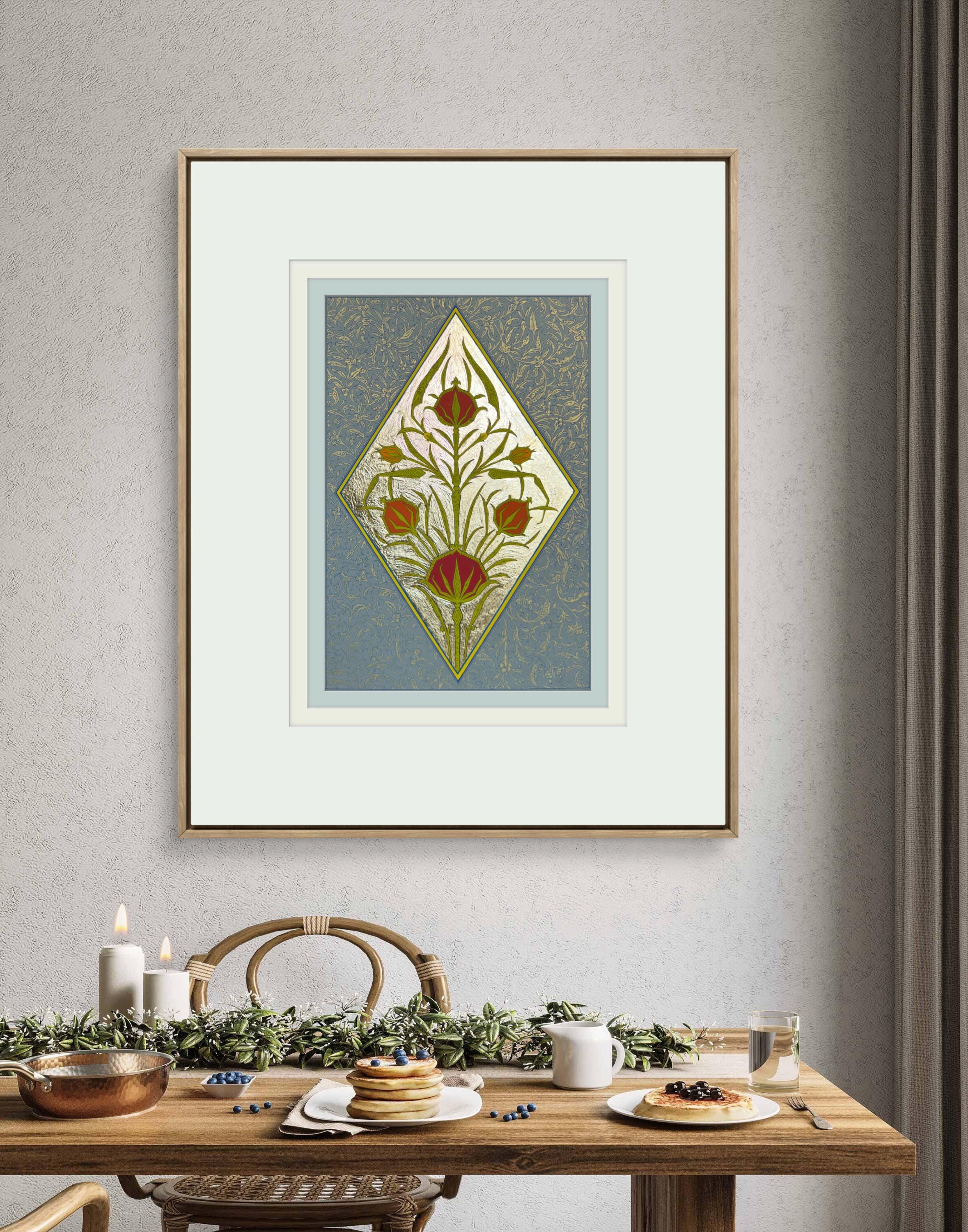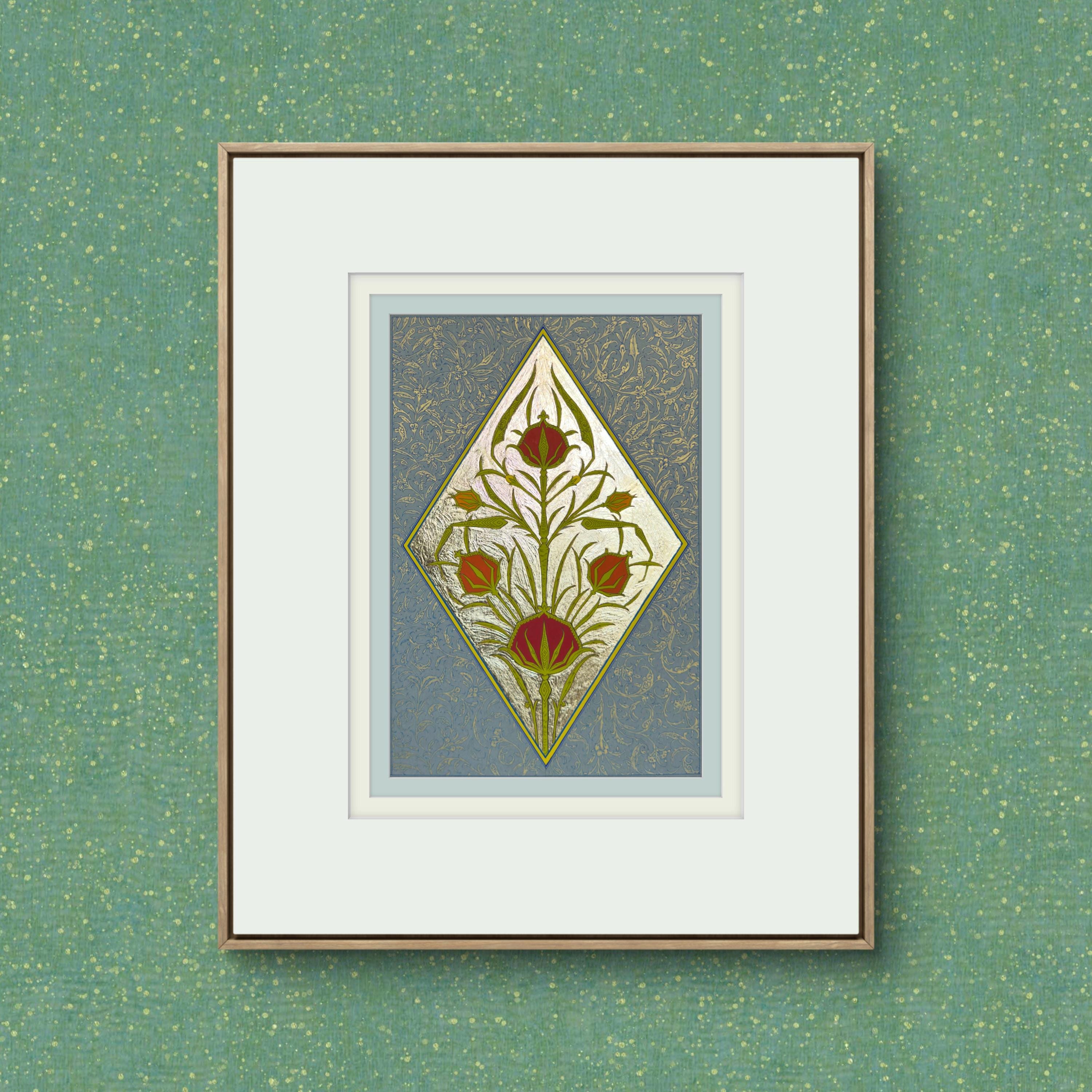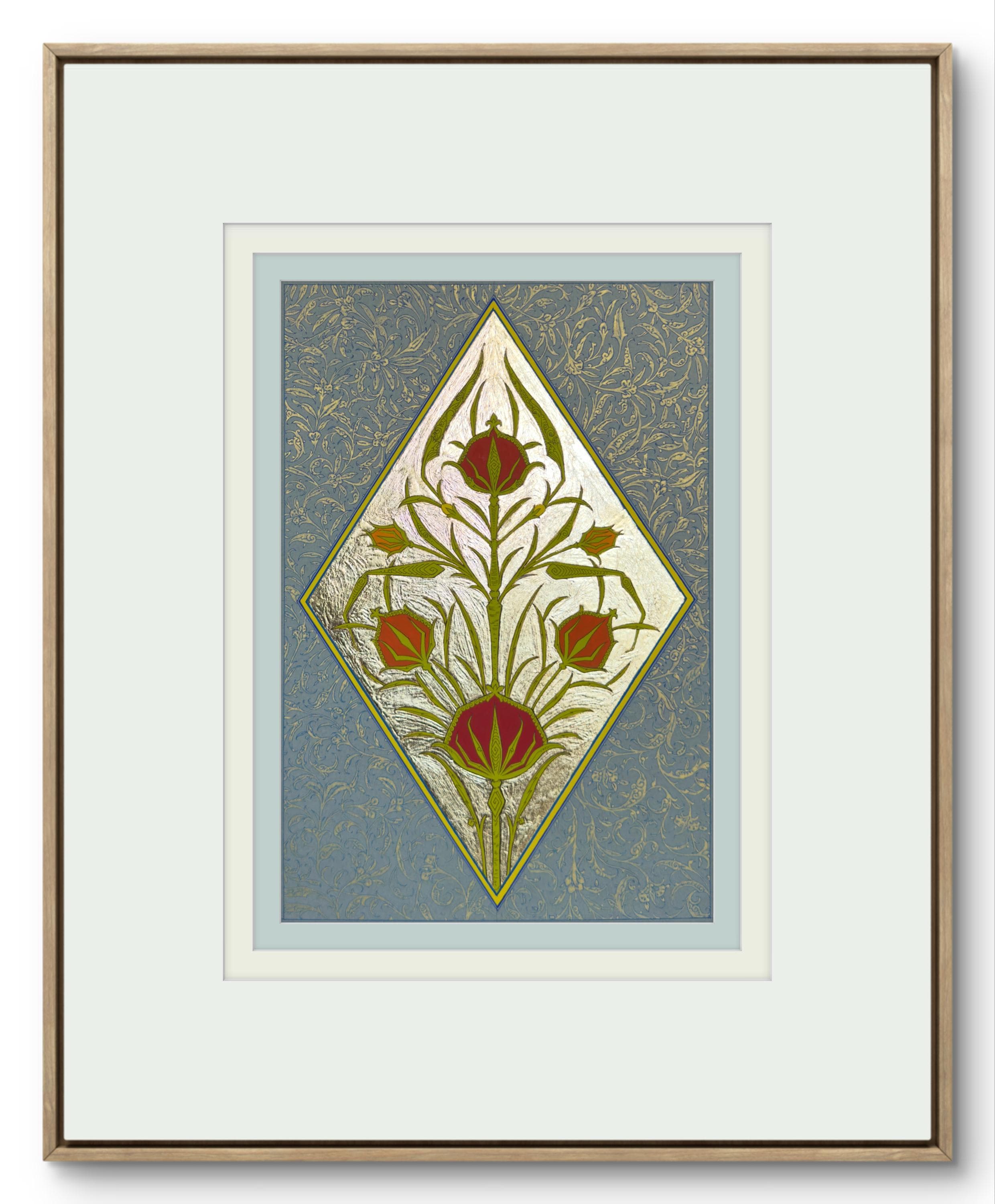 Tulip of the Golden Court is a hand-painted illumination inspired by the refined floral ornament of the Ottoman court. The composition centers on the timeless tulip motif—an emblem of elegance and nobility—rendered with luminous fine gold leaf and delicate botanical detailing. Drawing inspiration from historical manuscript traditions, this piece combines classical ornament with meticulous craftsmanship, creating a work that reflects the grace and sophistication of imperial decorative art.